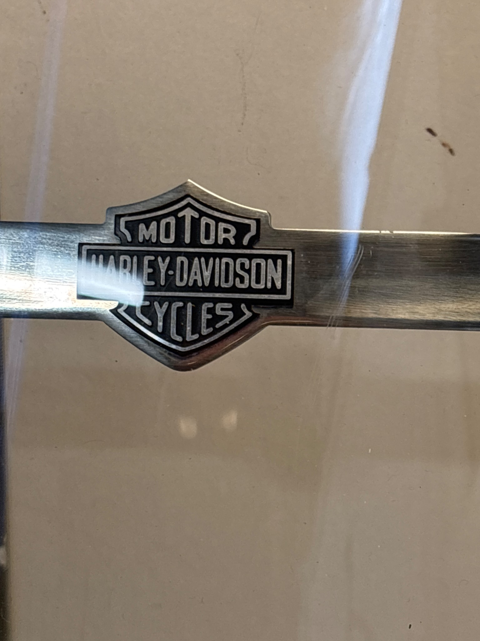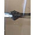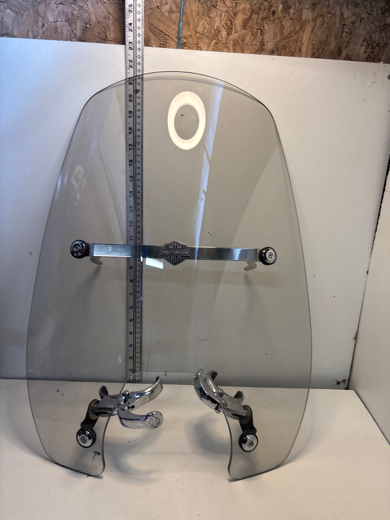 Harley-Davidson windshield with mounting brackets in used condition. Clear shield with metal trim featuring Harley-Davidson logo.