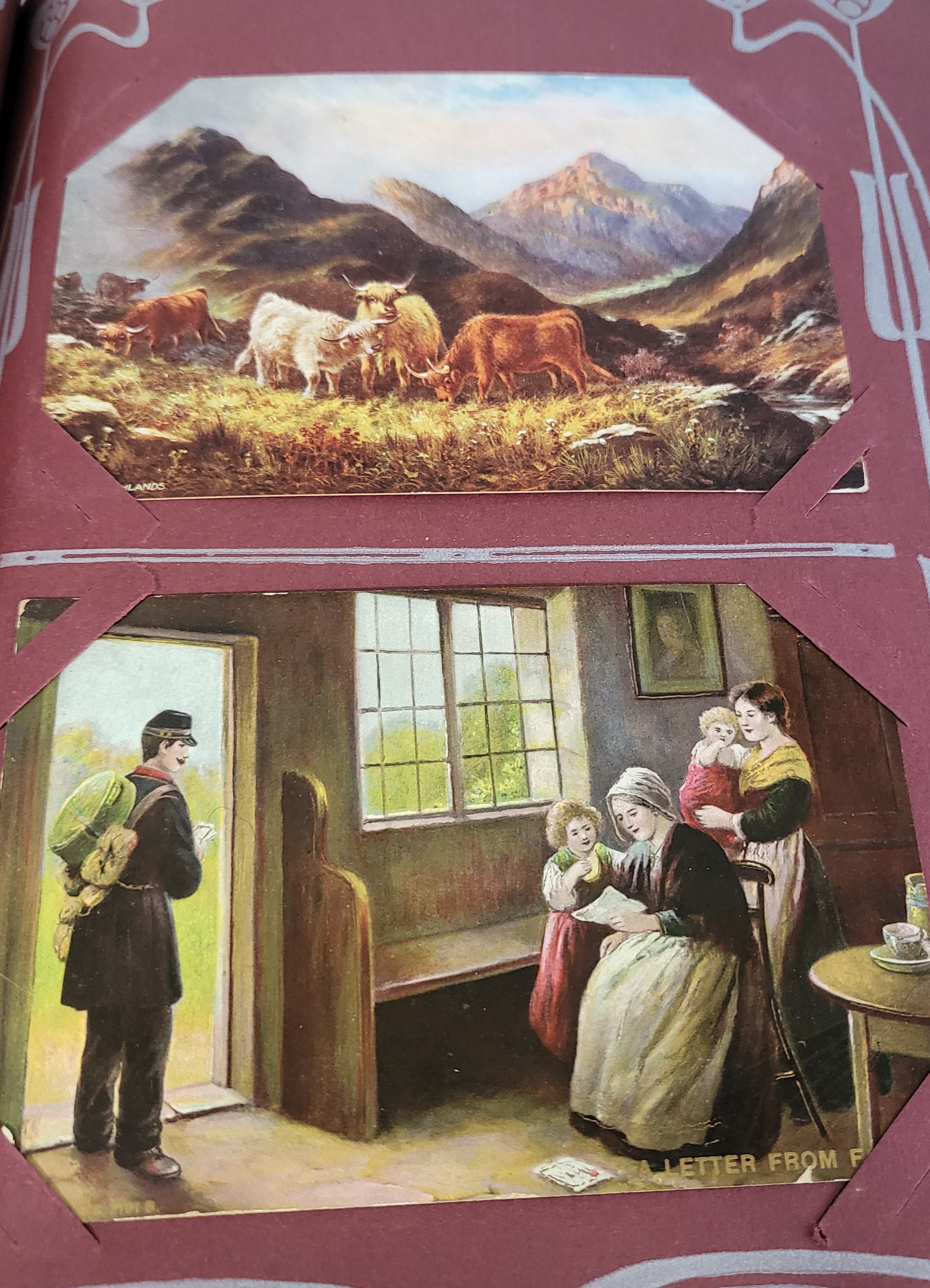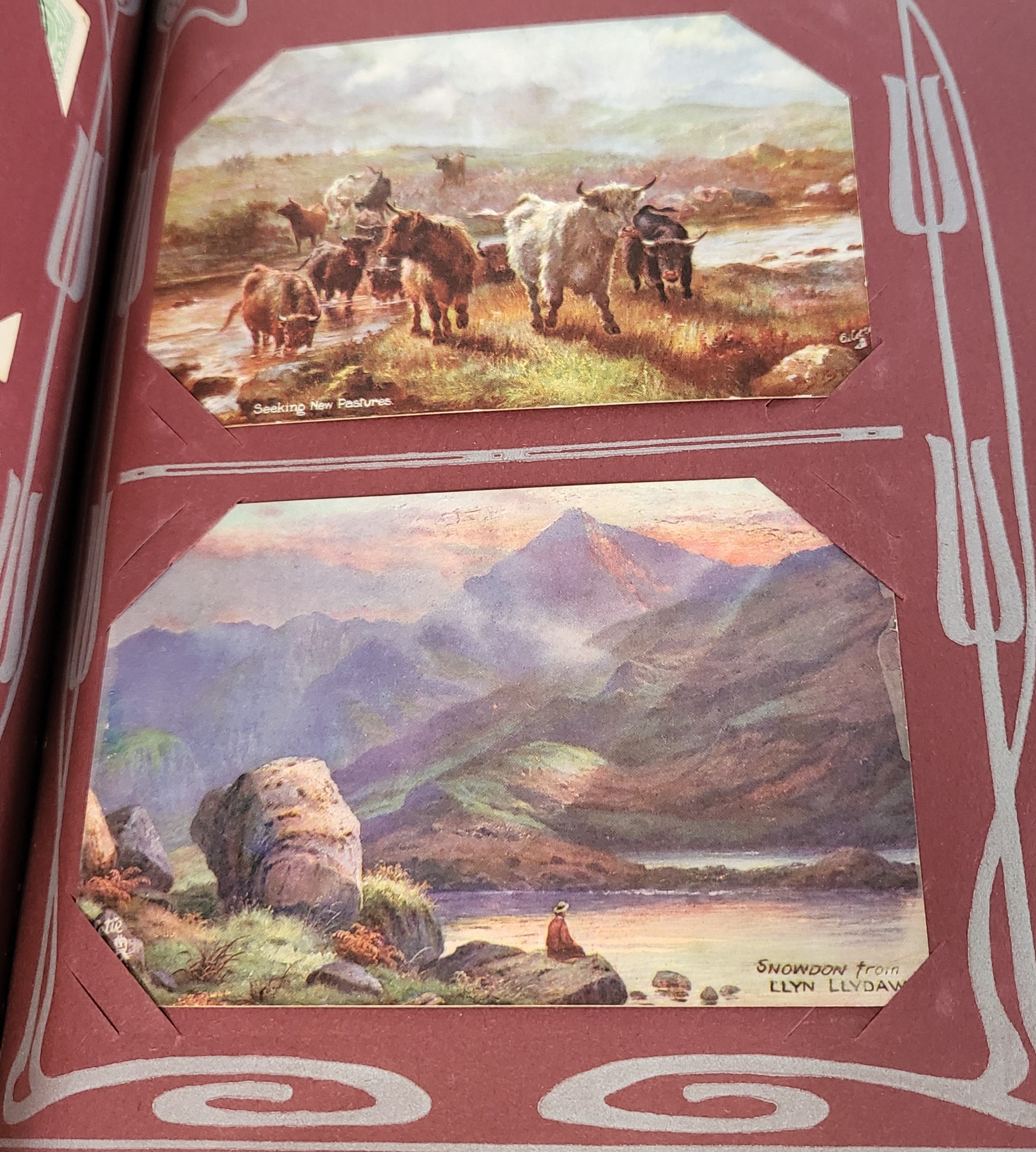 An Art Nouveau leather bound postcard album containing approx. 230 postcards from the 1920's era.