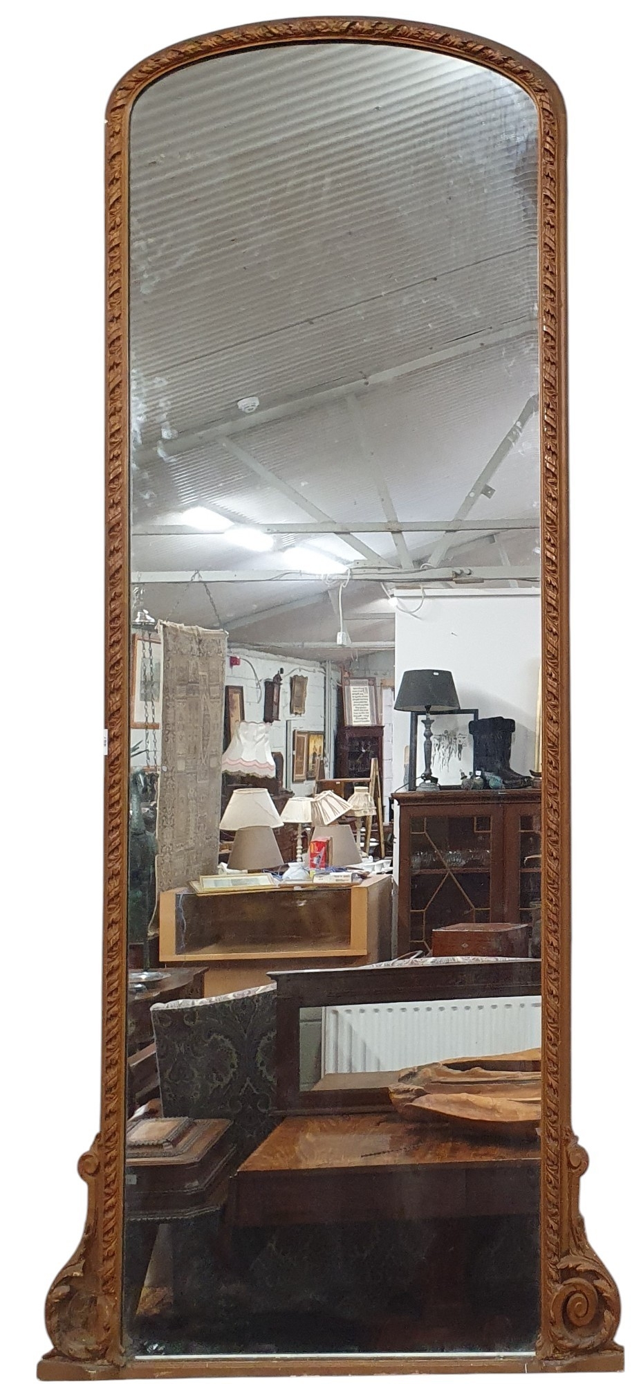 A superb 19th Century Timber and Plaster Gilt pier Mirror with arch top and leaf moulded decoration.