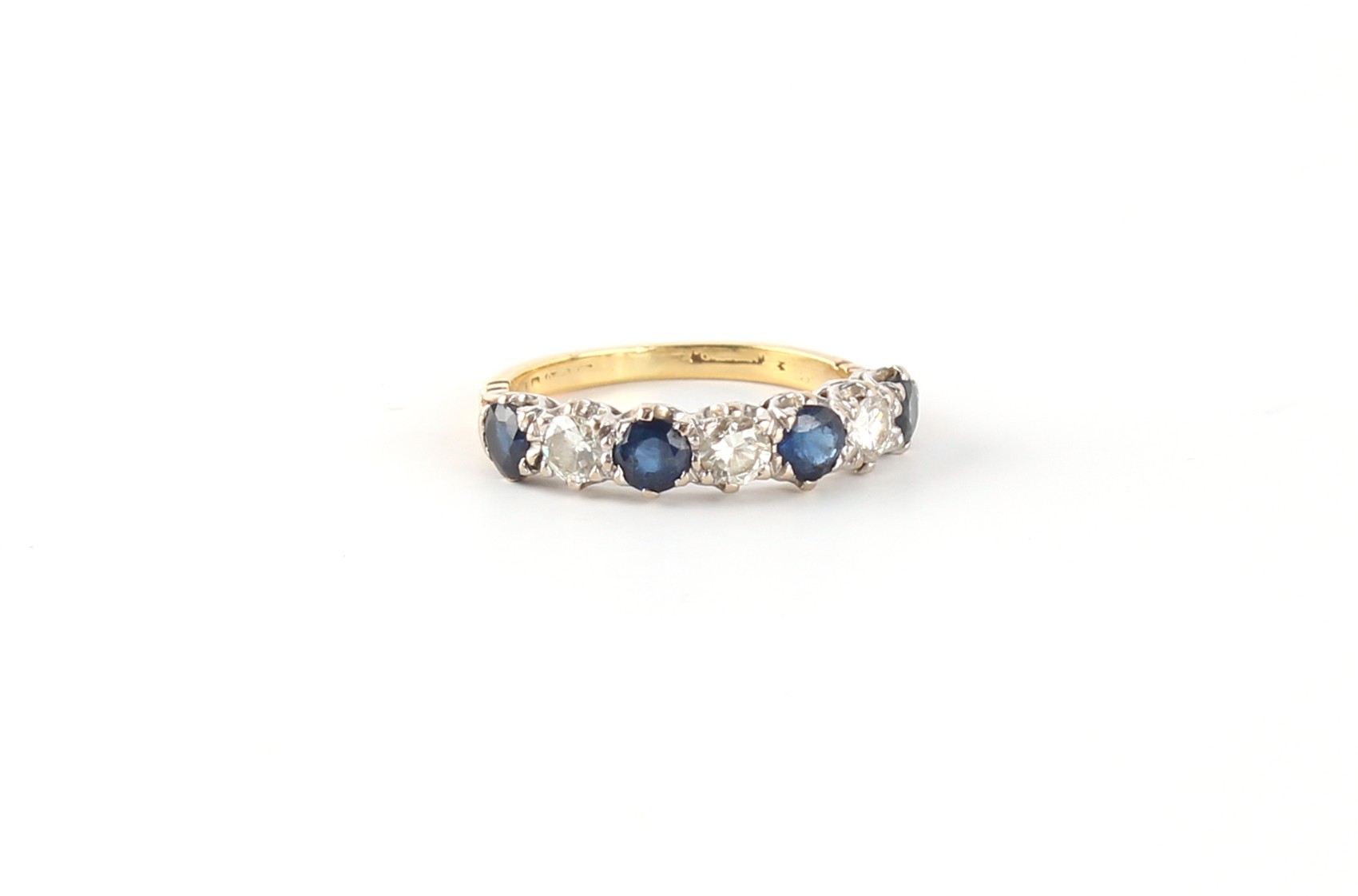Property of a gentleman - an 18ct yellow gold sapphire & diamond seven stone ring, the three round brilliant cut diamonds weighing a total of approximately 0.45 carat, size N.