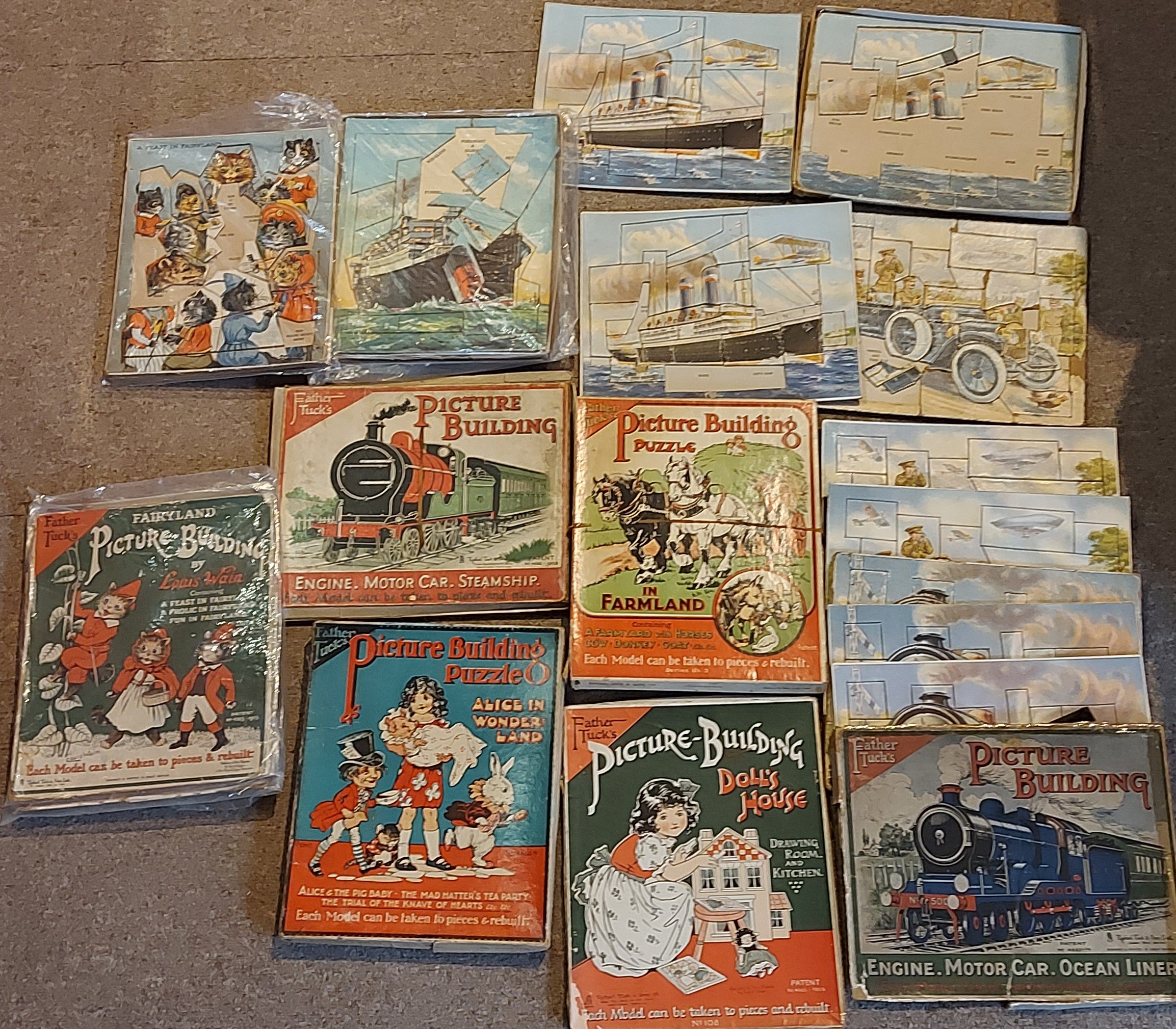 Raphael Tuck and Sons Father Tucks Picture Building Dolls House together with another similar In Farmland, two Engine, Motor Car, Ocean Liner, another Alice In Wonderland, another Louis Wain and two others unboxed
