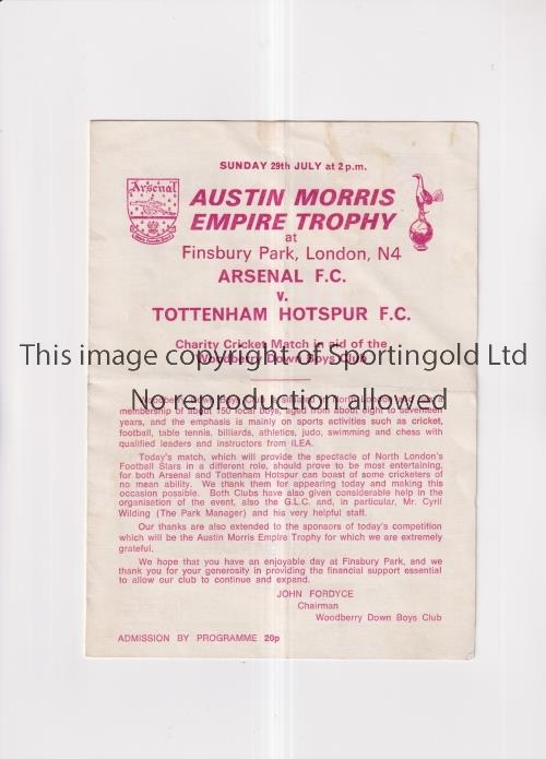 ARSENAL V TOTTENHAM HOTSPUR 1973 CRICKET MATCH Programme for the match at Finsbury Park 29/7/1973, very slightly creased and very slightly marked. Generally good