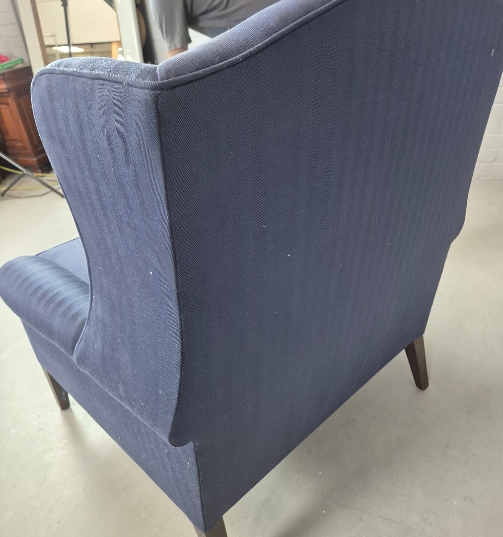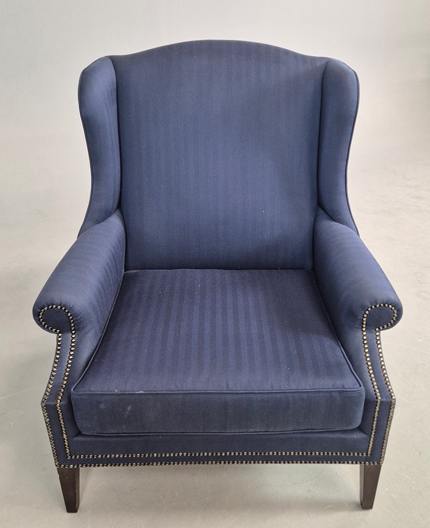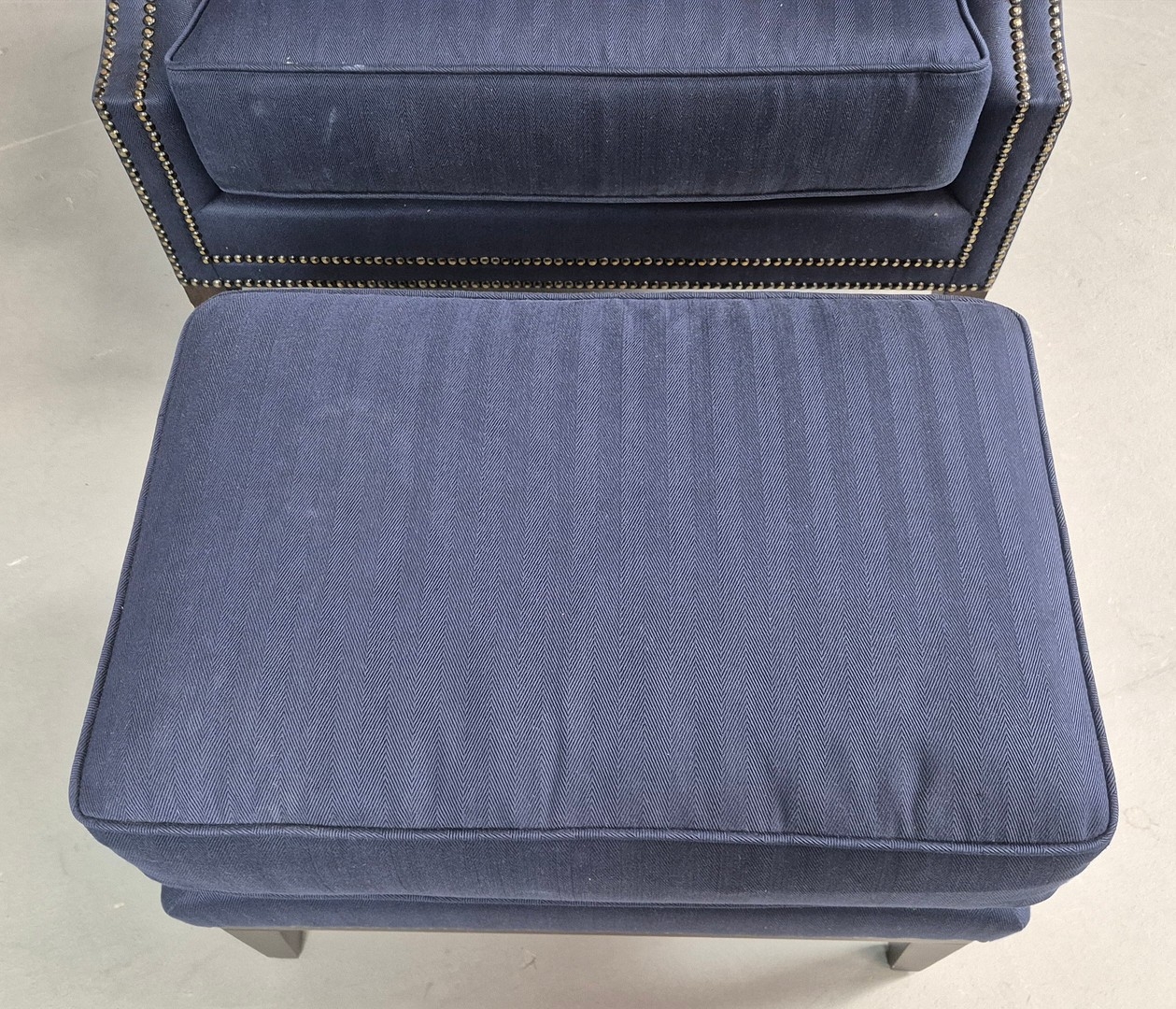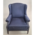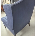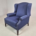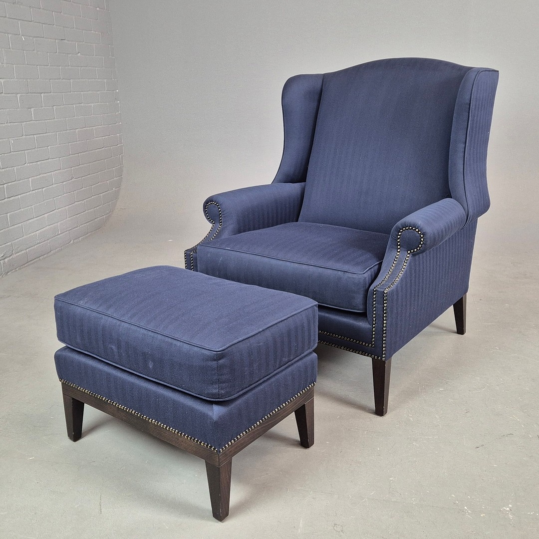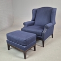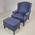 WINGBACK CHAIR AND FOOTSTOOL (2). in blue herringbone fabric 76cm w x 103cm t and a small footstool to match (2).