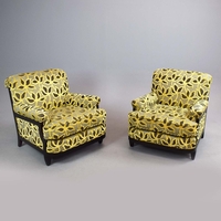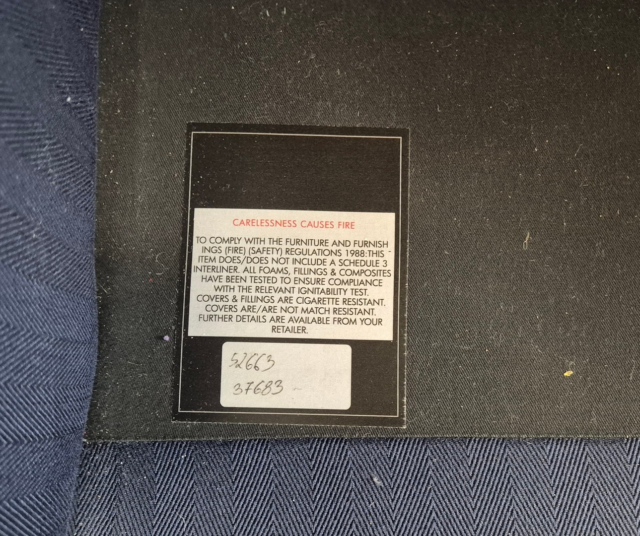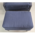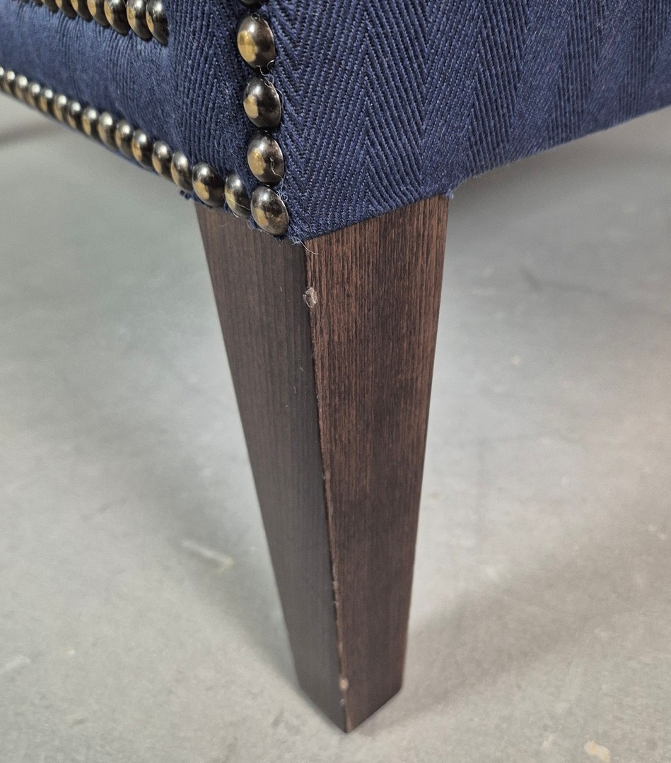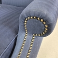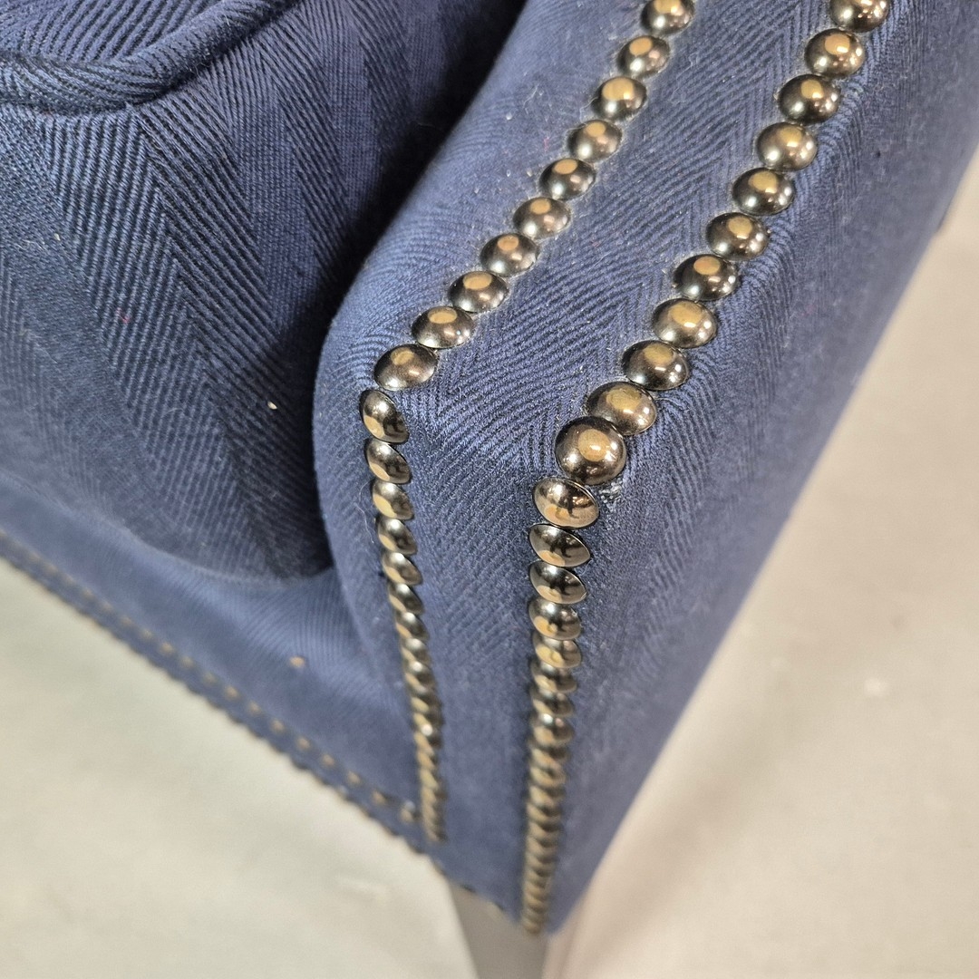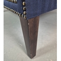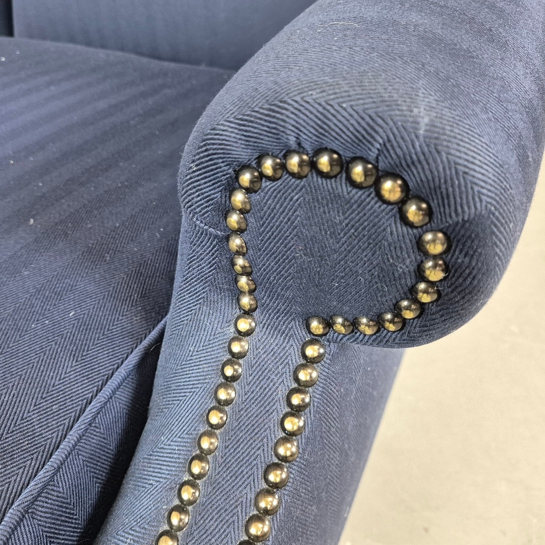 WINGBACK CHAIR AND FOOTSTOOL (2). in blue herringbone fabric 76cm w x 103cm t and a small footstool to match (2).