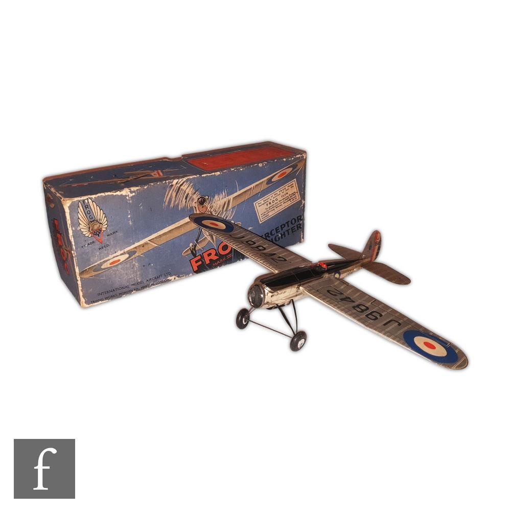 A Triang FROG Mk.IV Interceptor Fighter with RAF markings, black propeller and paper clip on wings and RAF markings, black propeller, with winding accessories, boxed.