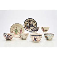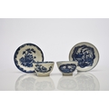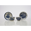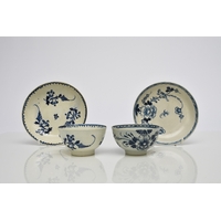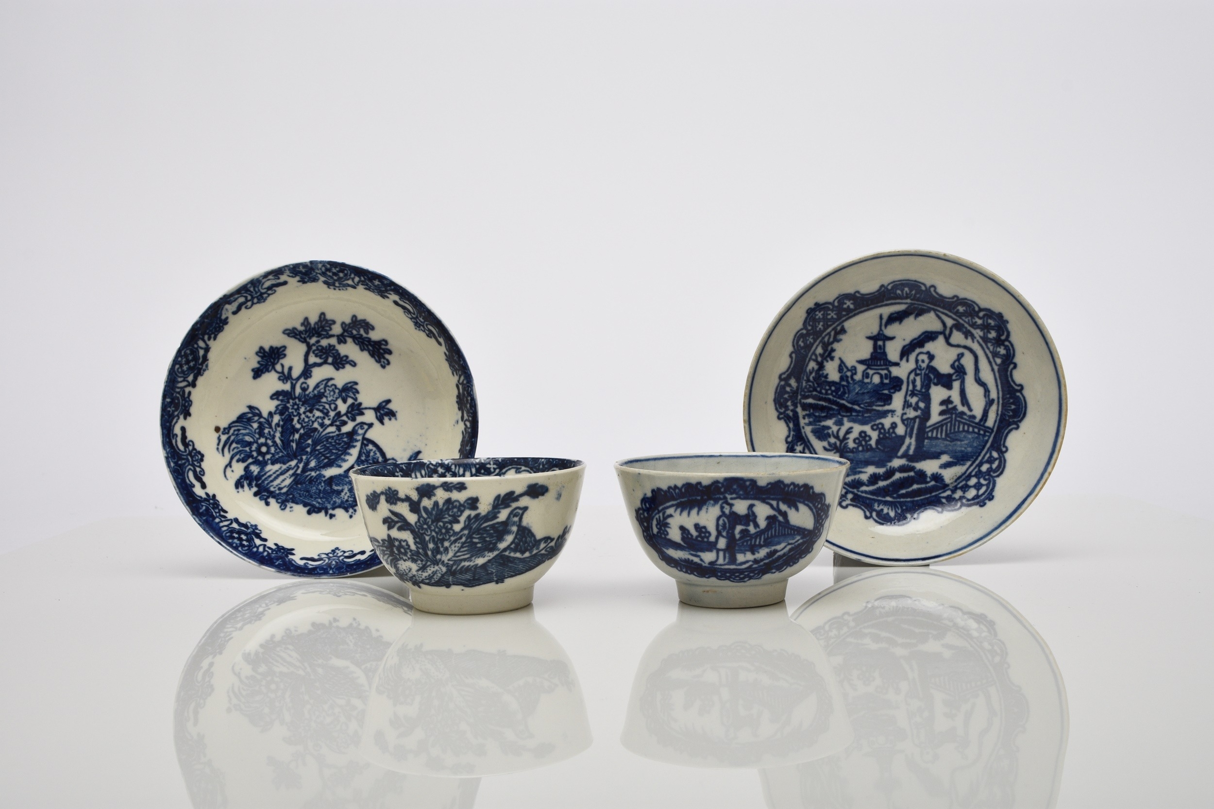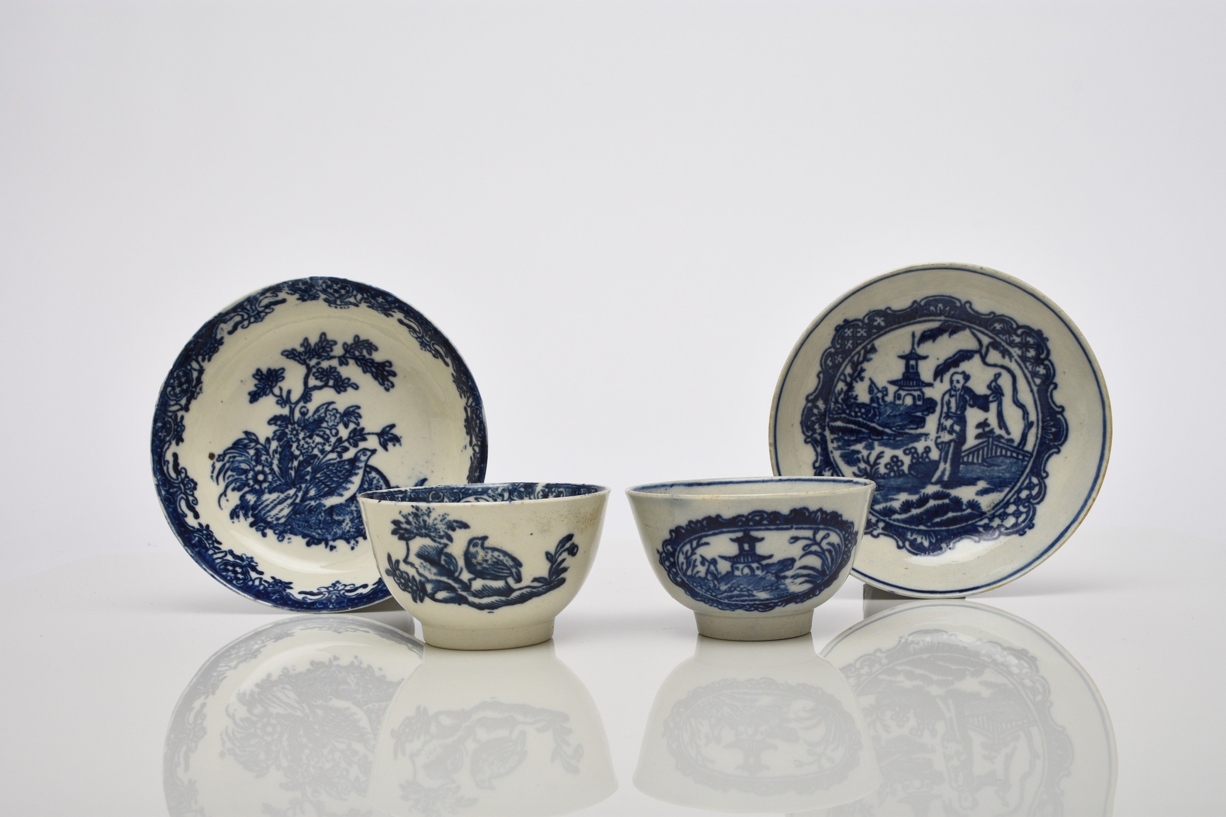 A Seth Pennington and John Part (Liverpool) porcelain 'Two Quail' tea bowl and saucer, circa 1780-90, transfer-printed in underglaze blue, unmarked, saucer 13.2cm diameter; together with a Seth Pennington & John Part (Liverpool) 'Chinese Lady with Bird' tea bowl and saucer, transfer-printed in underglaze blue, circa 1780-90, unmarked, saucer 13cm diameter (4)