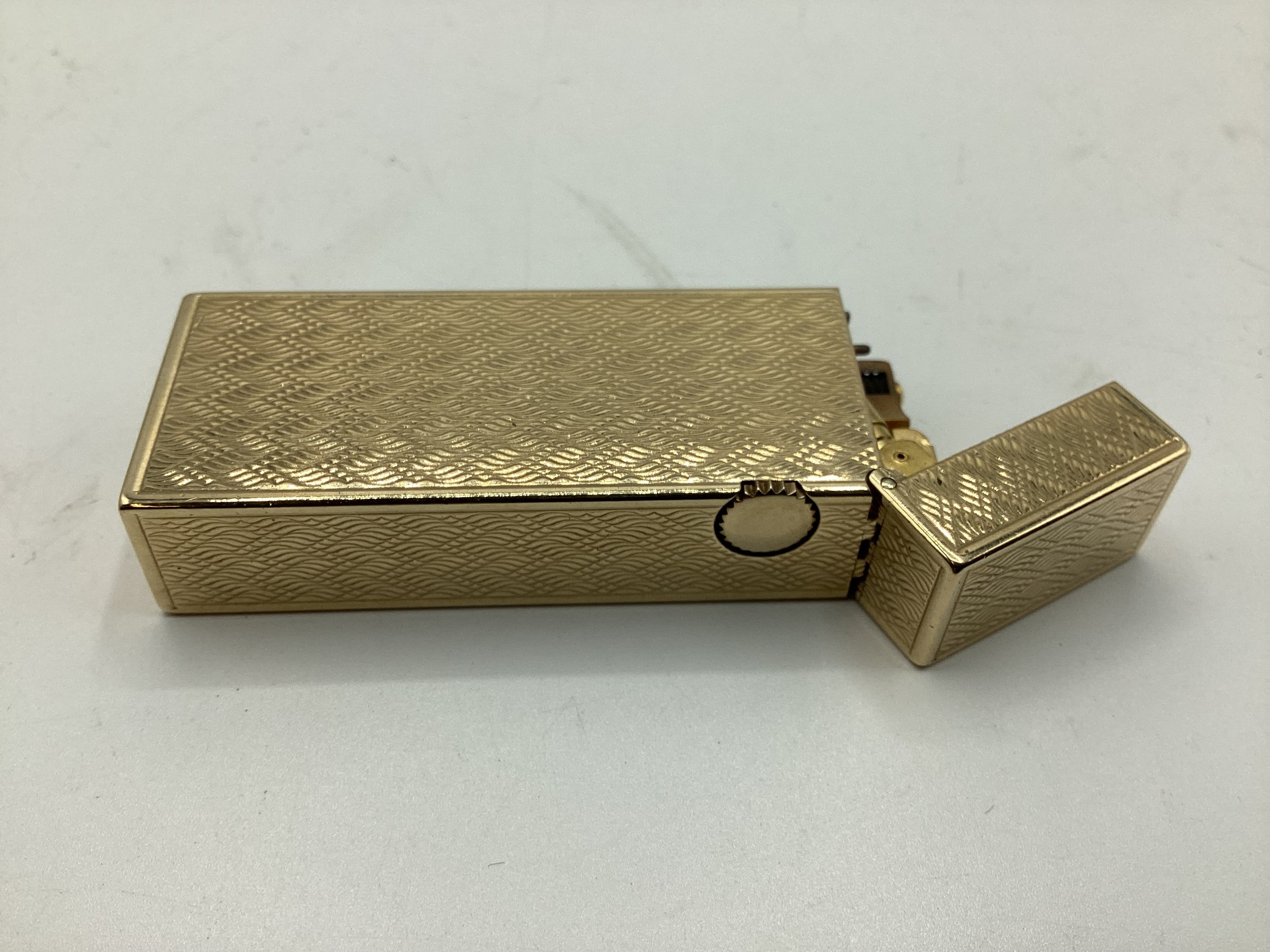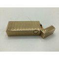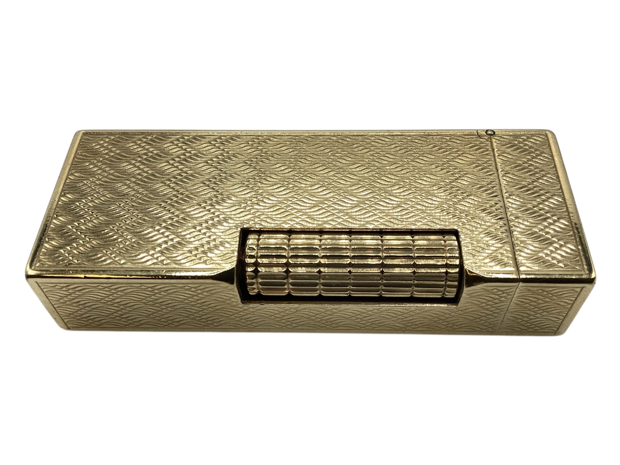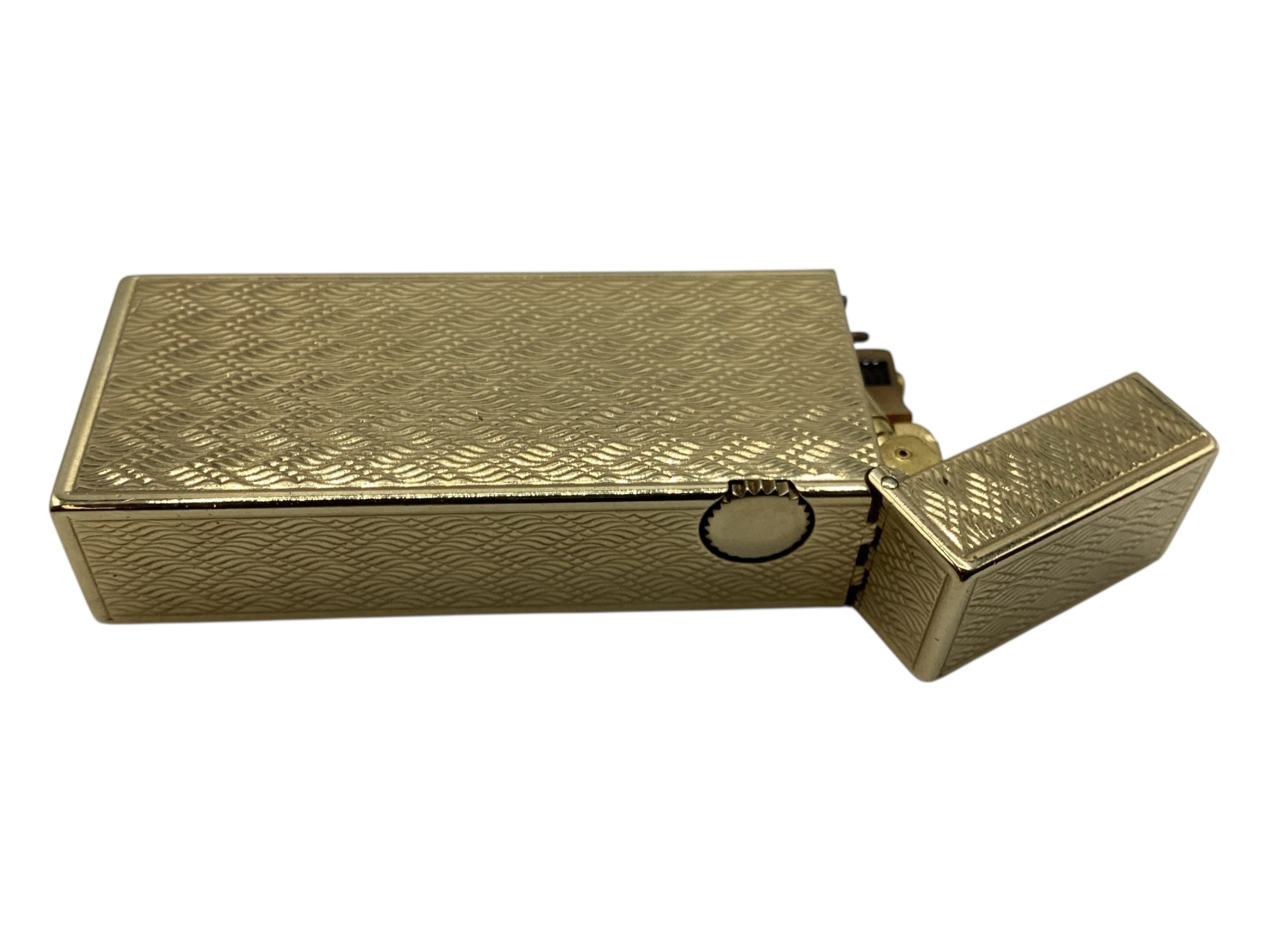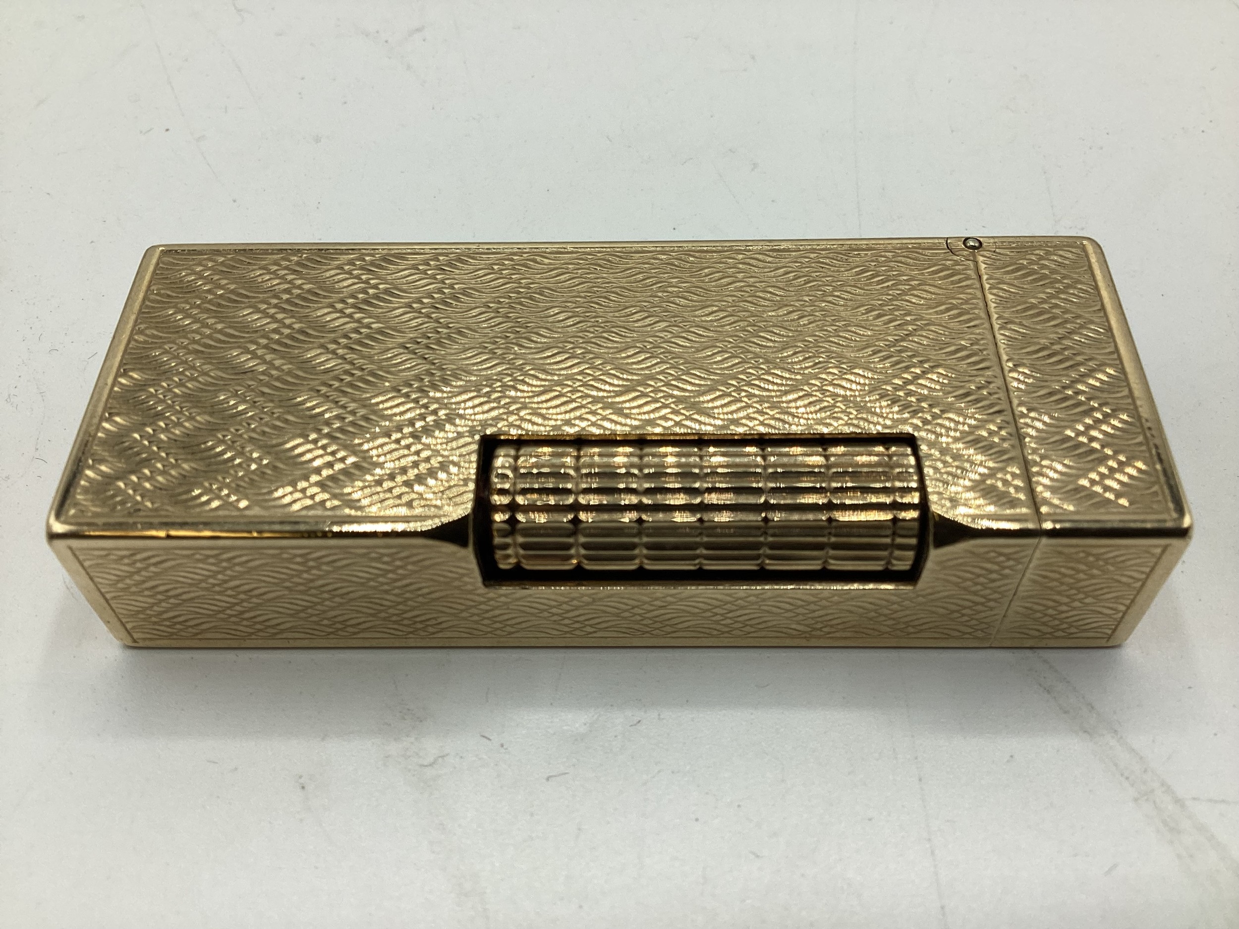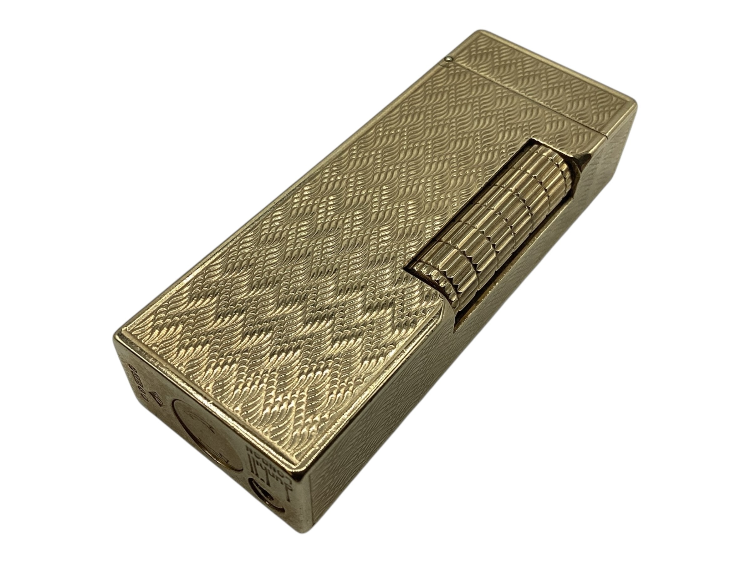 A Dunhill 9ct gold cased Rollagas cigarette lighter with engine turned decoration marked to base Dunhill London, Alfred Dunhill & Sons London 1965. Recently serviced. Gross weight 107 g. 65 mm x 25 mm x 13 mm