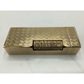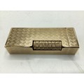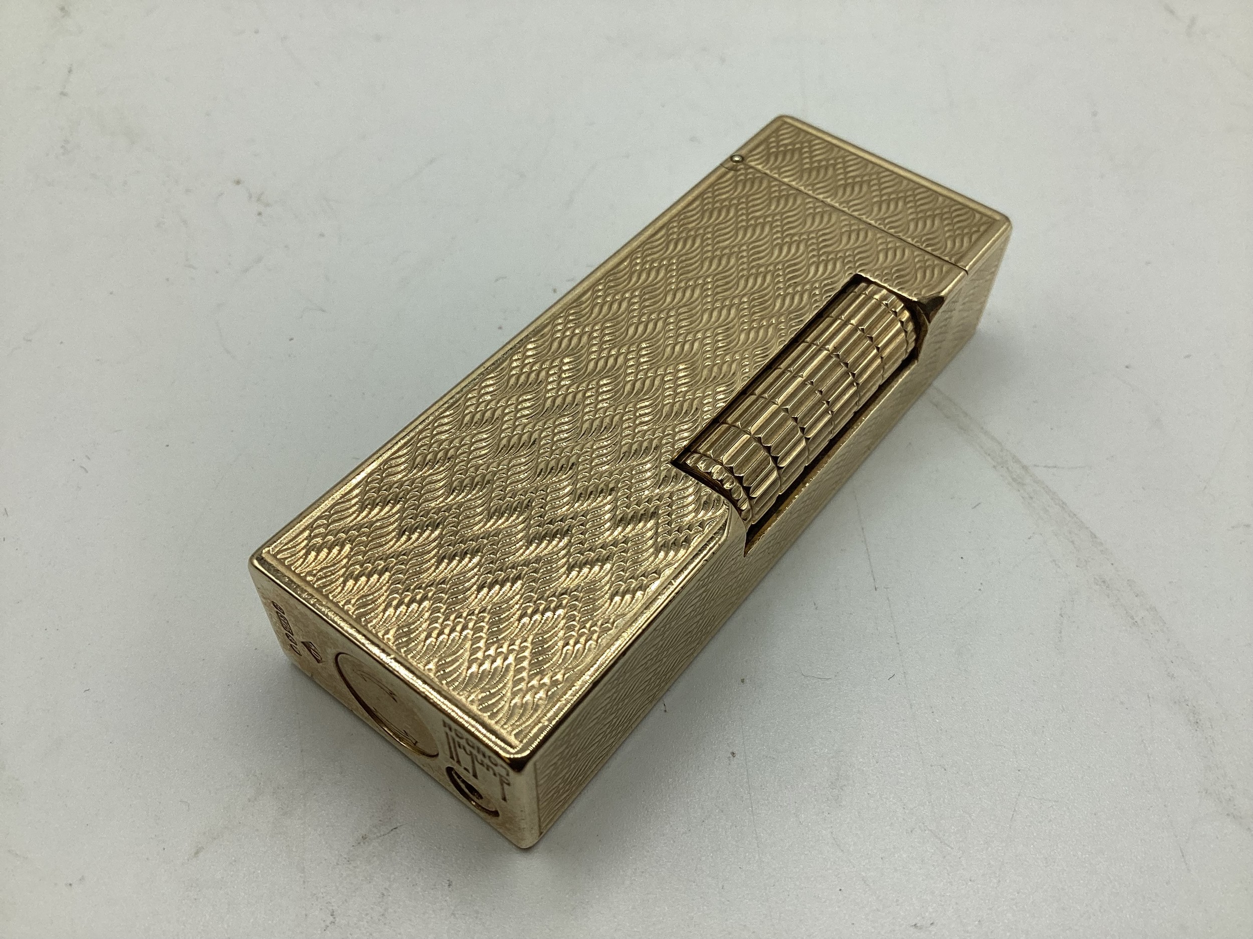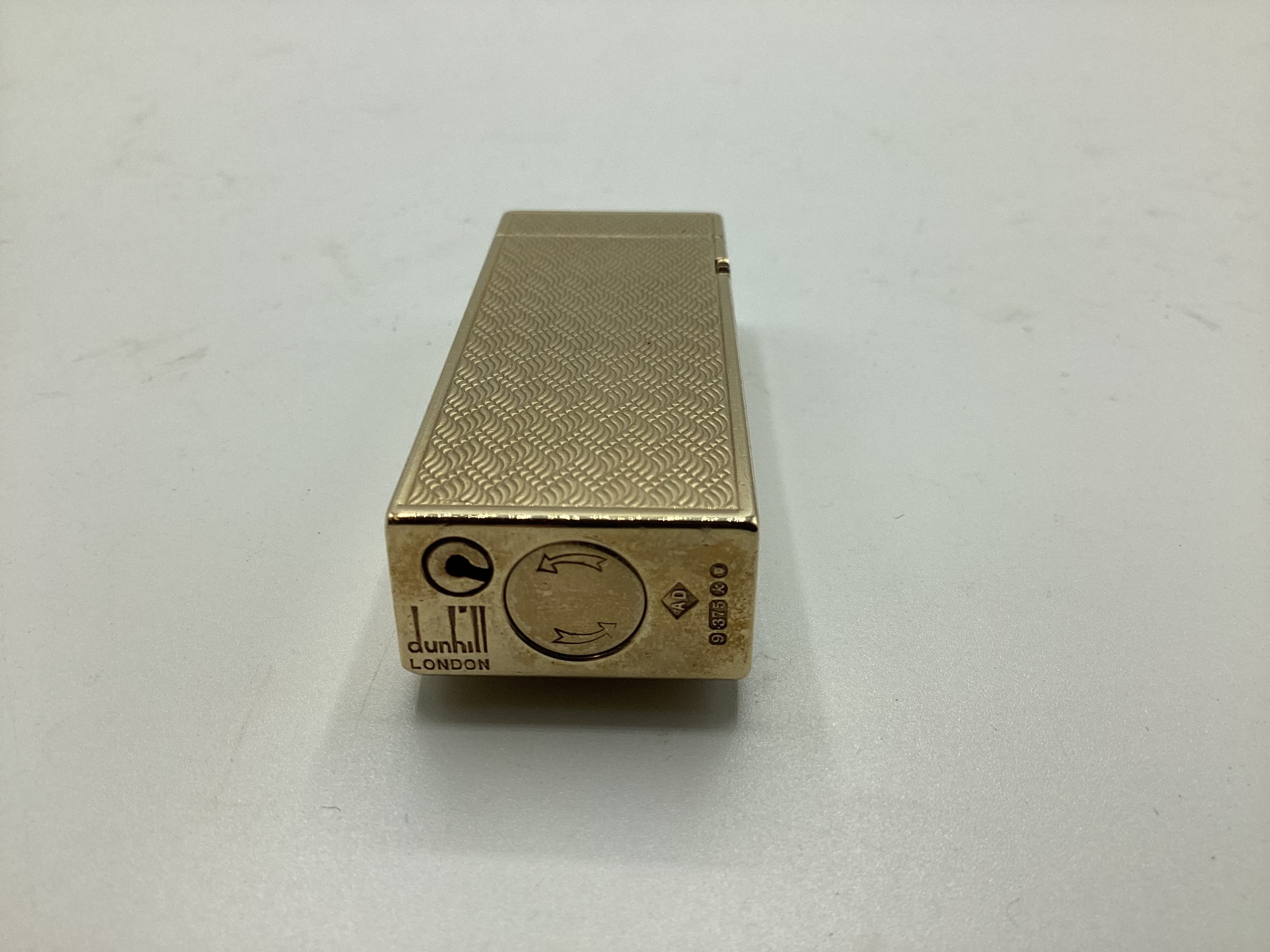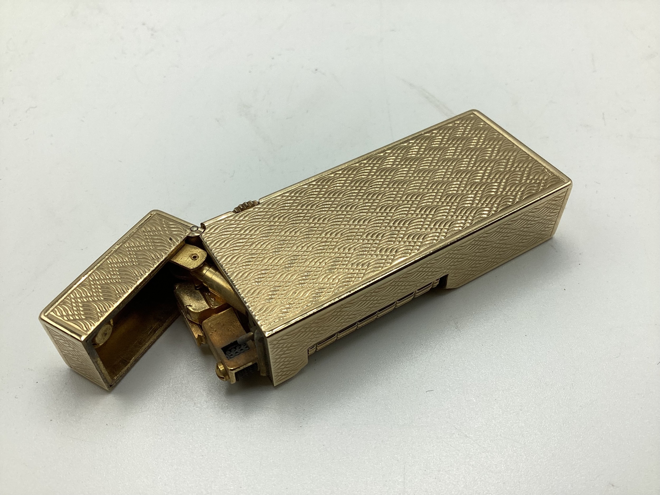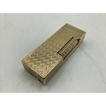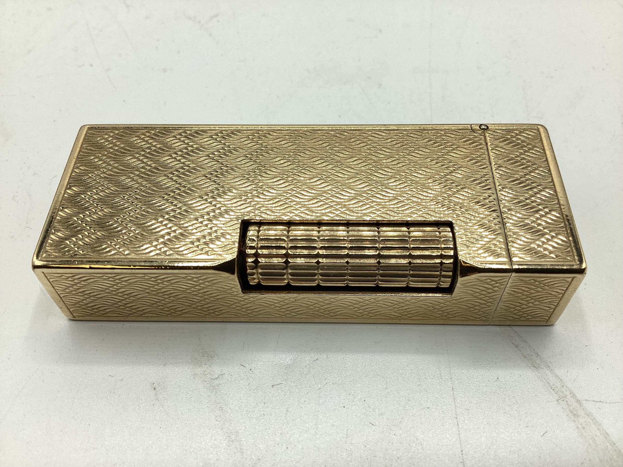 A Dunhill 9ct gold cased Rollagas cigarette lighter with engine turned decoration marked to base Dunhill London, Alfred Dunhill & Sons London 1965. Recently serviced. Gross weight 107 g. 65 mm x 25 mm x 13 mm