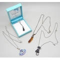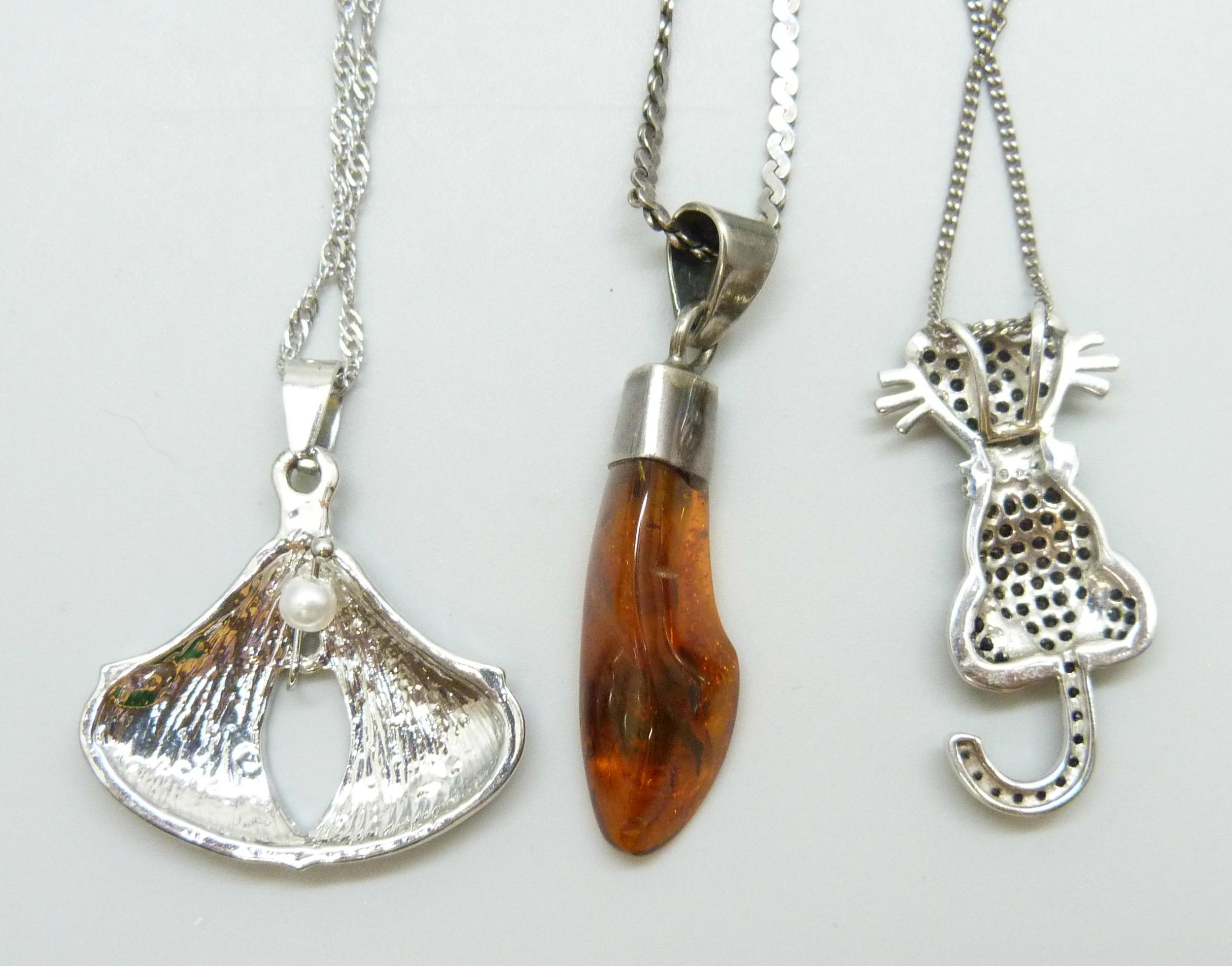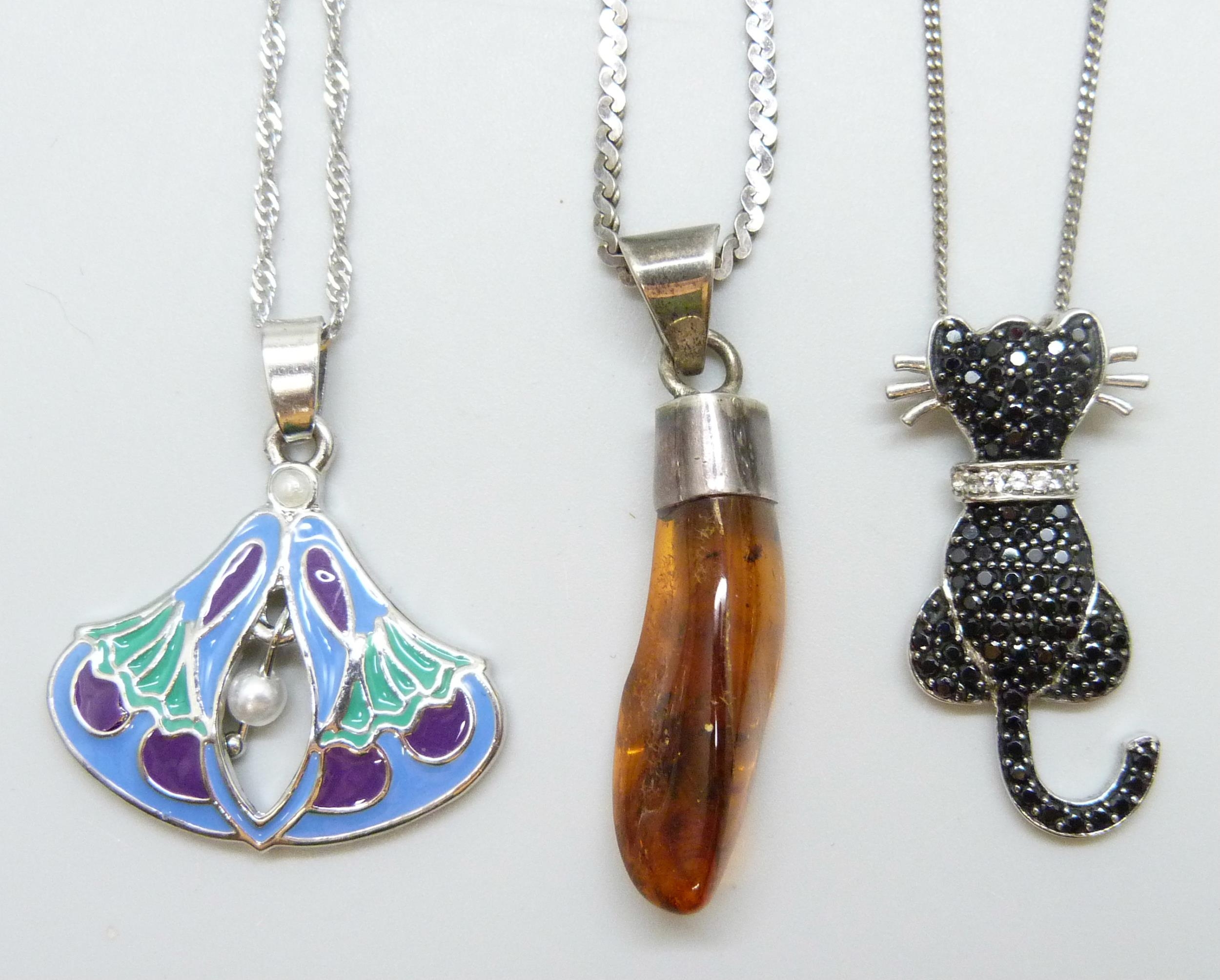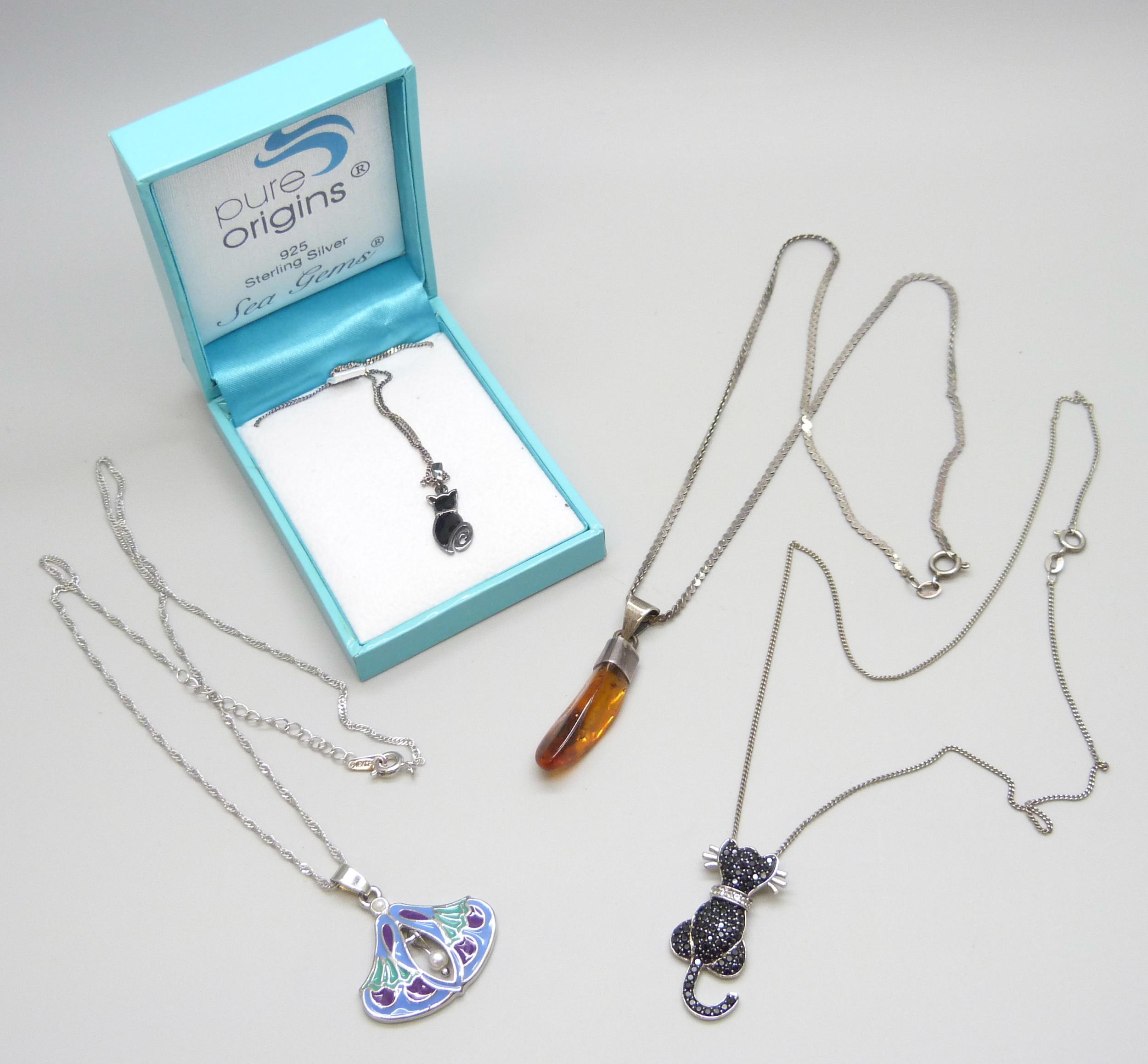 Two silver cat pendants and chains, a silver and amber pendant and an enamel Art Nouveau style pendant