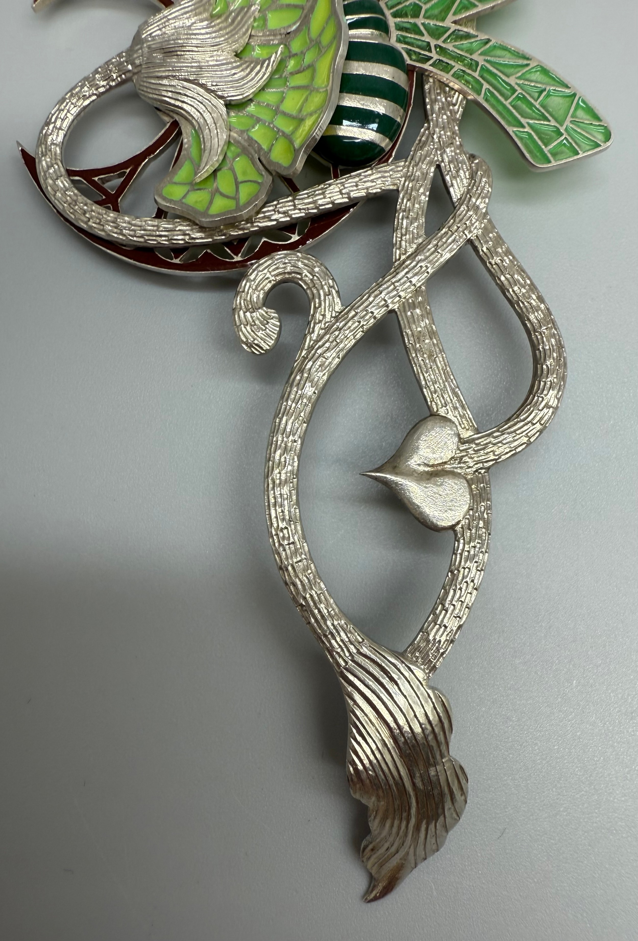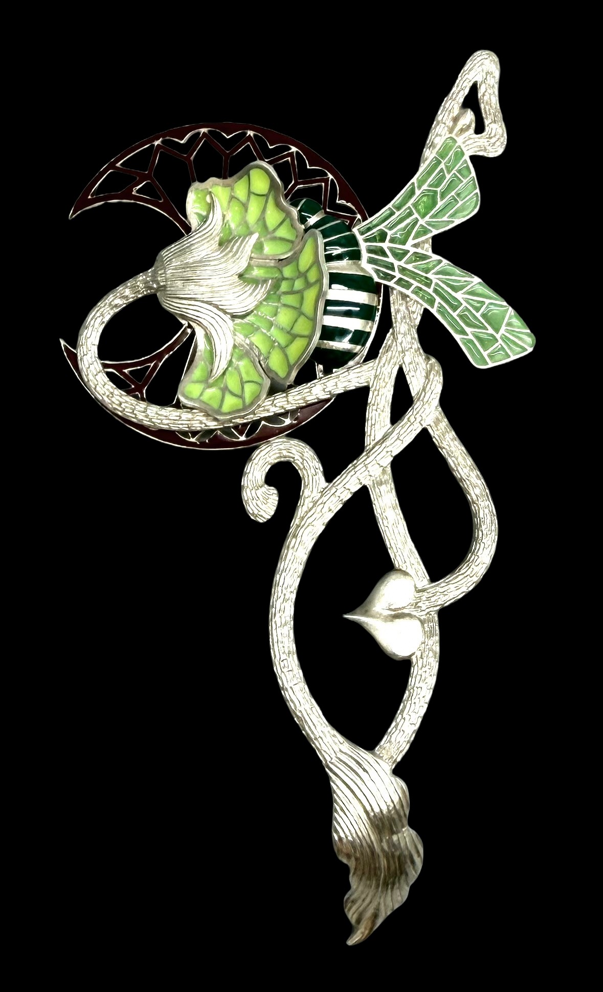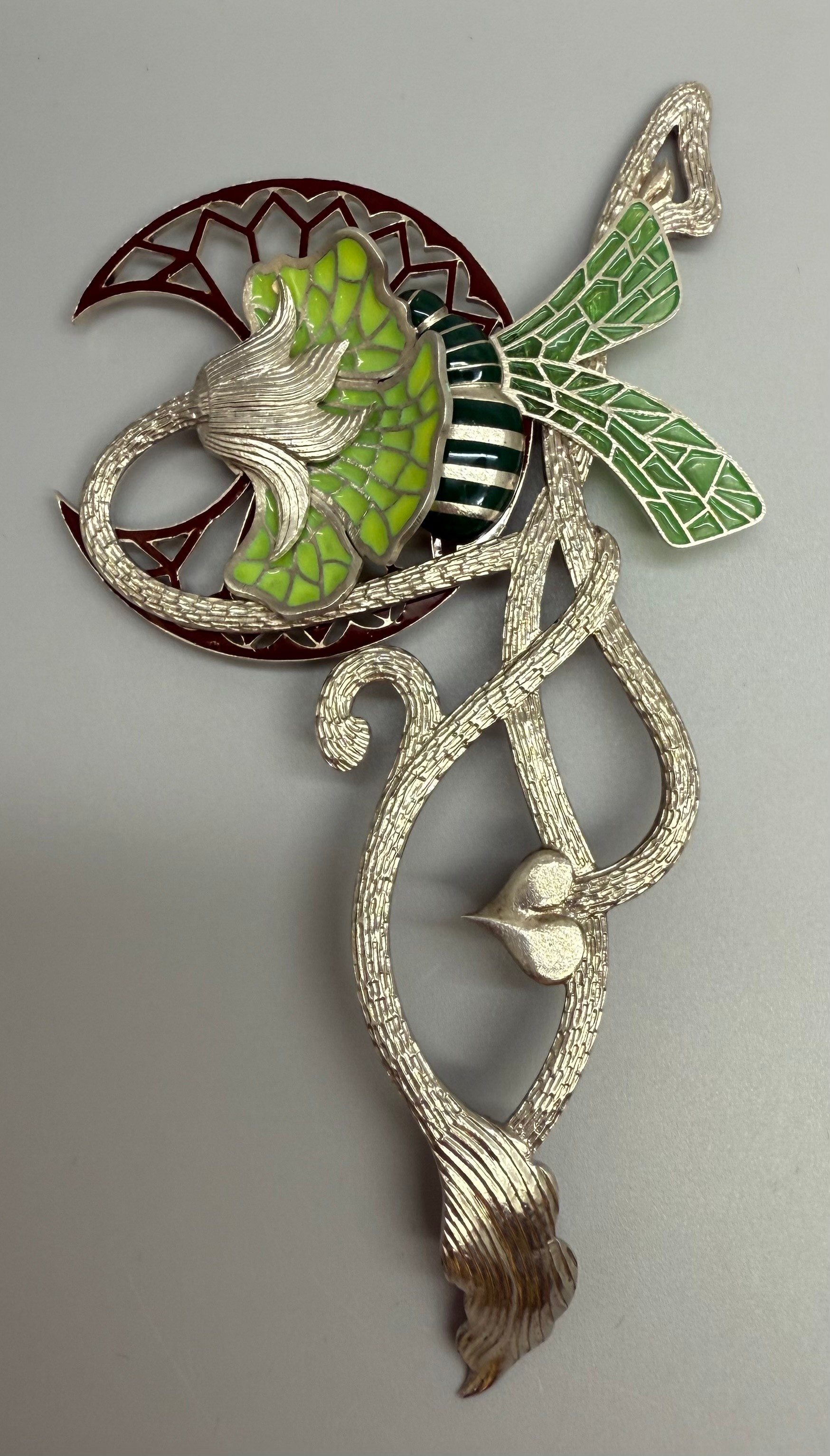 Paul Spurgeon, a silver Art Nouveau style plique-a-jour enamel brooch depicting a bee and flower, lacking clasp, hallmarked, 21g, 10.4 x 5.3cm