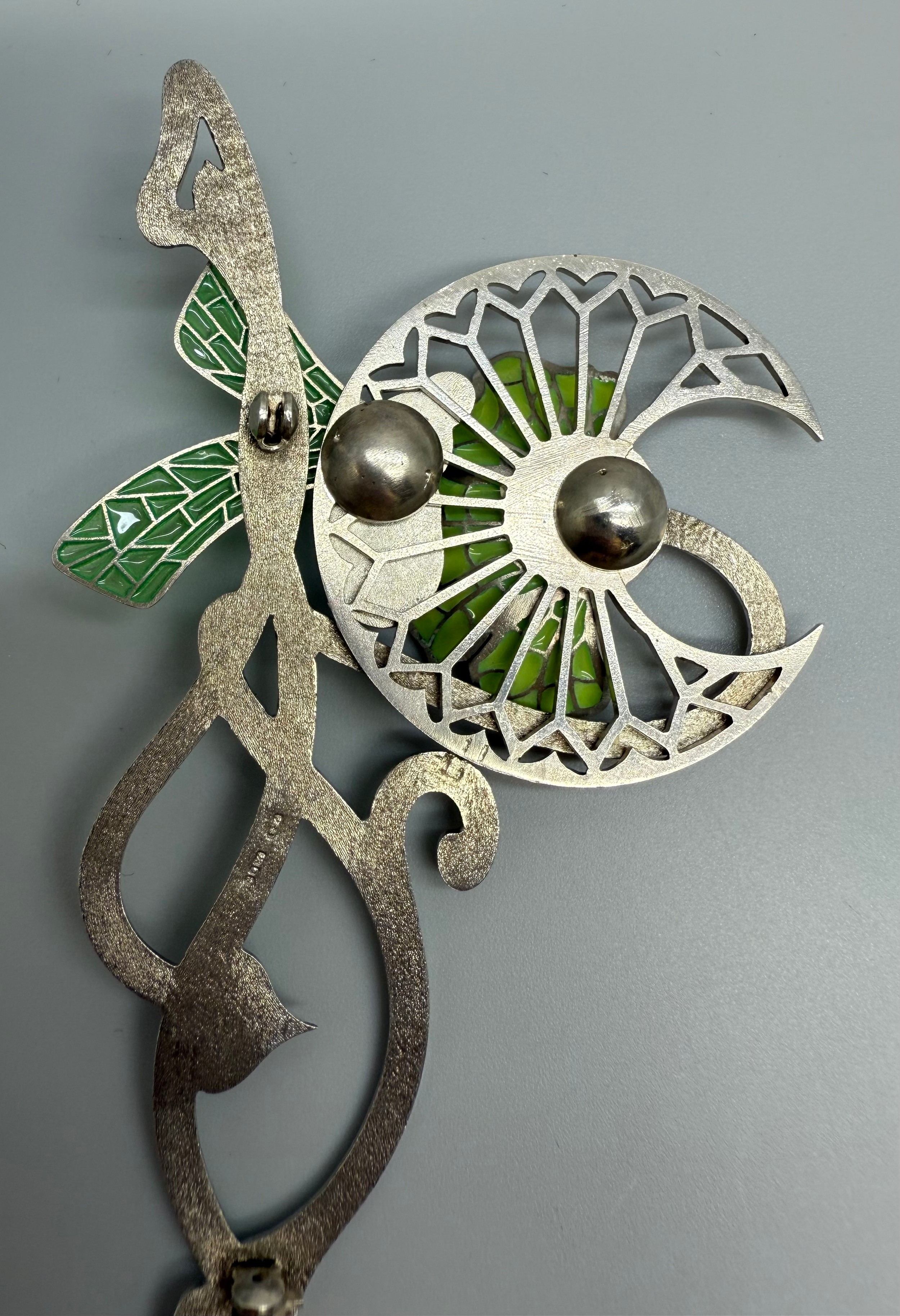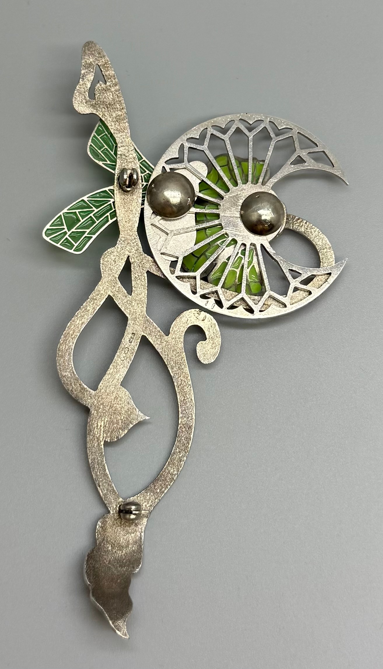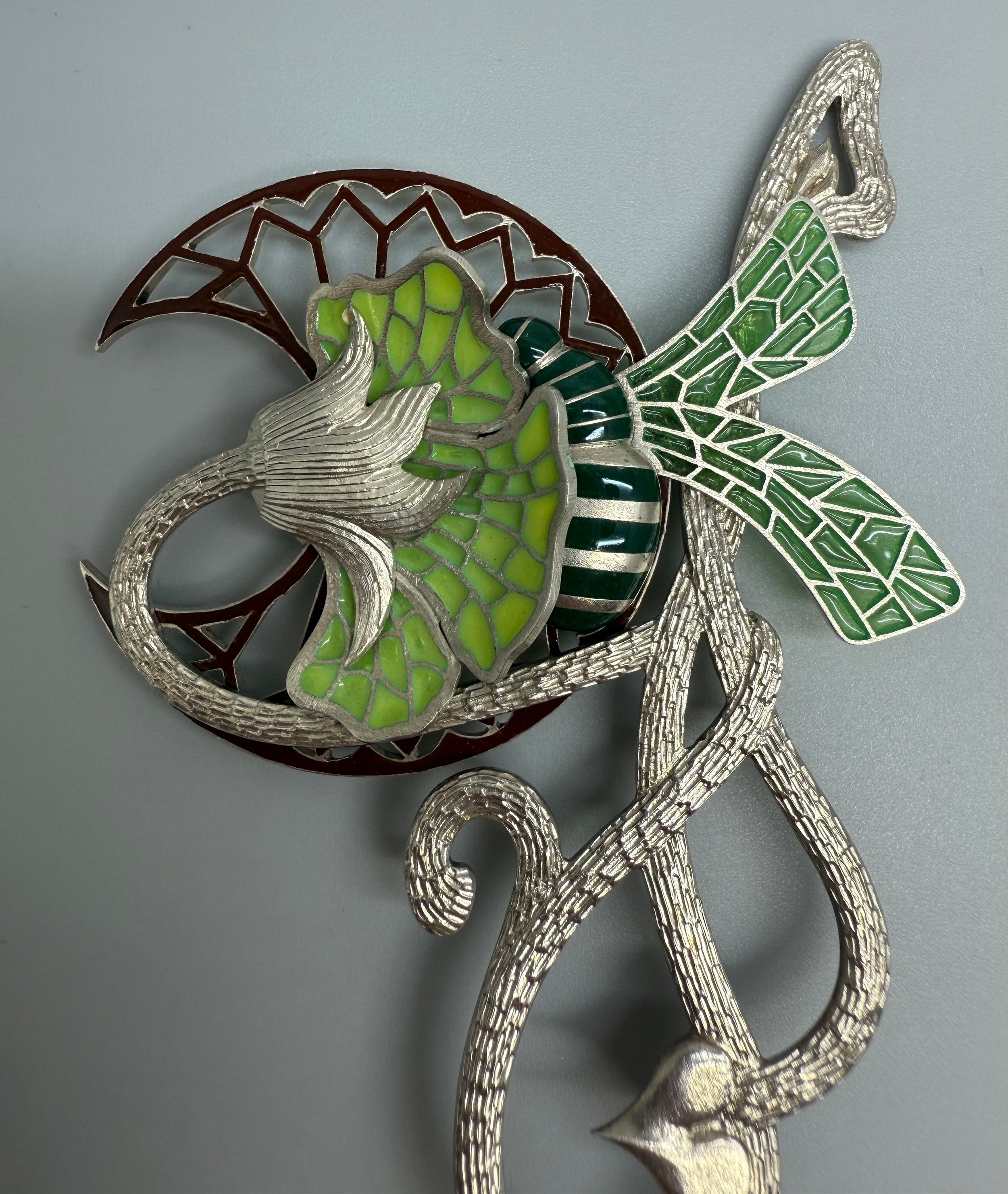 Paul Spurgeon, a silver Art Nouveau style plique-a-jour enamel brooch depicting a bee and flower, lacking clasp, hallmarked, 21g, 10.4 x 5.3cm