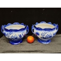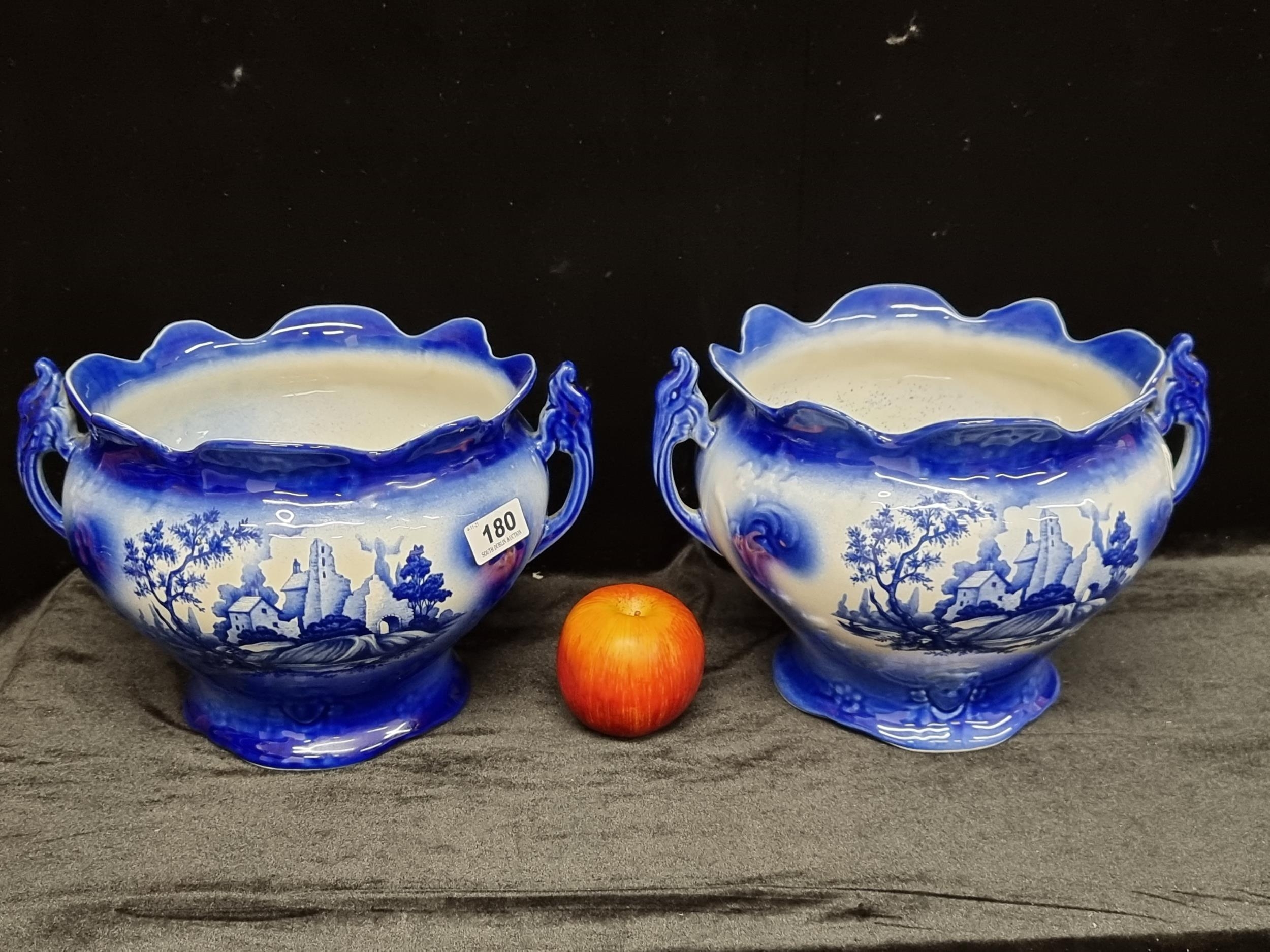 A pair of vintage blue-glaze Jardinière Vase featuring romantic scenes of a ruined castle.