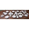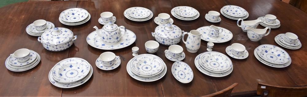 A Mason's Denmark pattern part dinner service, comprising dinner plates, salad plates, side plates, oval serving plates, sauce boats and stands, covered serving dish, teapot, teacups and saucers, breakfast cups, milk jug, etc