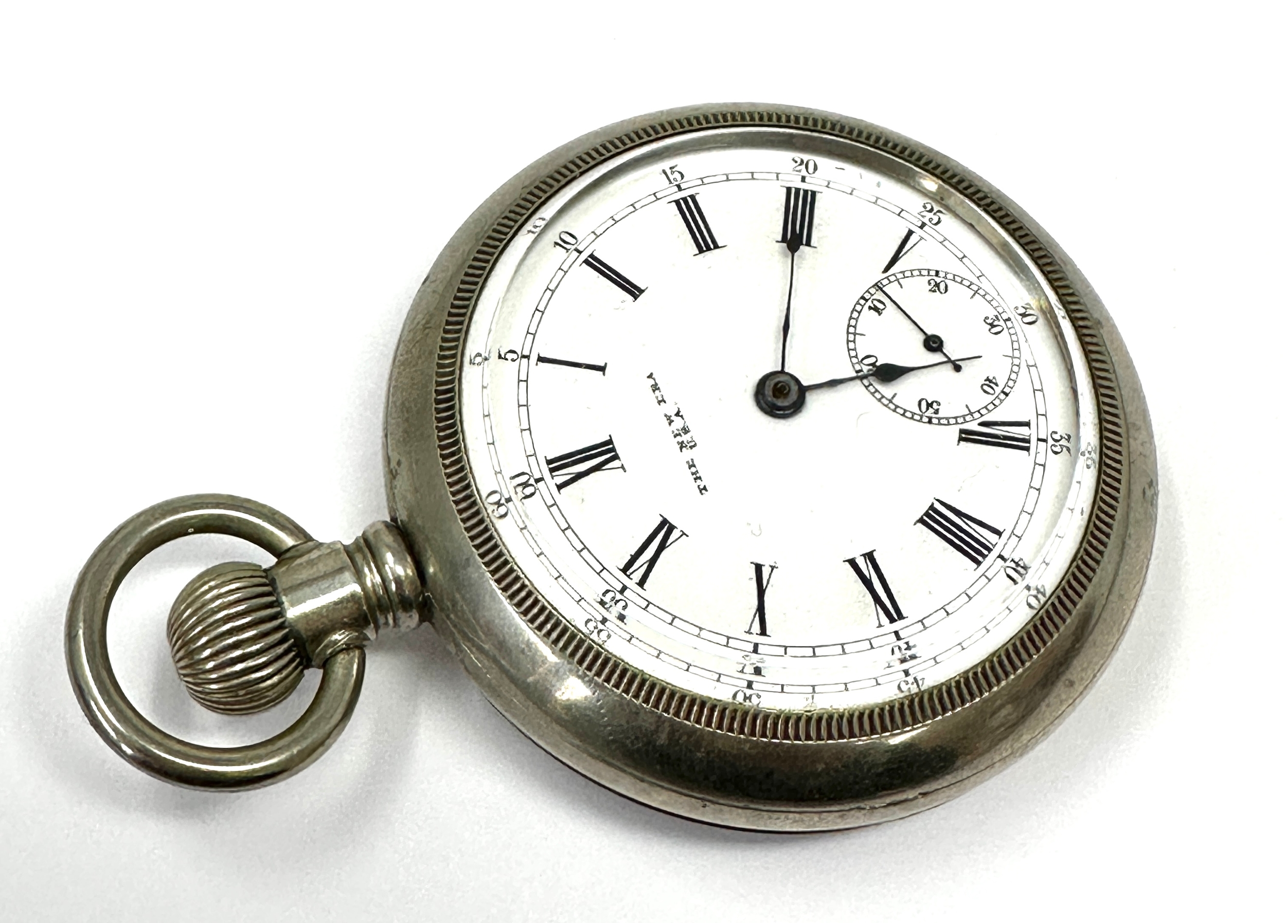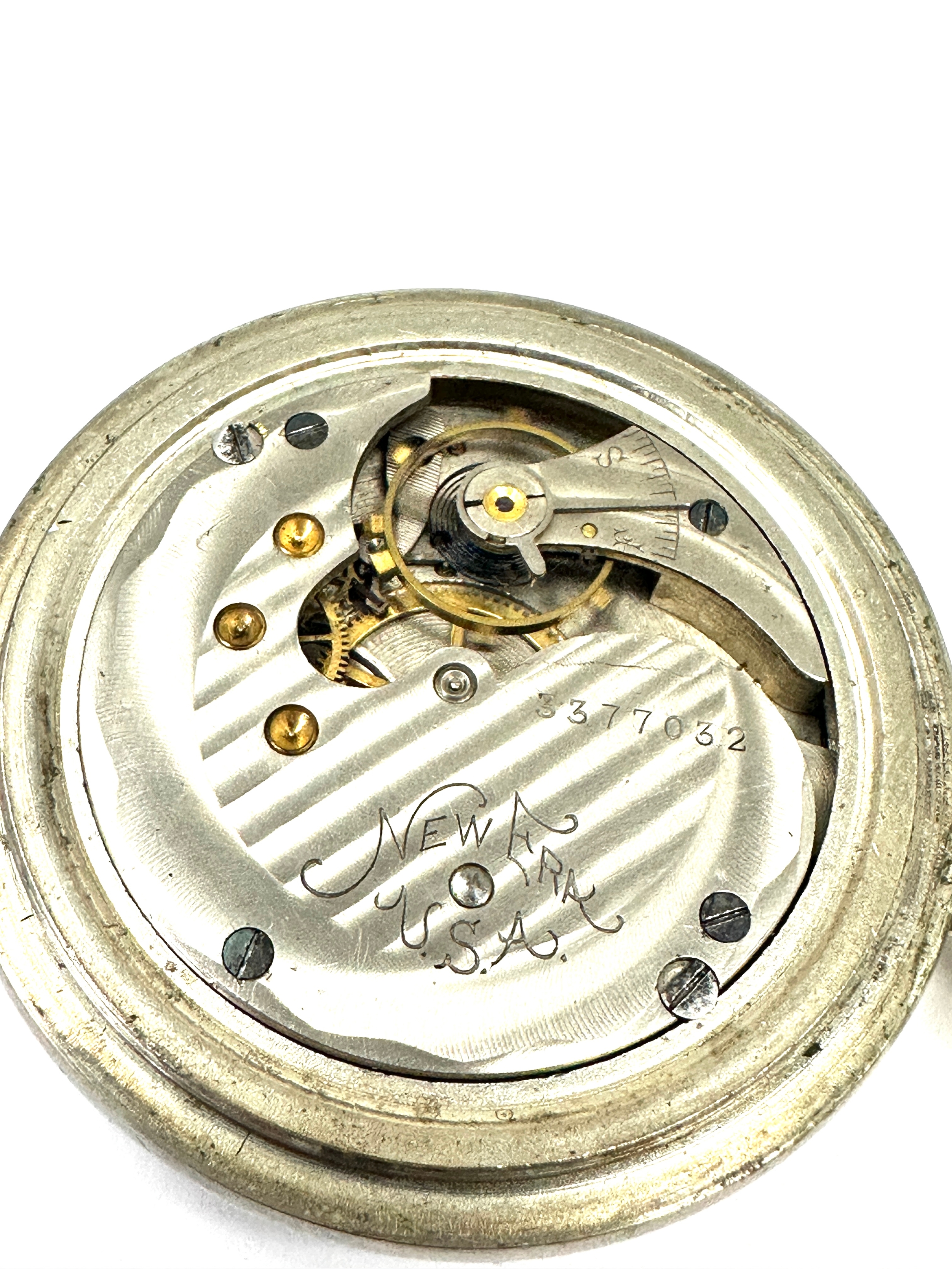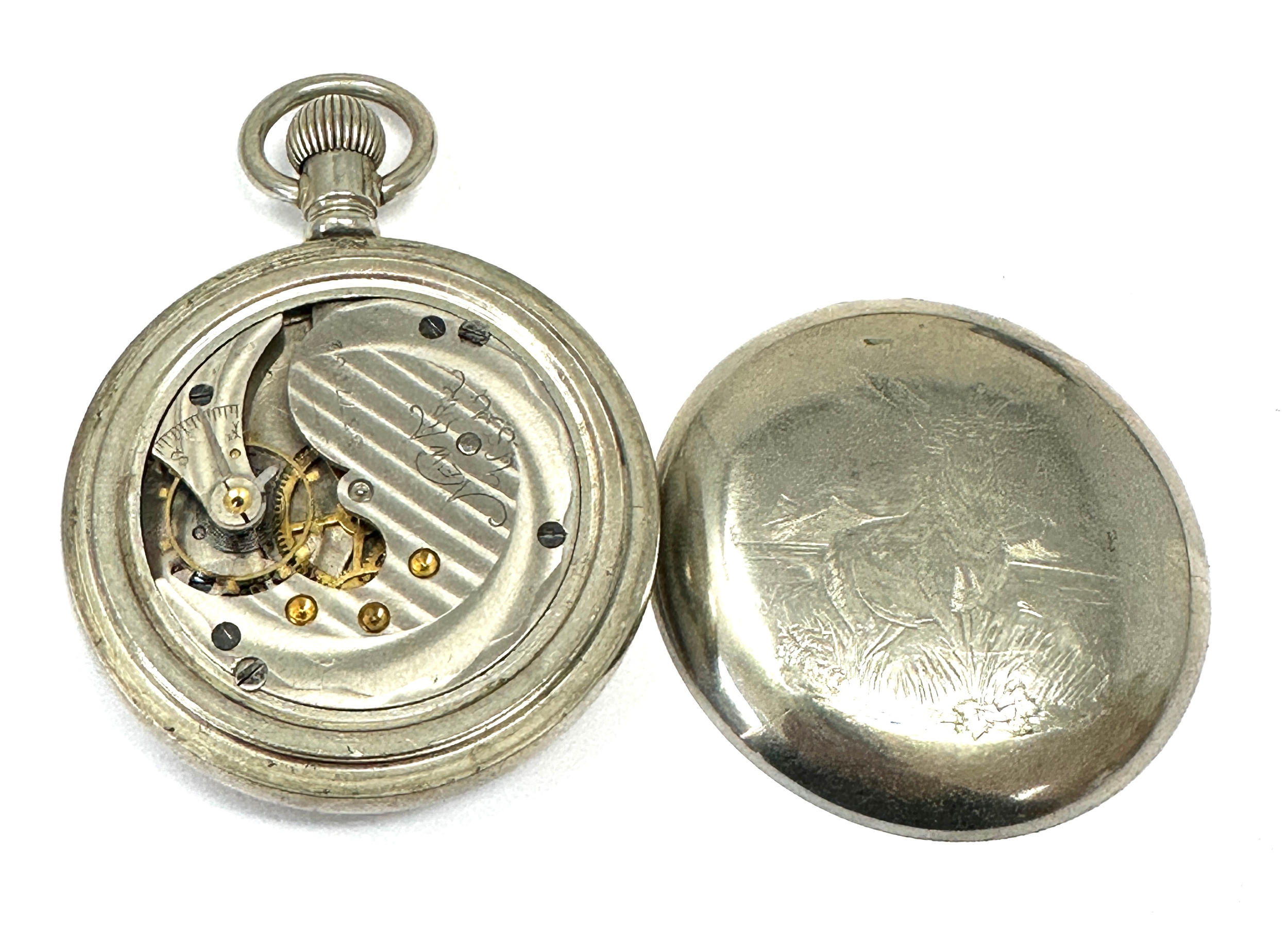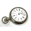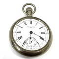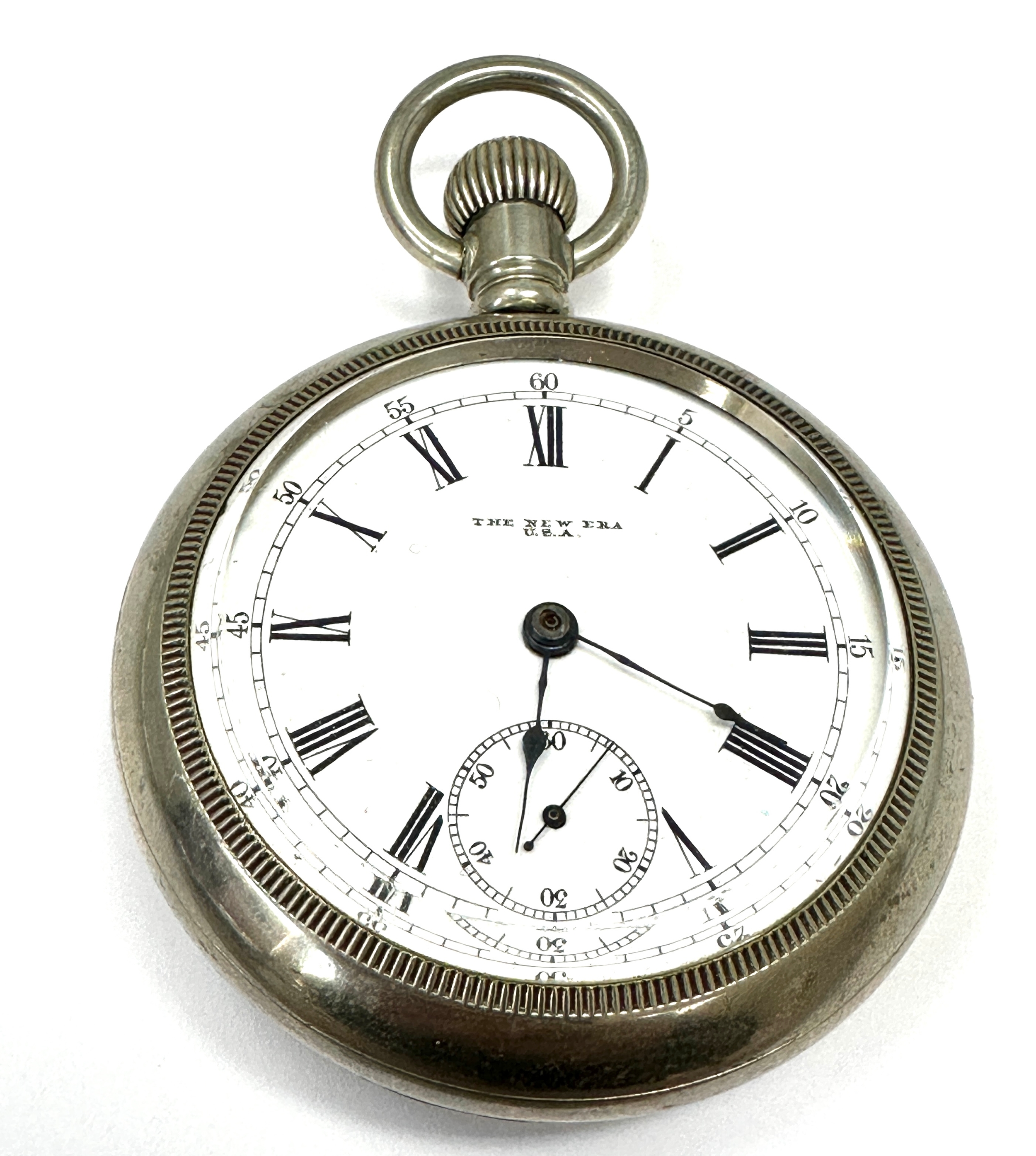 The New Era U.S.A Large open face pocket watch case measures approx 60mm diam the watch is ticking nickel cased great condition