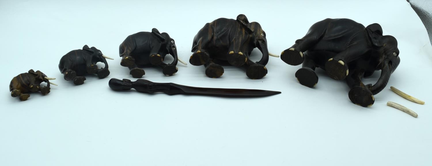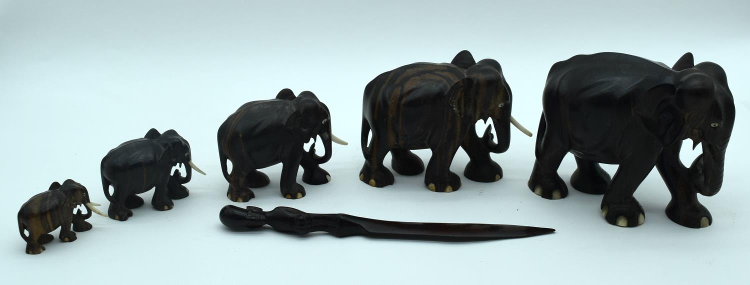 A Collection of African wooden Elephants and a page turner 13cm (6).