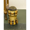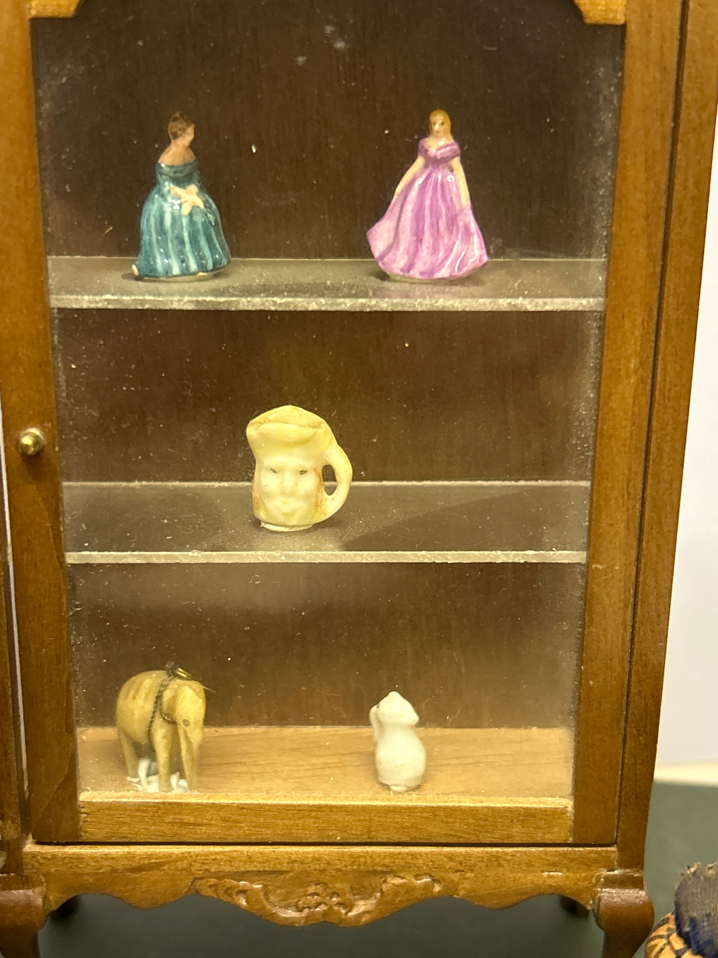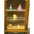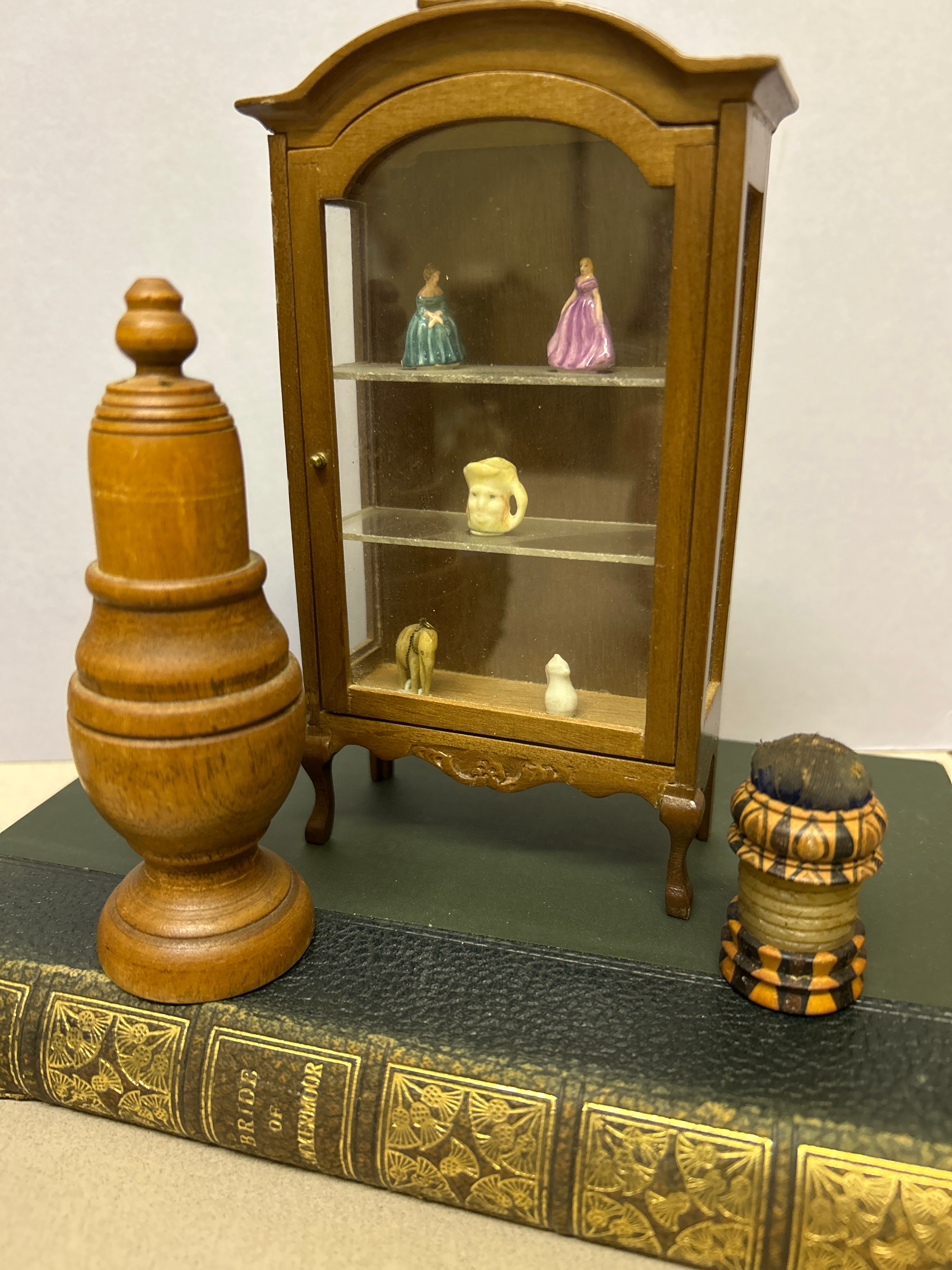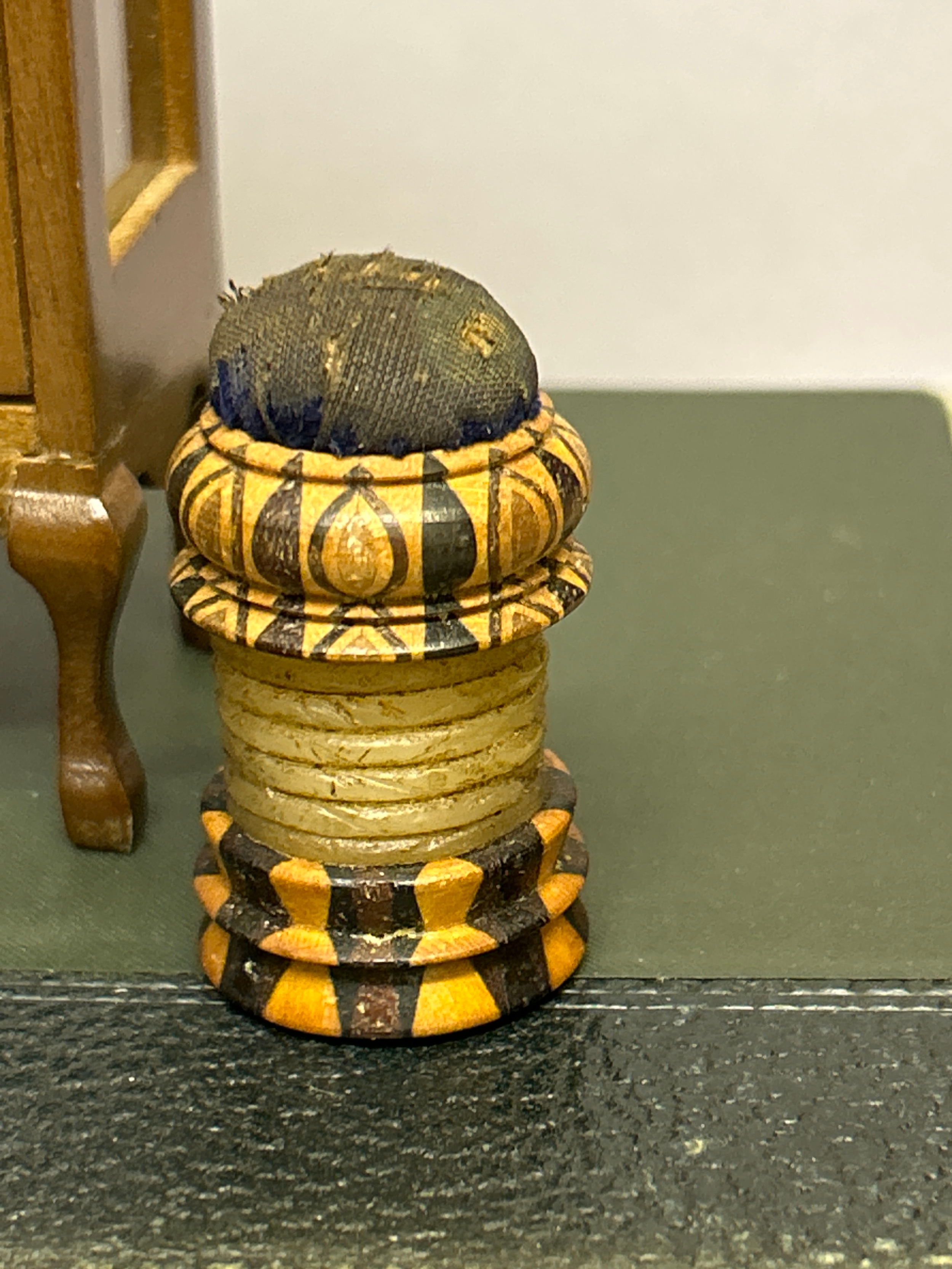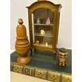 A Victorian tunbridge ware waxer & pincushion, a turned wood salt cellar and a miniature display cabinet with miniature contents.