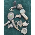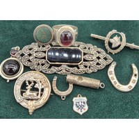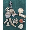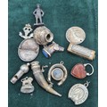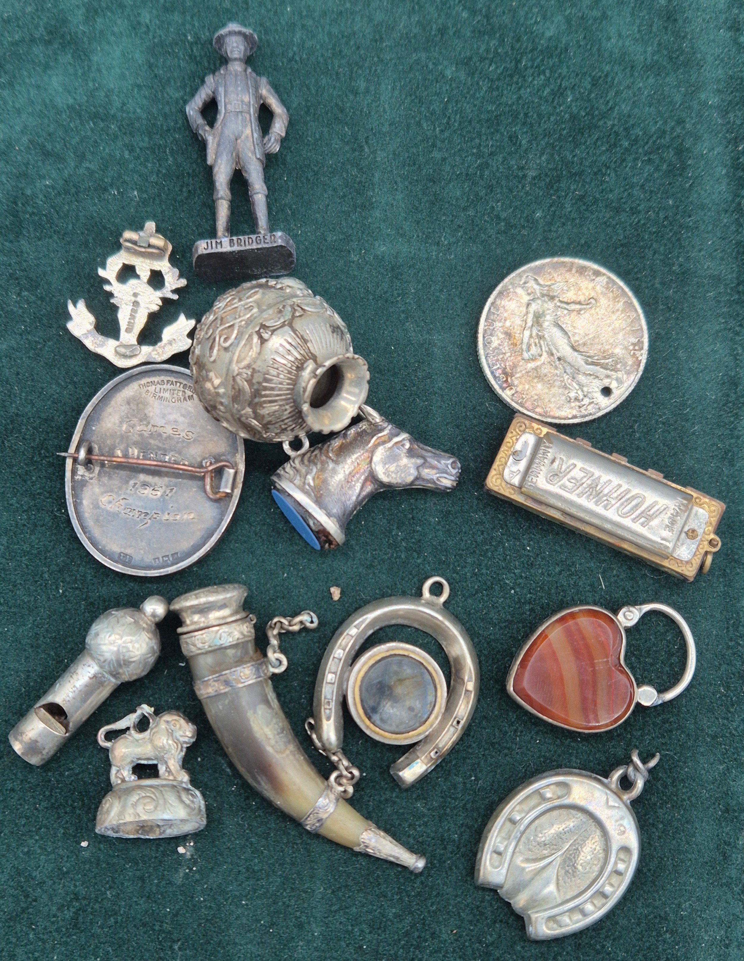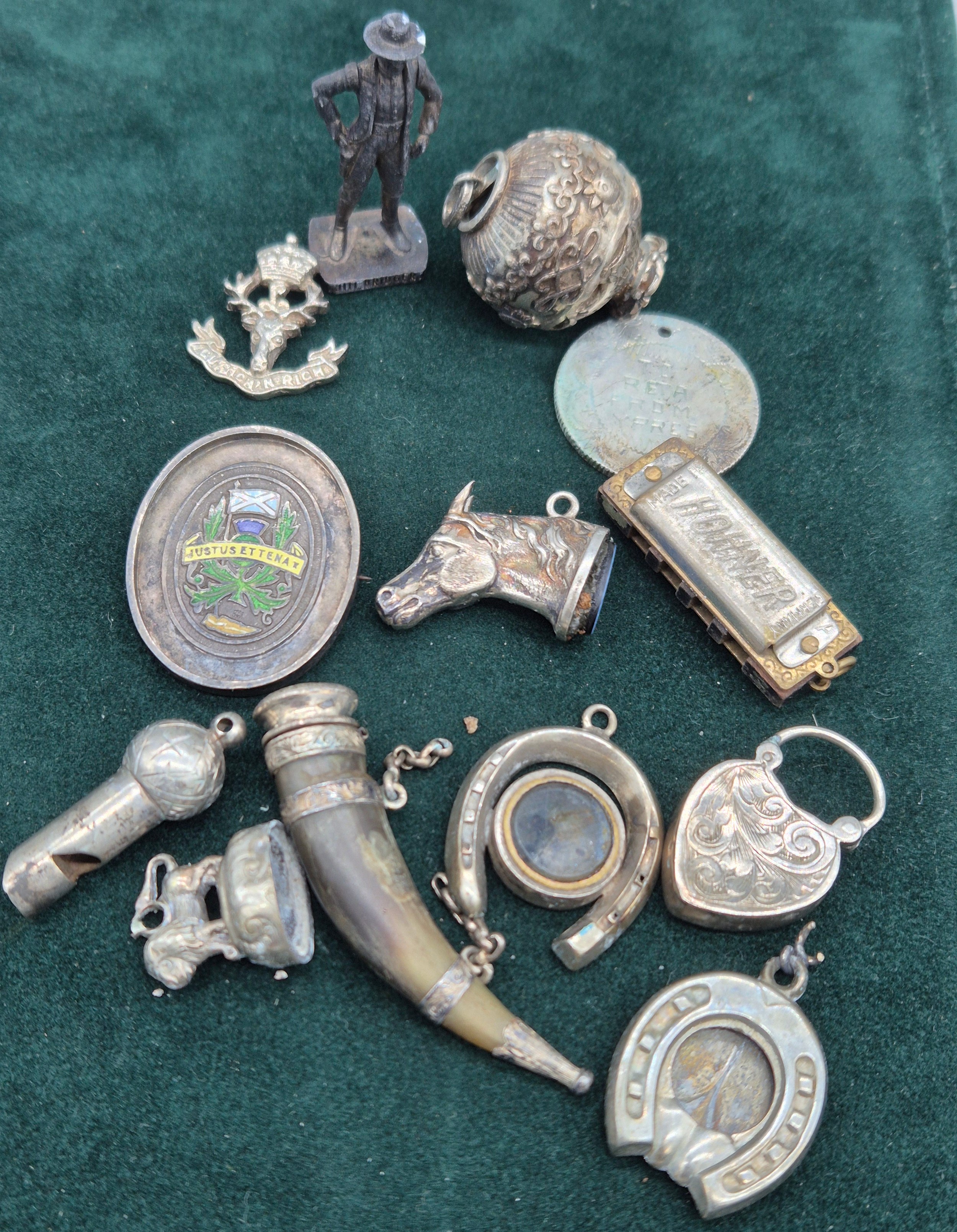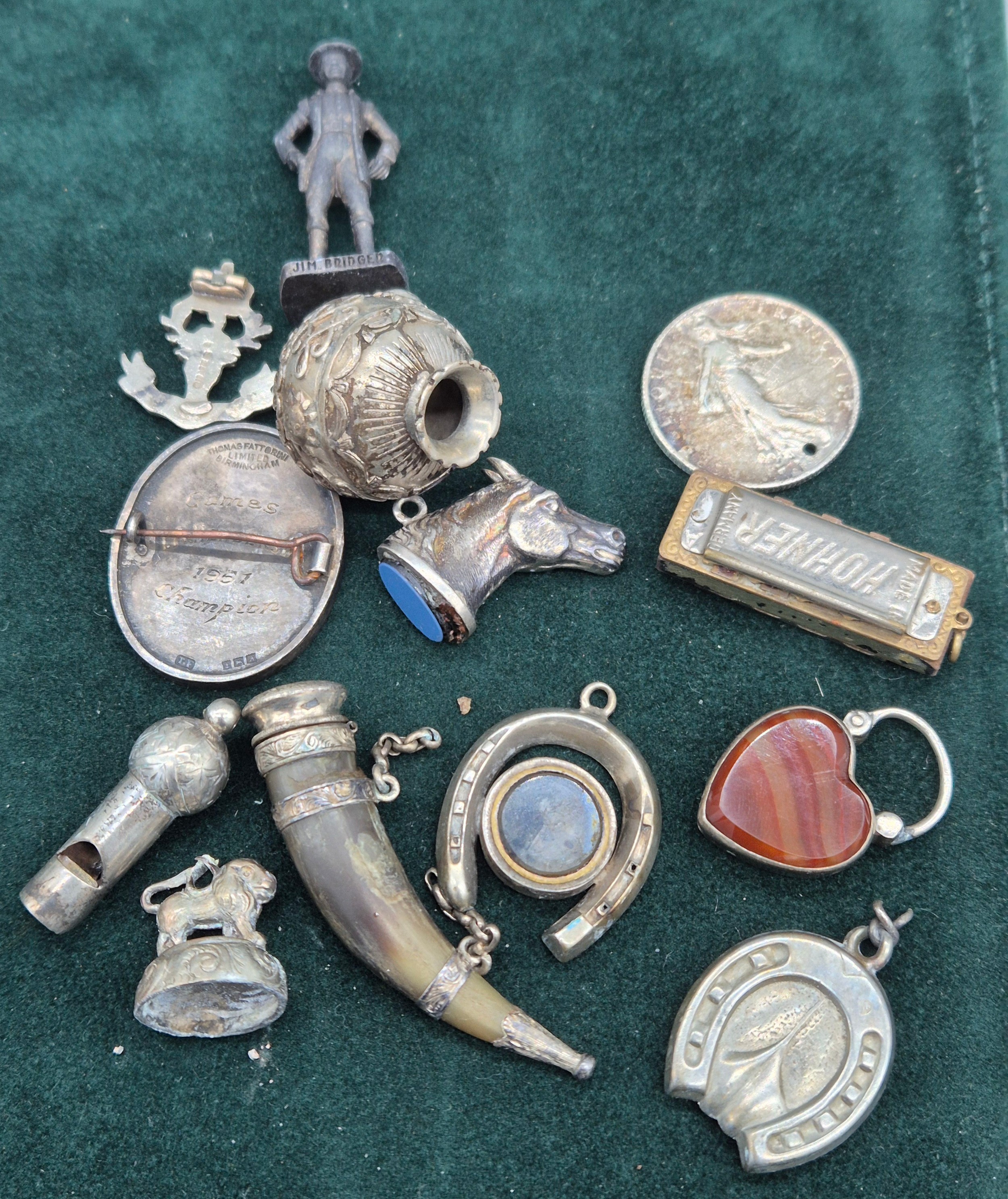 A Collection of silver and collectables; Antique silver and horn made snuff- in the form of a horn drinking cup, Antique silver and red agate heart locket, Silver horse head charm, Birmingham silver and enamel presentation brooch, Miniature whistle, Miniature Hohner mouth organ and various other collectables.