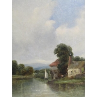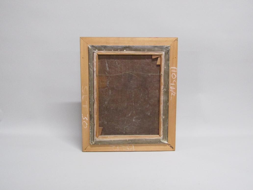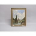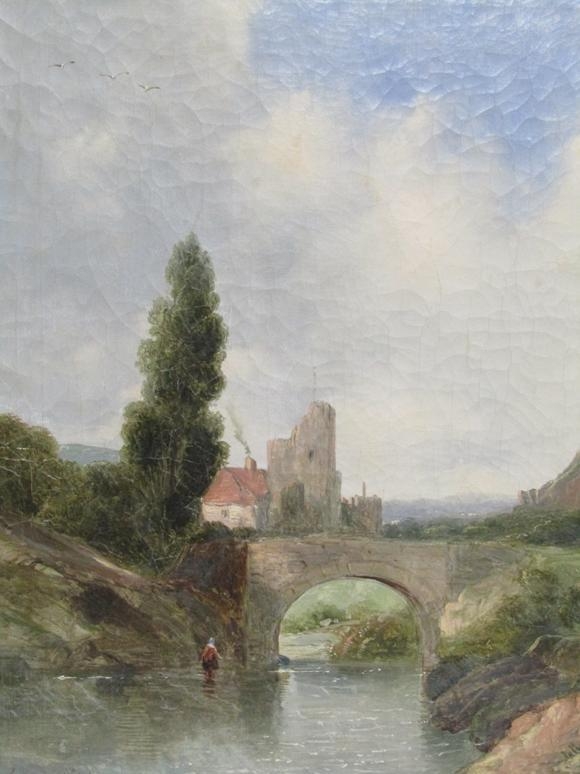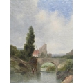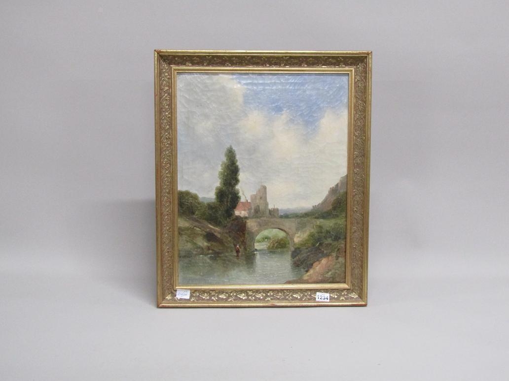 SIGNED INDISTINCTLY, FIGURE WALKING IN THE RIVER CLOSE TO THE STONE BRIDGE OIL ON CANVAS, GILT FRAMED