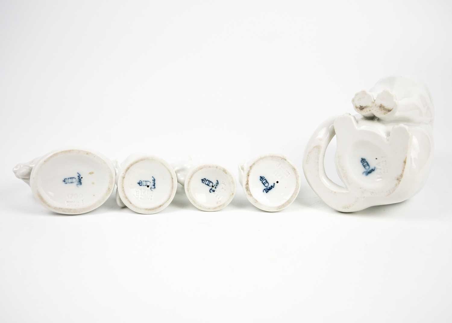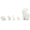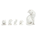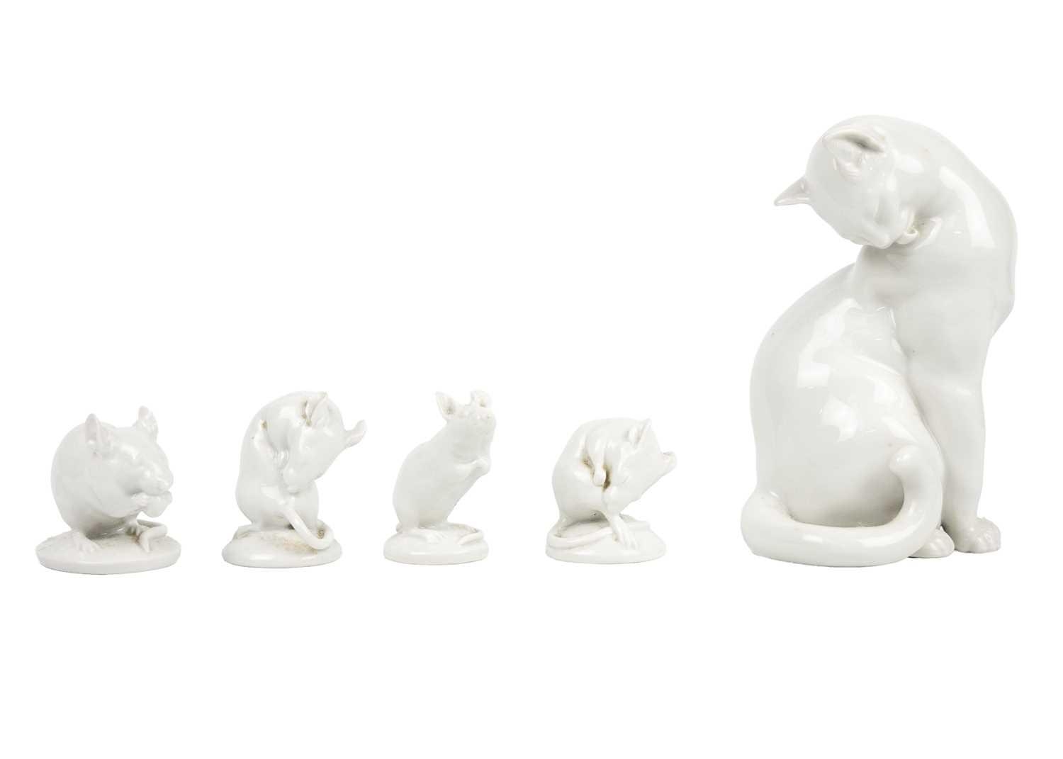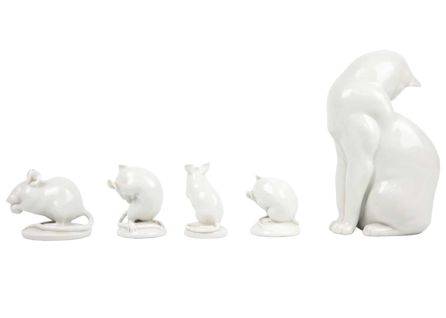 A Vienna white porcelain model of a cat. Height 15cm, together with four Vienna porcelain mice (5). The model of a cat has no condition issues. The mice also have no condition issues.