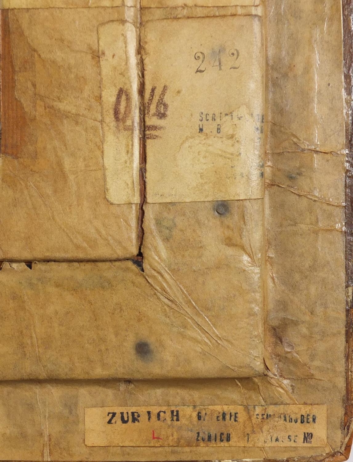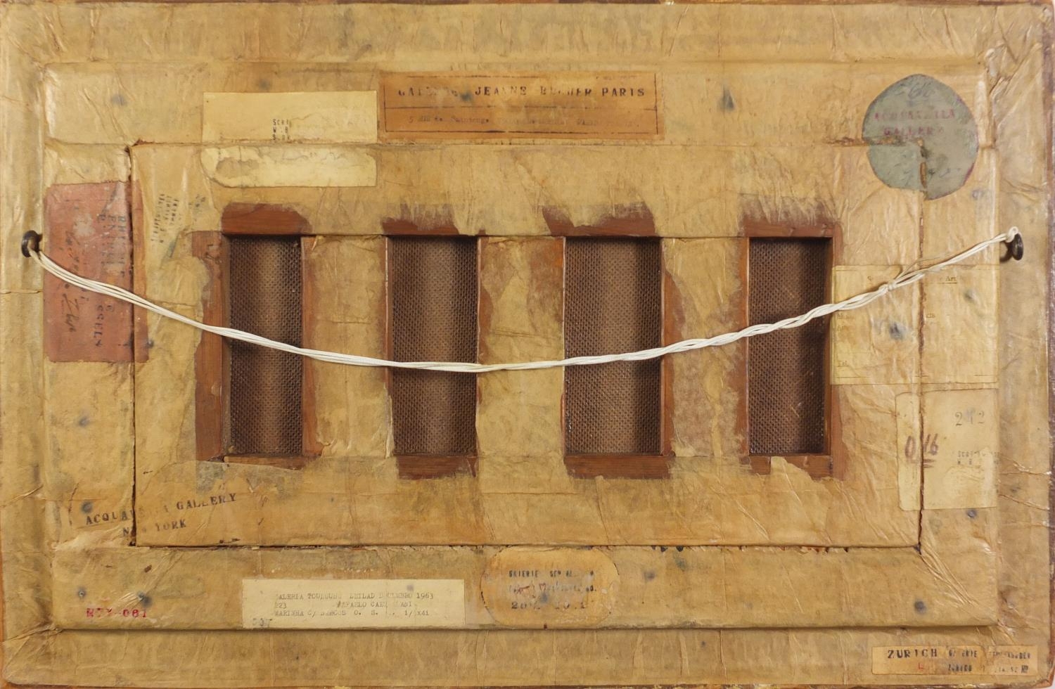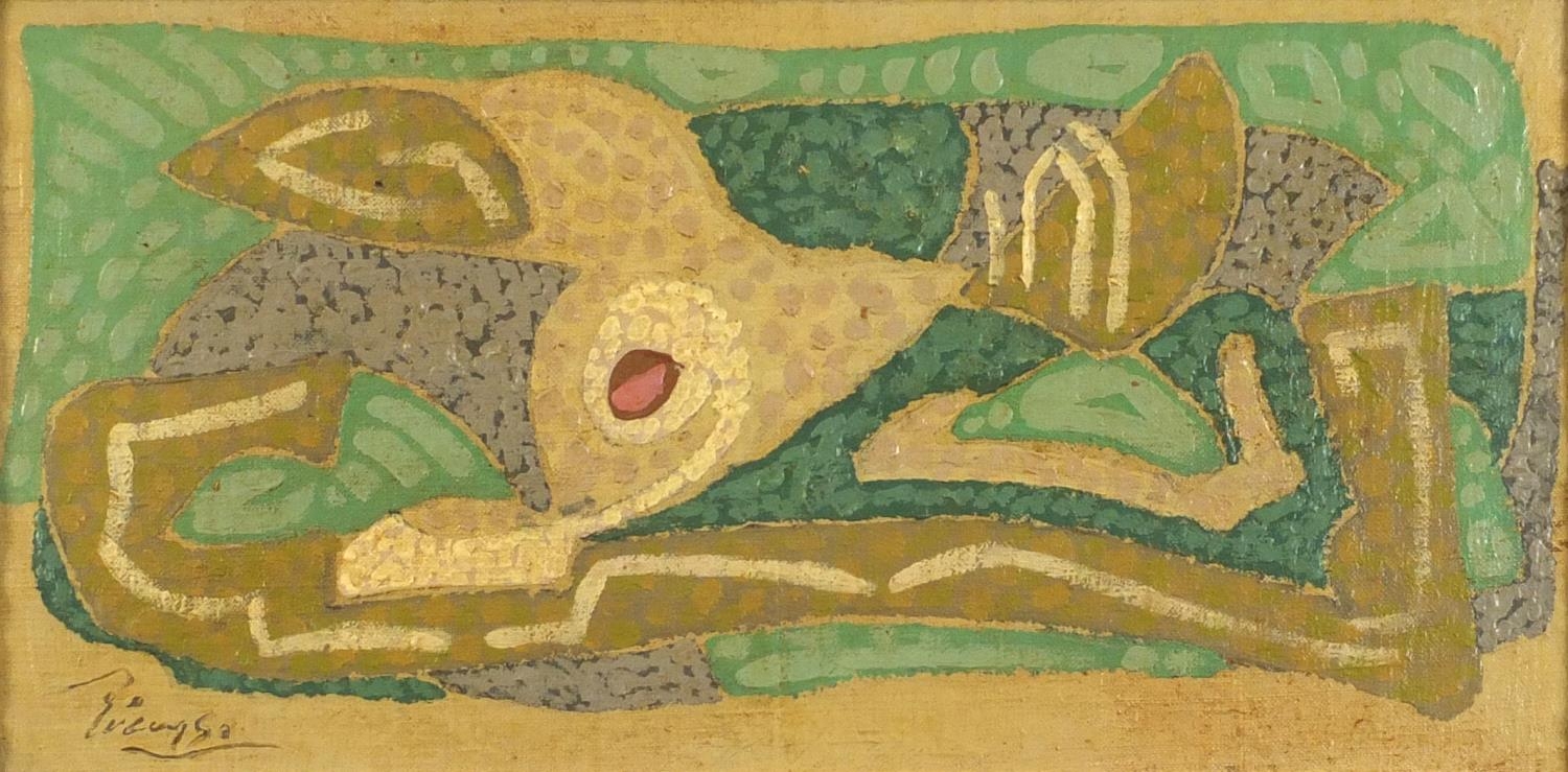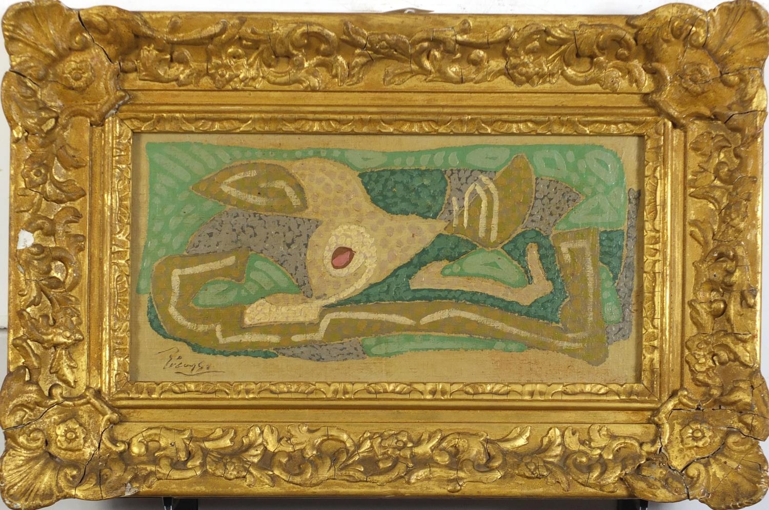 Abstract composition, oil on canvas laid on board, details verso, framed, 39.5cm x 20cm