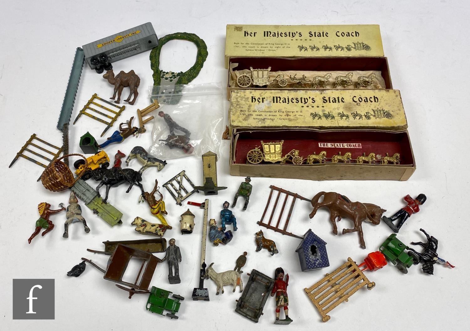 A collection of hollowcast and diecast, to include Johillco lily pond (lacking 'water'), Britains Bactrian camel, Britains gardener with wheelbarrow, etc., with assorted Matchbox models and two boxed Britains Her Majesty's State Coach. (qty)