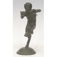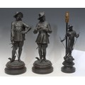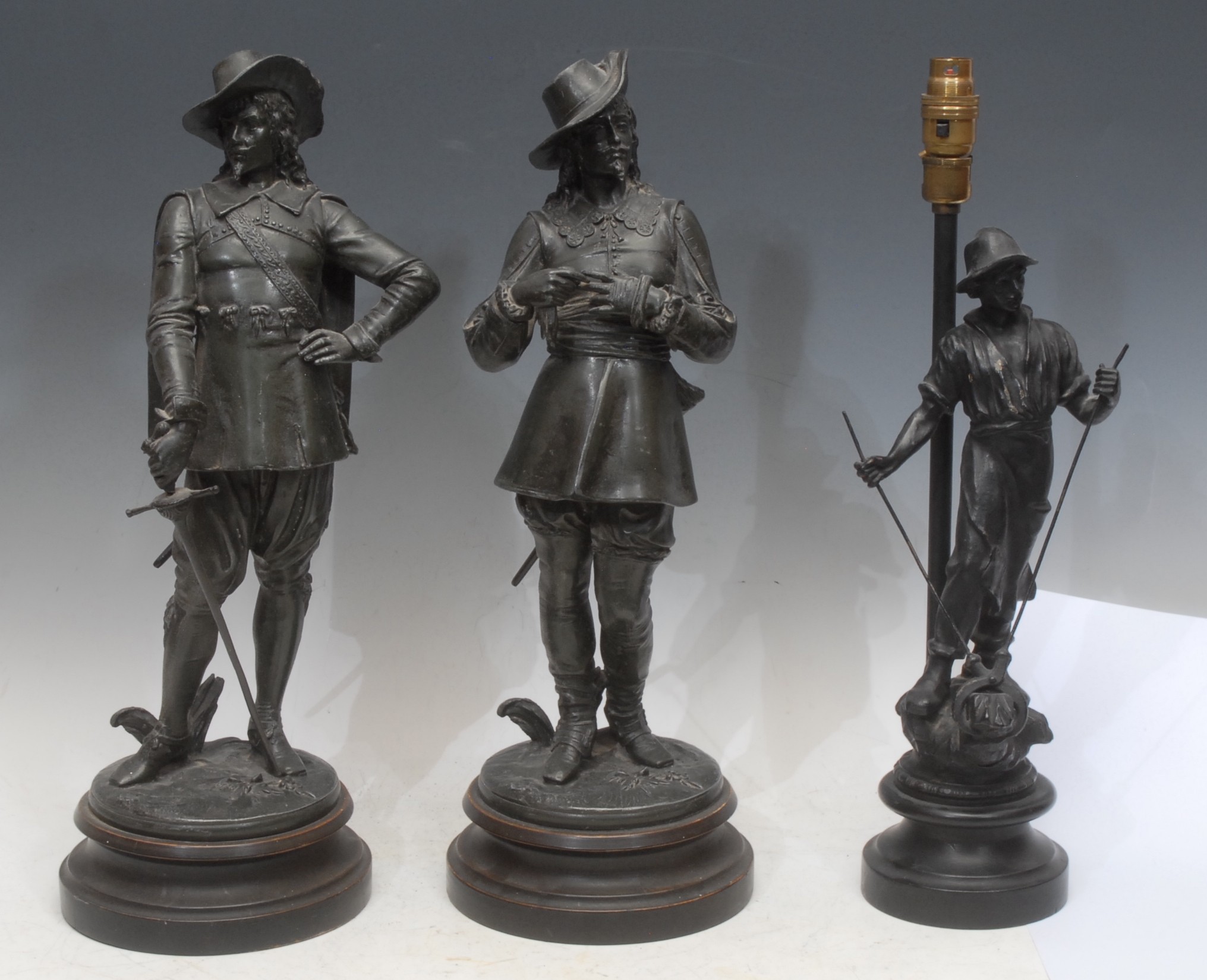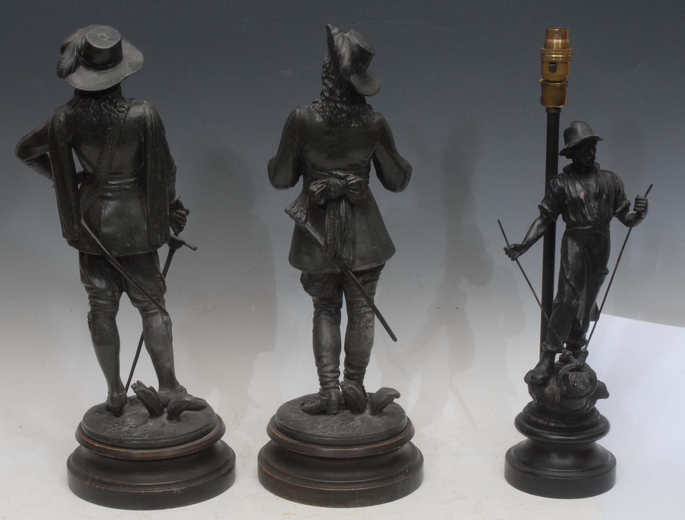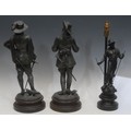 A patinated bronze effect figural sculpture, of a musketeer with a sword, circular base, 48cm high overall; another similar; a patinated bronze effect figural lamp, as a blacksmith, turned wooden base, 46.5cm high overall (3)