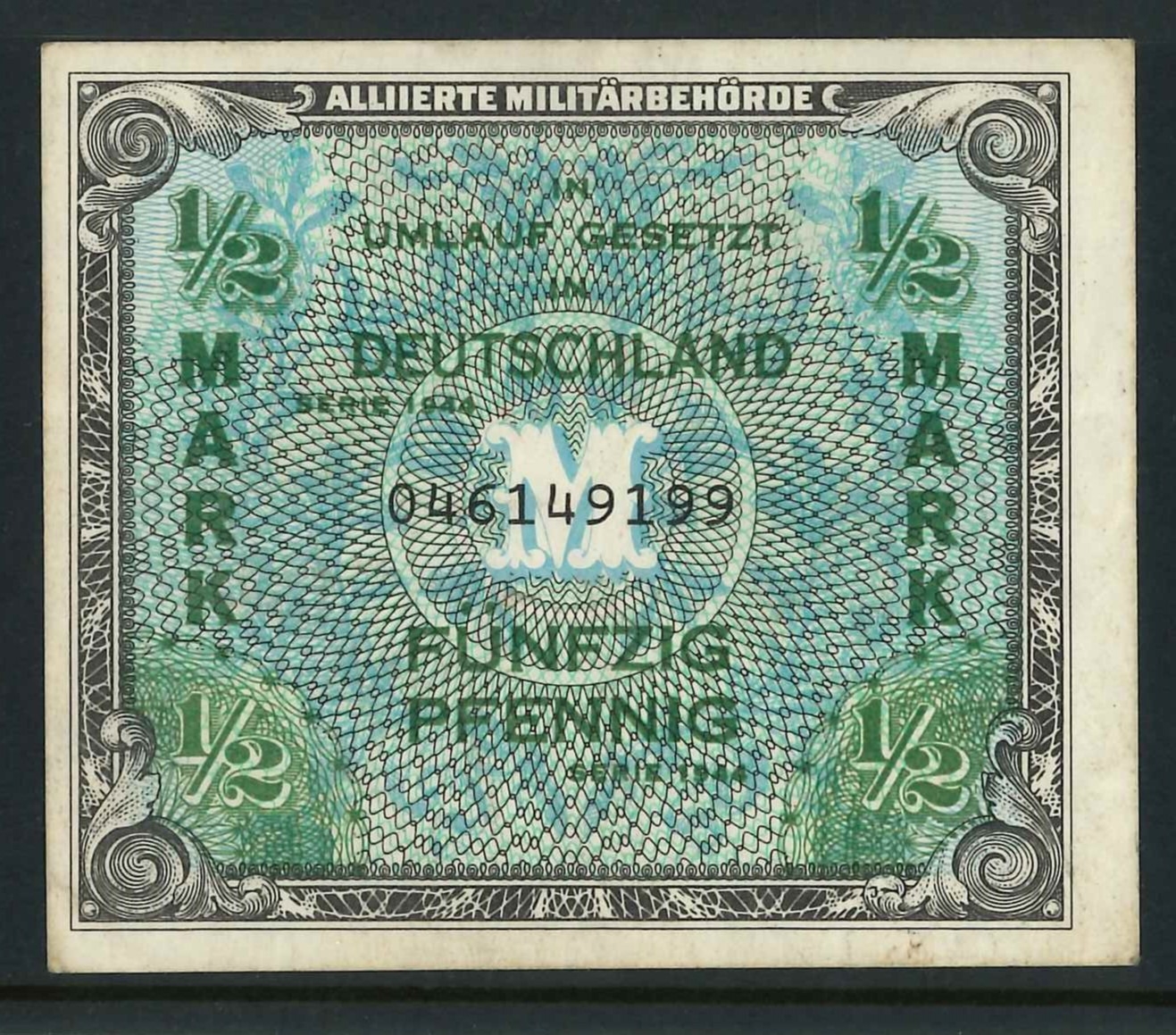 Banknotes; Germany (Allied Occupation); 1944 ½m with 9-digit serial number, about EF, Krause 191a.
