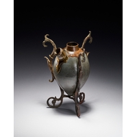 This bronze ritual container, identified as a 17th-century Deccan spiritual box, is a traditional vessel used for holding kumkum or tikka powder. The object features a central teardrop-shaped vessel with a hinged, peaked lid. The lid is surmounted by a stylized peacock finial. A prominent rear assembly consists of a pedestal-mounted large peacock with a fanned tail, flanked by smaller avian figures. The front of the base includes a stepped platform supporting two additional peacock figures. The iconography centers on the mayura or peacock, a significant motif in South Asian spiritual art. The casting displays stylized crests, scrolling plumage, and traditional avian forms characteristic of the Deccan region. The construction is modular, with the various figural components joined to a flat, teardrop-shaped base.