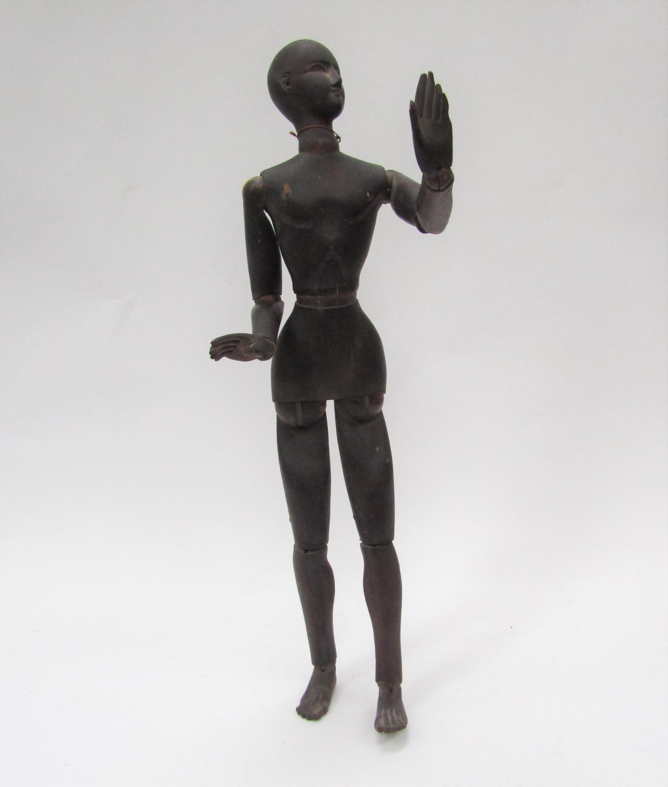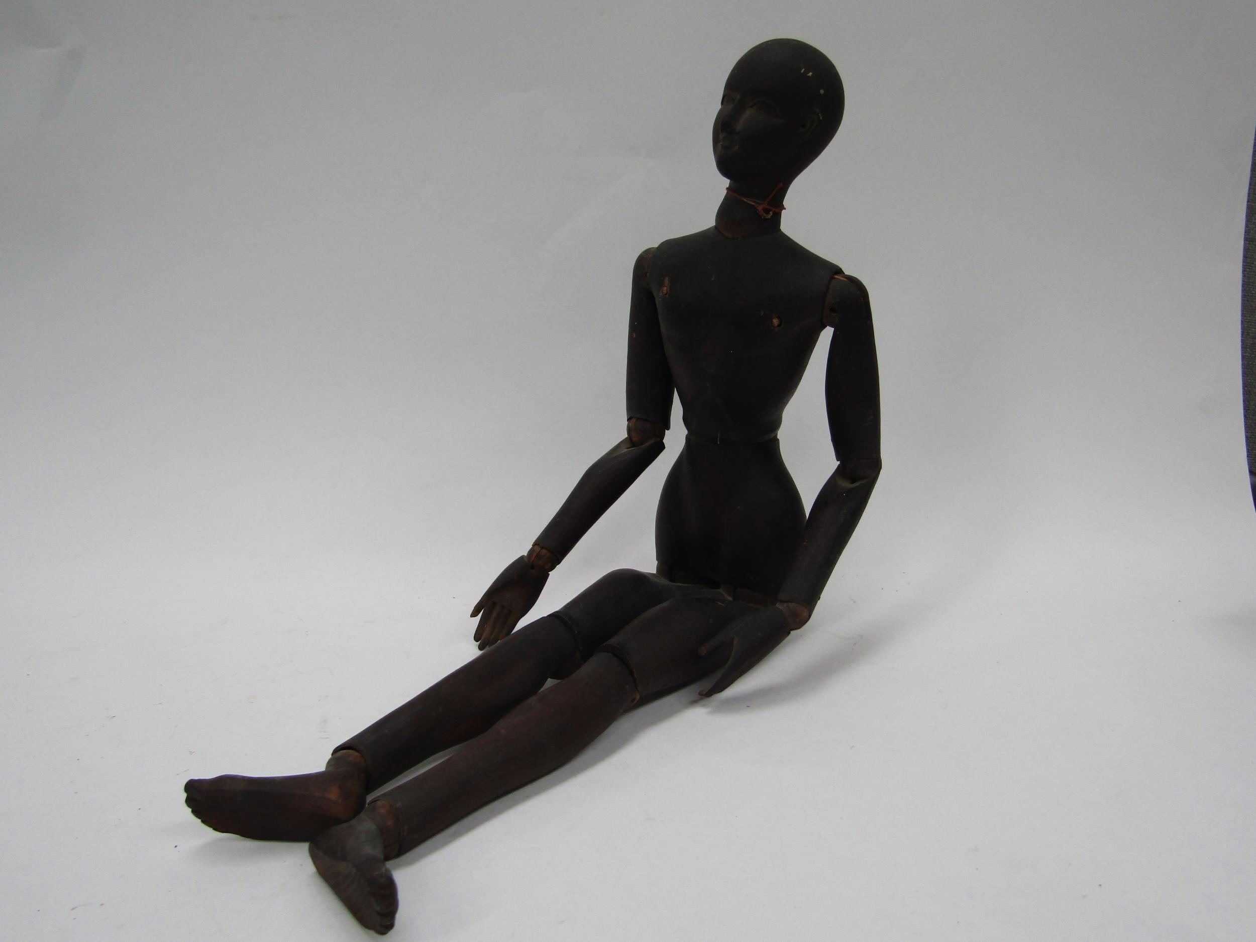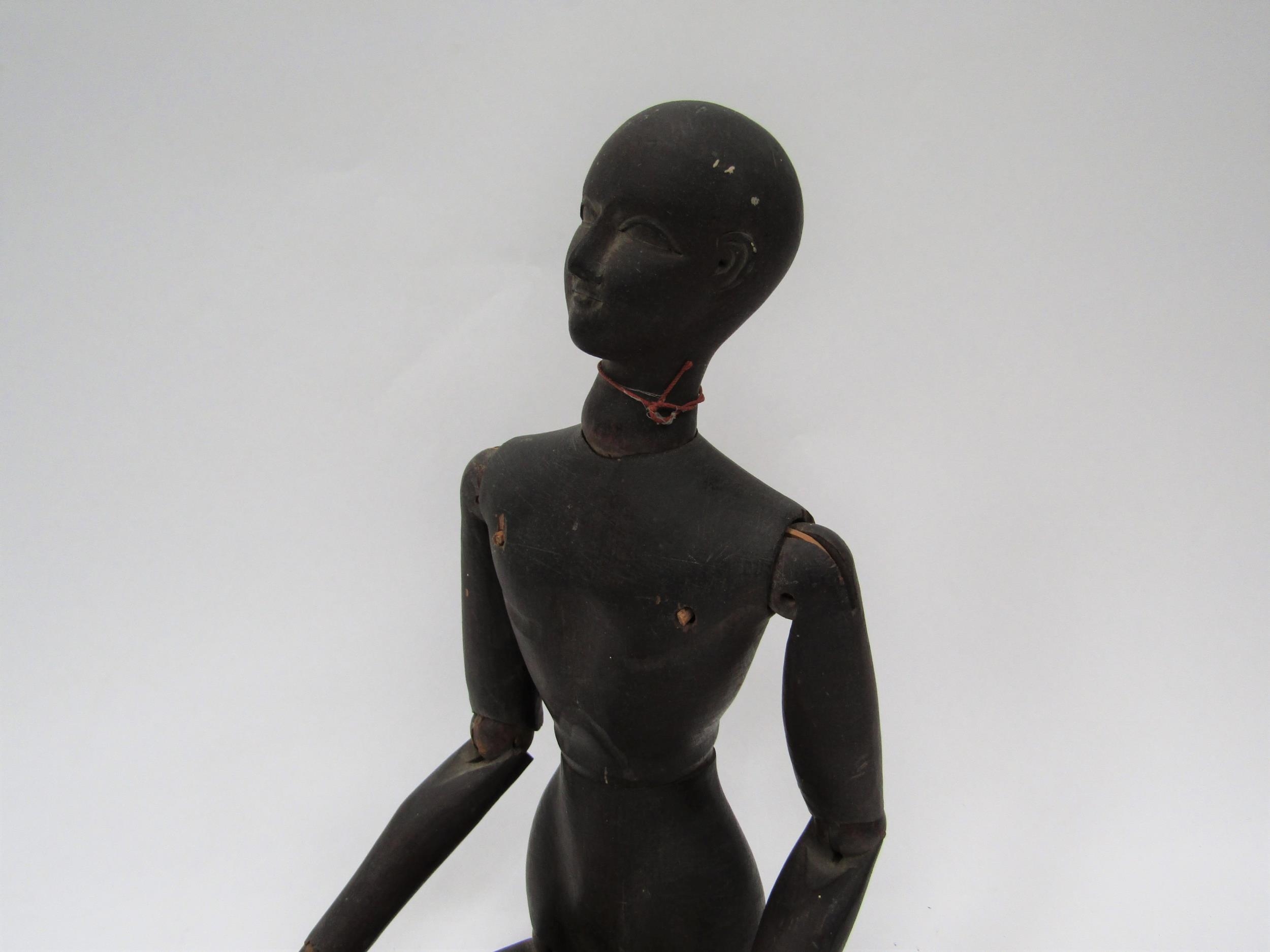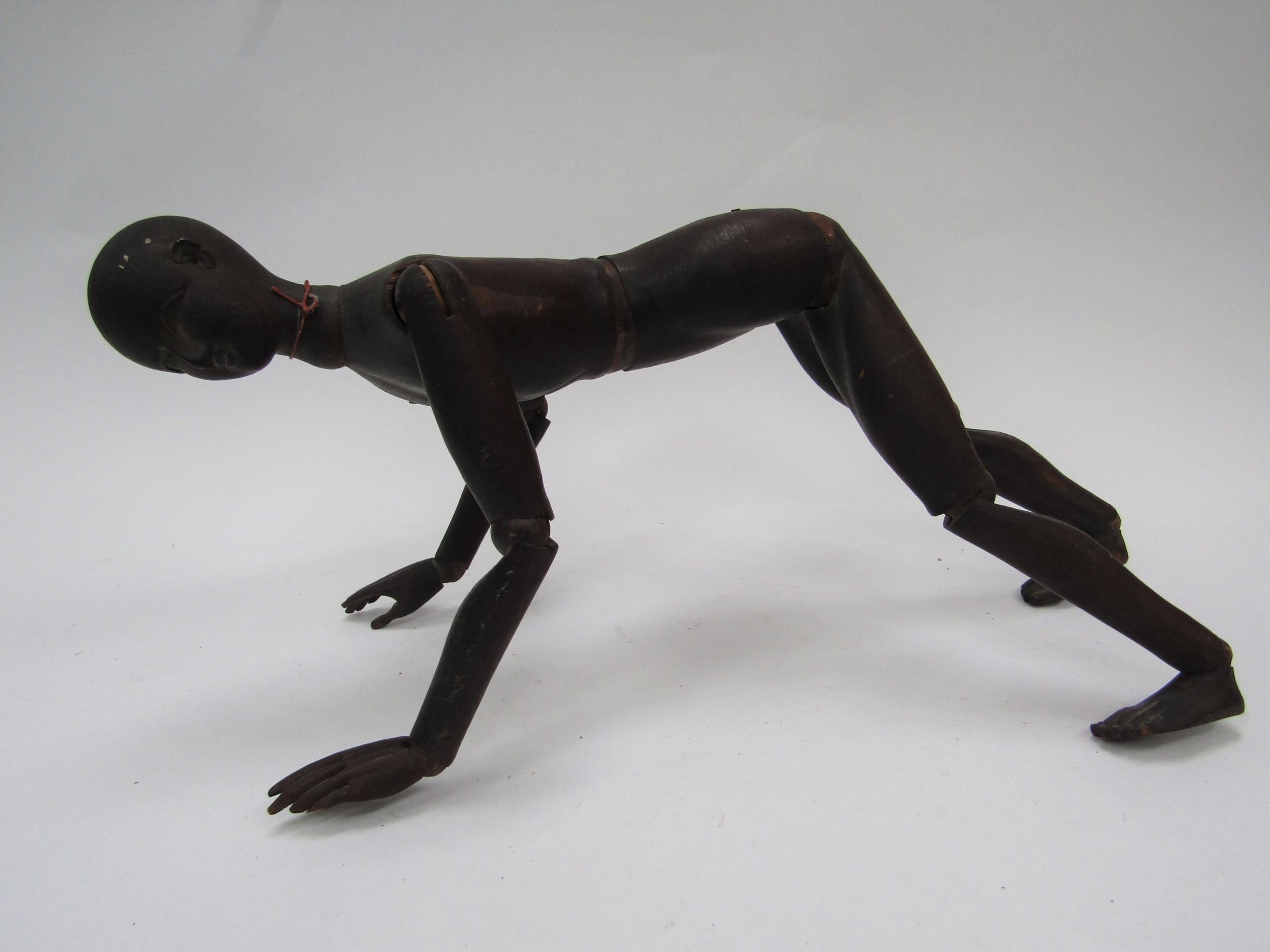 A 19th Century carved and stained pine artist's lay figure, articulated limbs, 49cm long