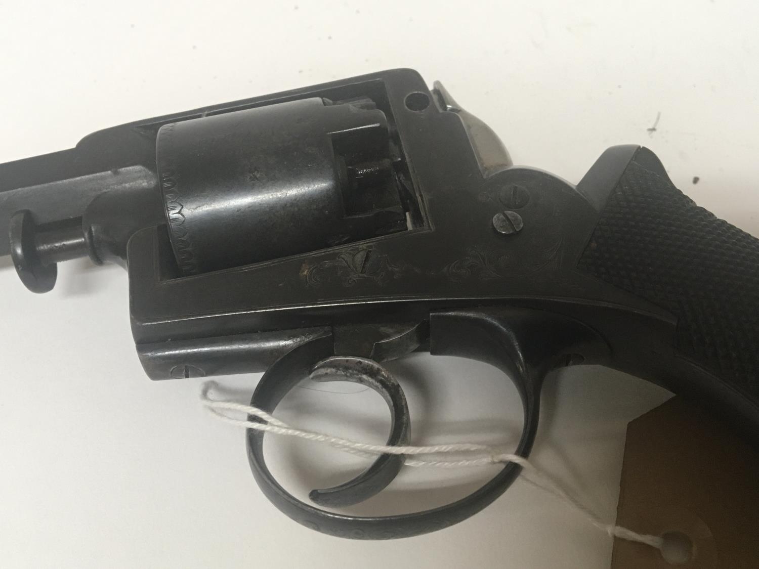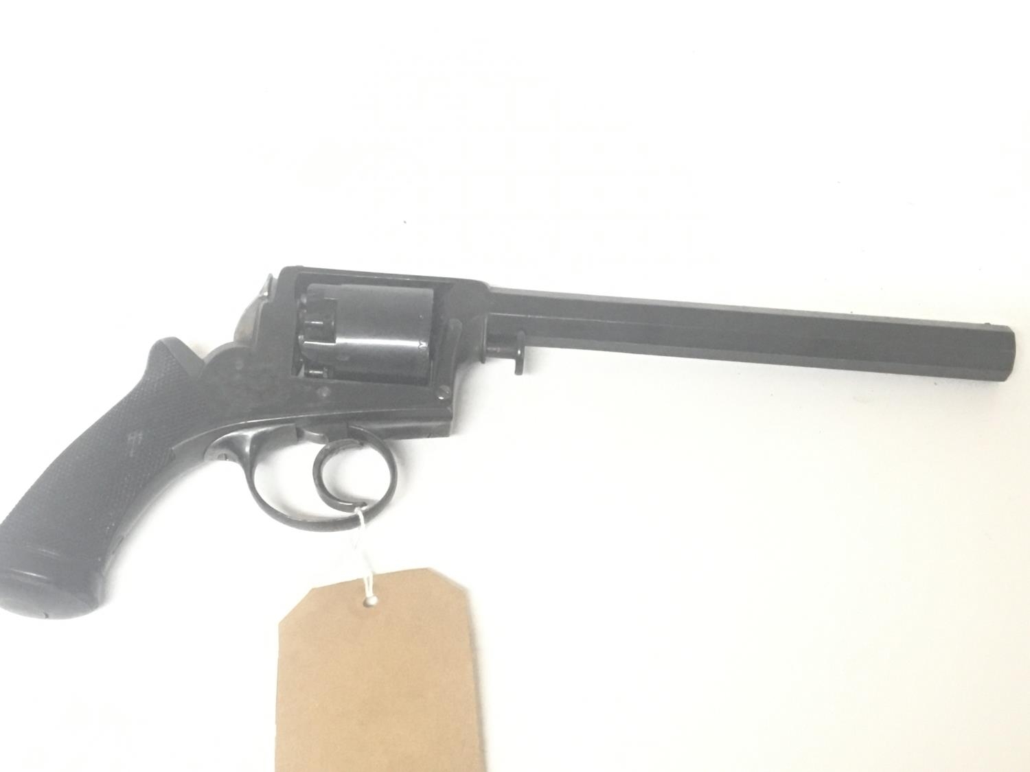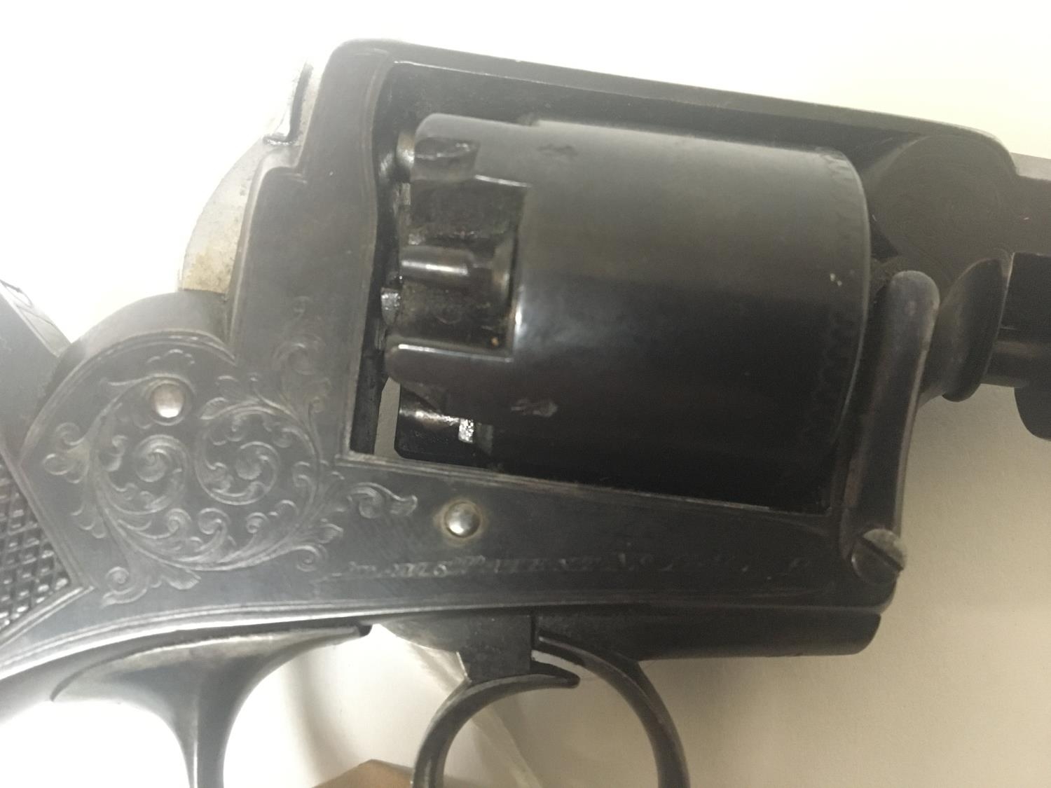 An Antique percussion revolver maker Adams with engraved action patent no 11467. hexagon barrel length 34cm.