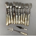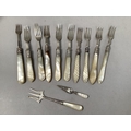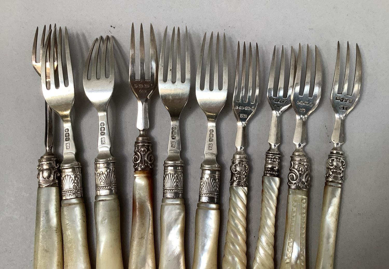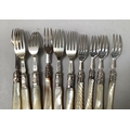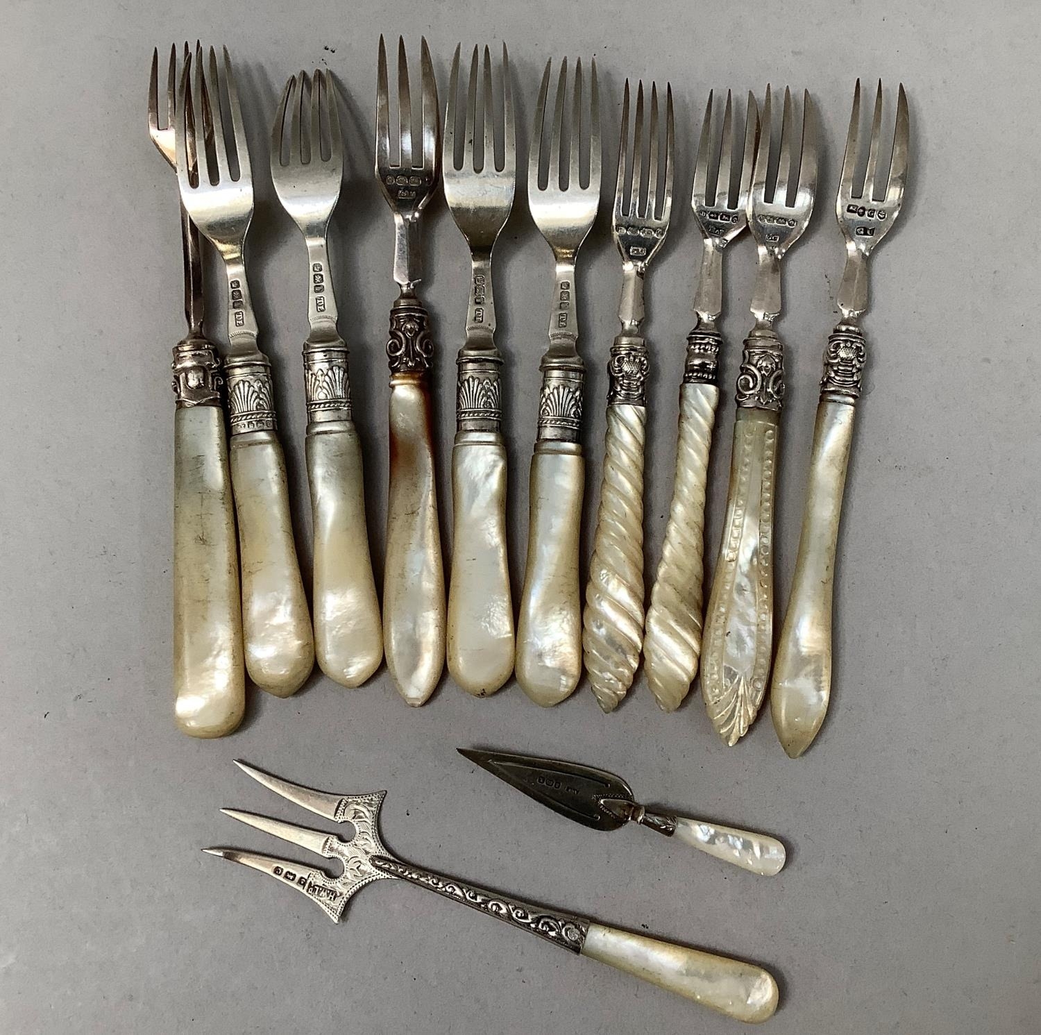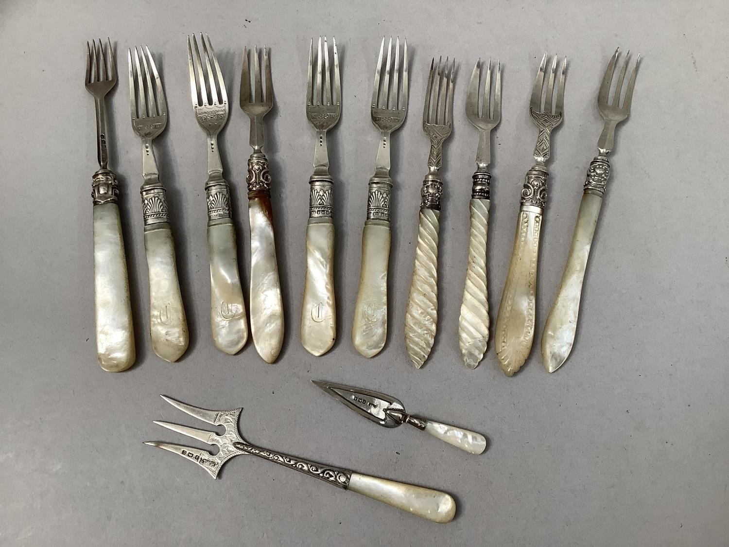 Four Victorian silver forks with mother of pearl handles, Sheffield 1900 for Levesley Brothers together with seven other silver forks with mother of pearl handles and a silver and mother of pearl book mark