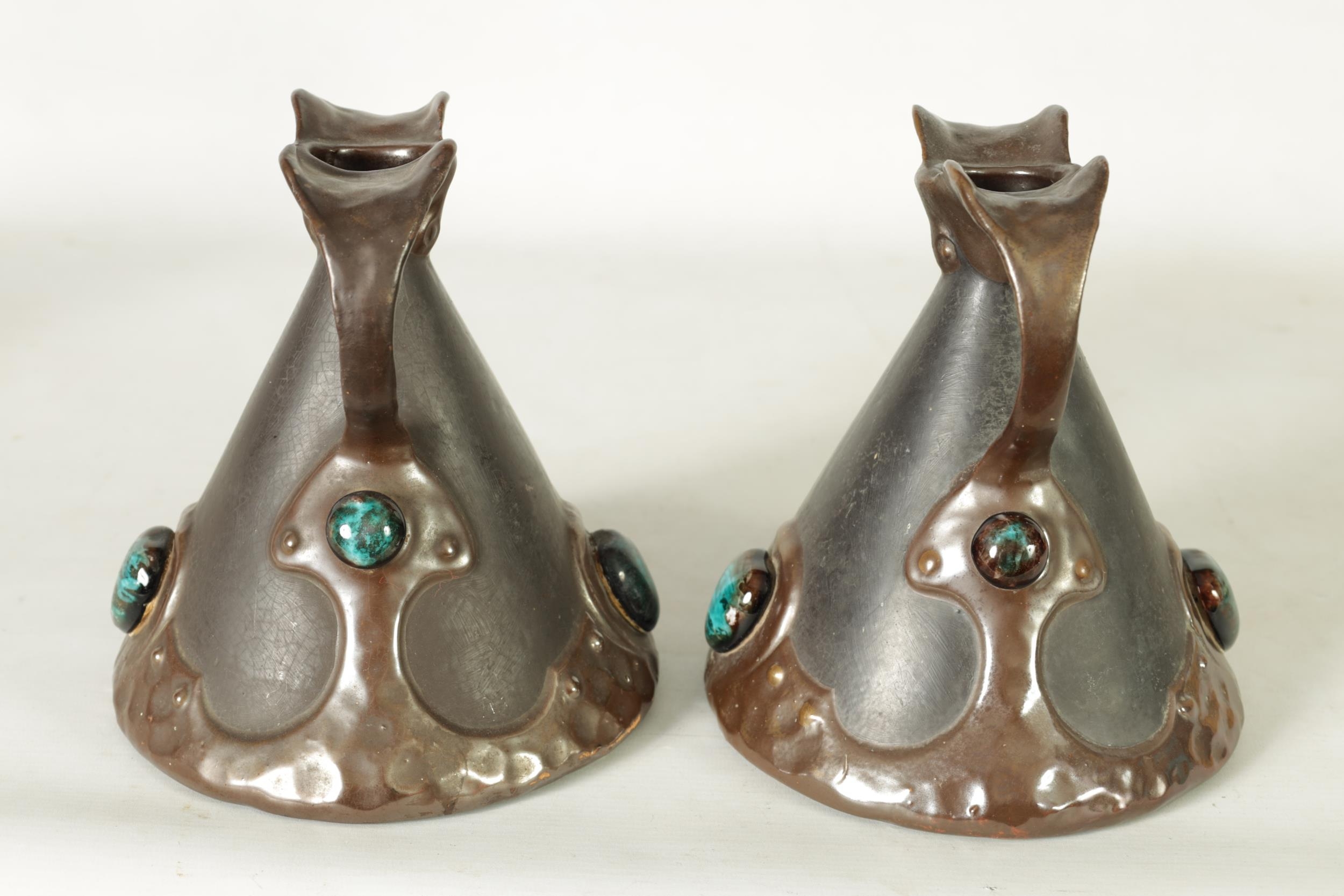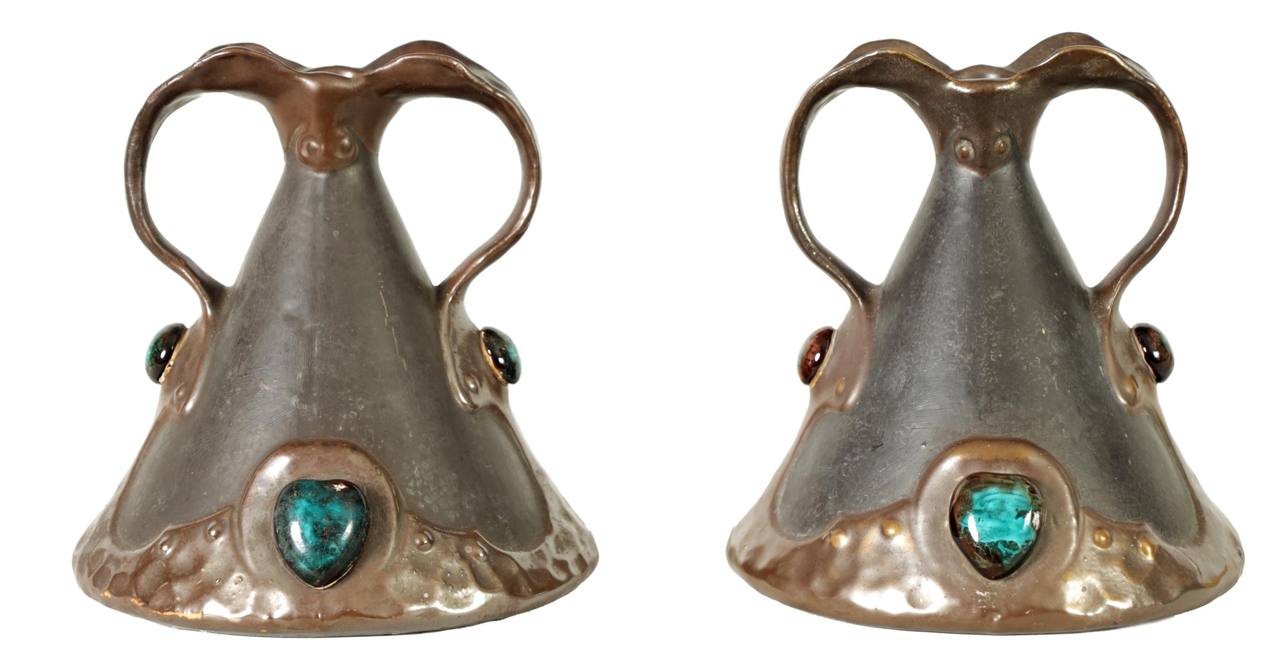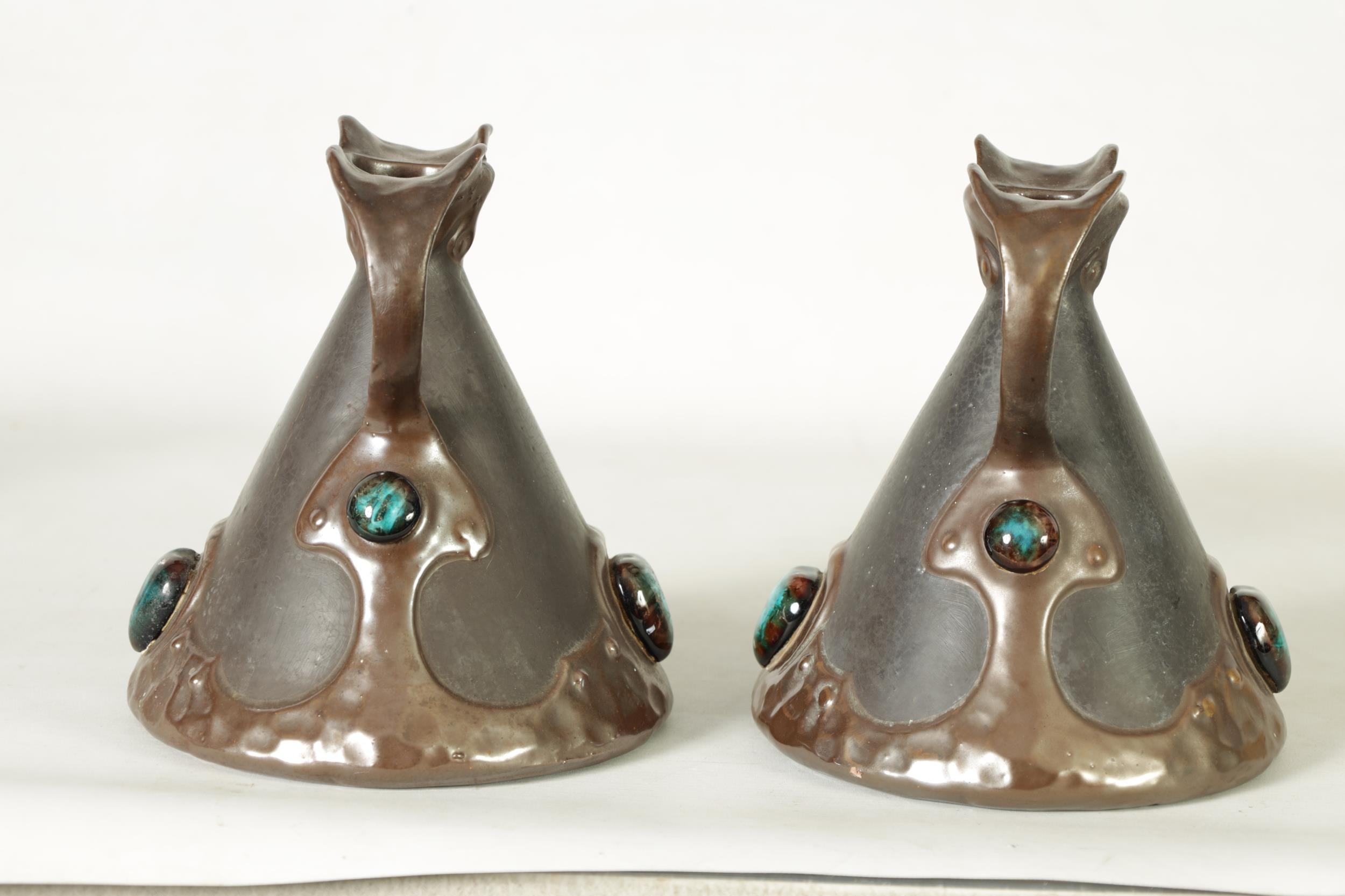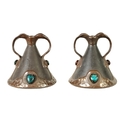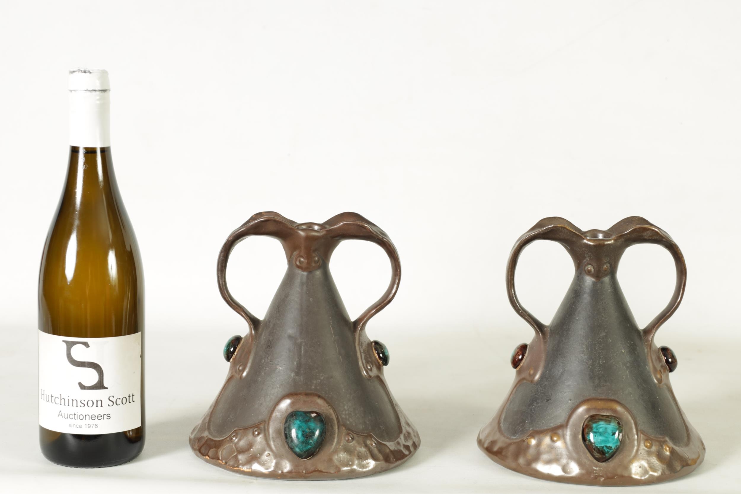 A PAIR OF BRETBY ARTS AND CRAFTS SIMULATED COPPER WARE TWO HANDLED VASES with pinned raised lustrous bindings set with coloured cabochon type mounts - impressed marks beneath (20cm high)