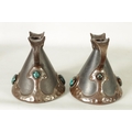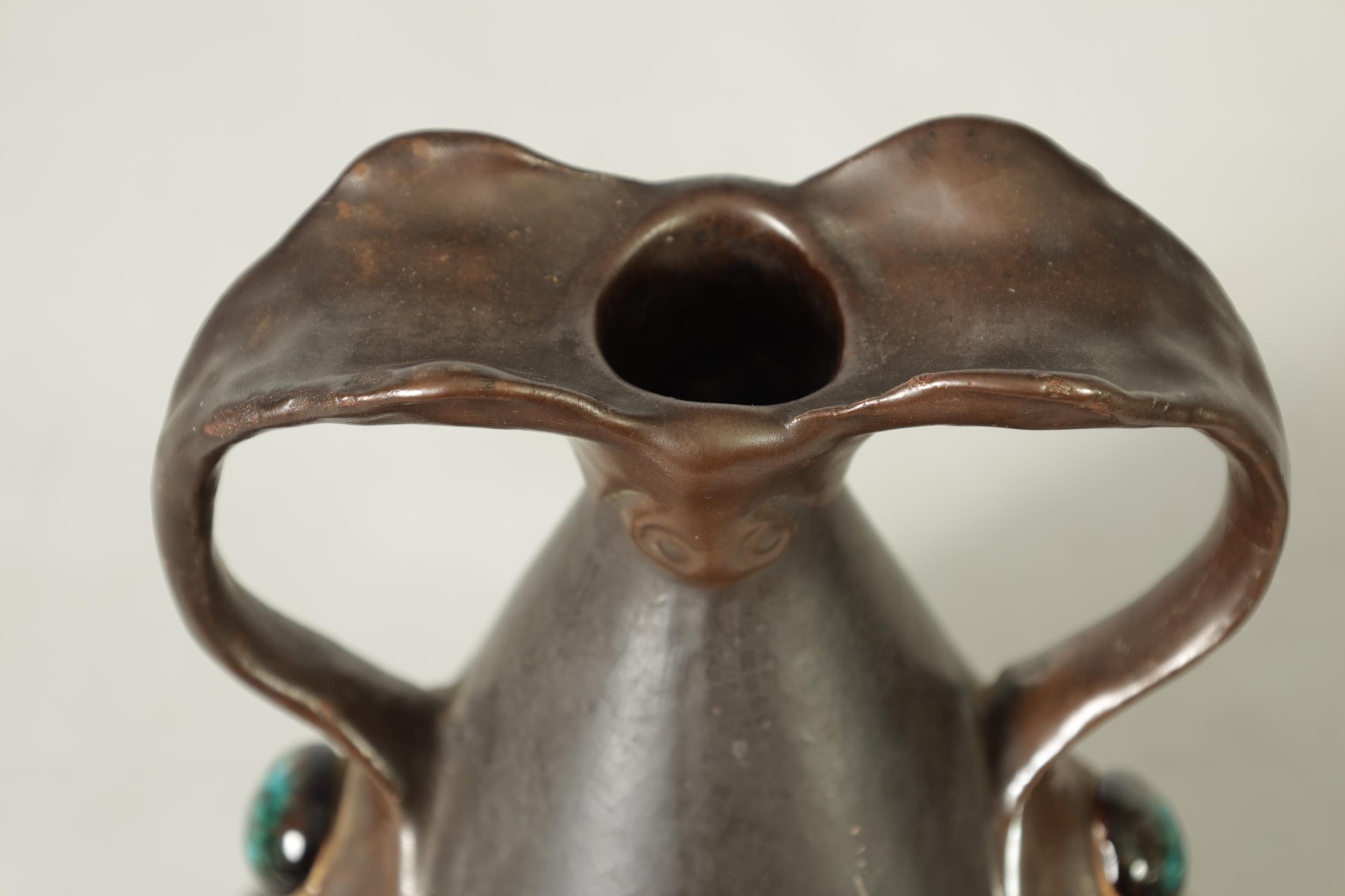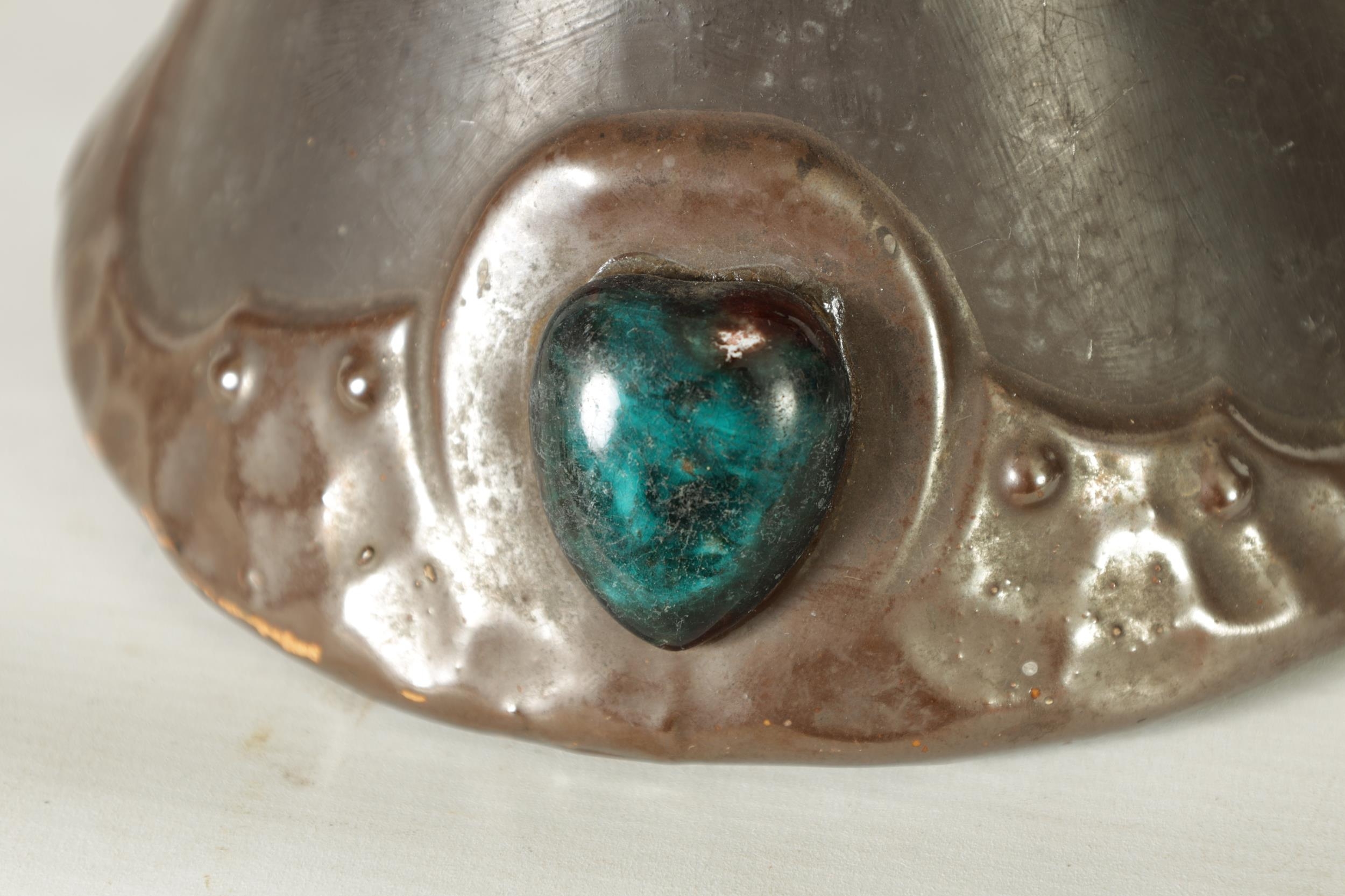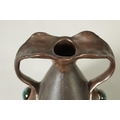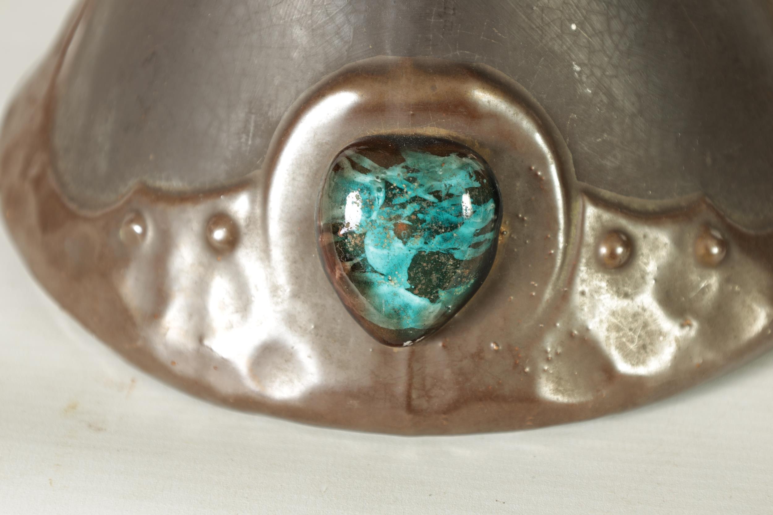 A PAIR OF BRETBY ARTS AND CRAFTS SIMULATED COPPER WARE TWO HANDLED VASES with pinned raised lustrous bindings set with coloured cabochon type mounts - impressed marks beneath (20cm high)