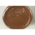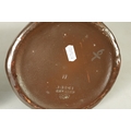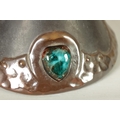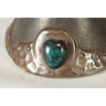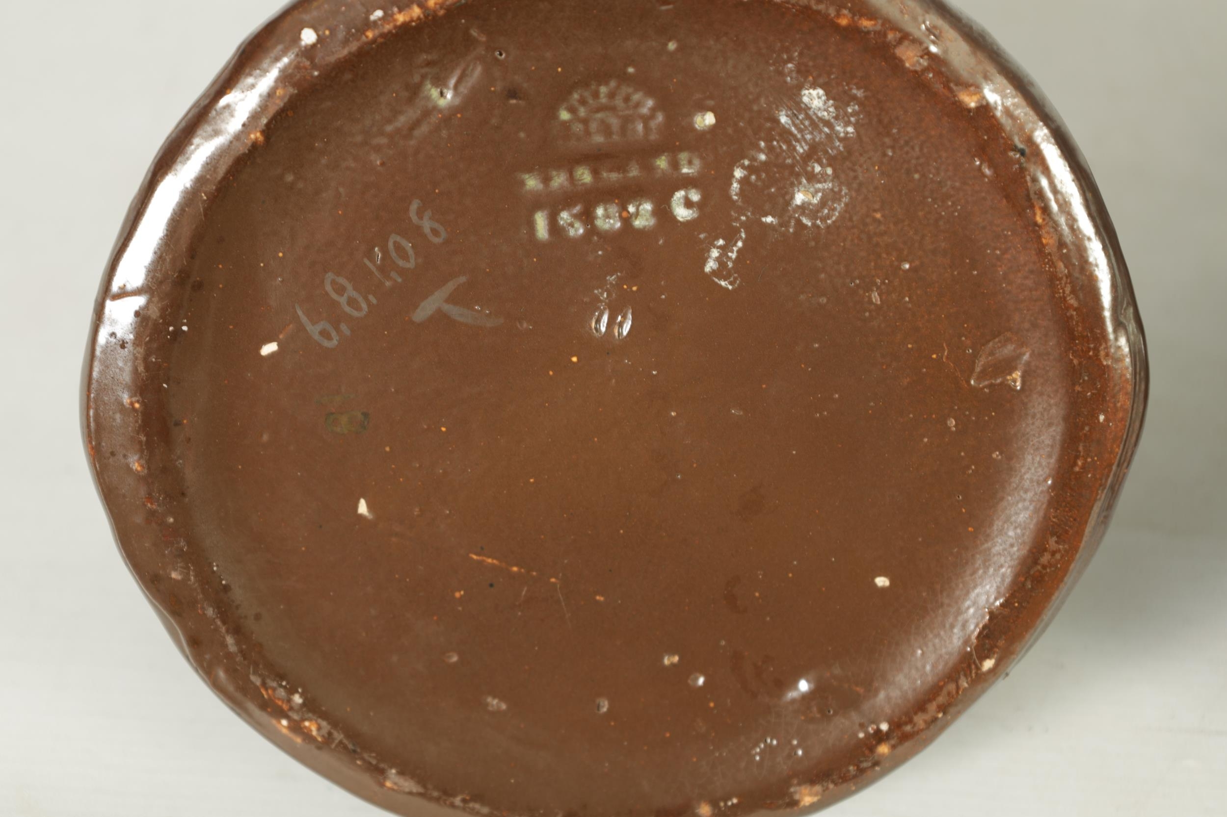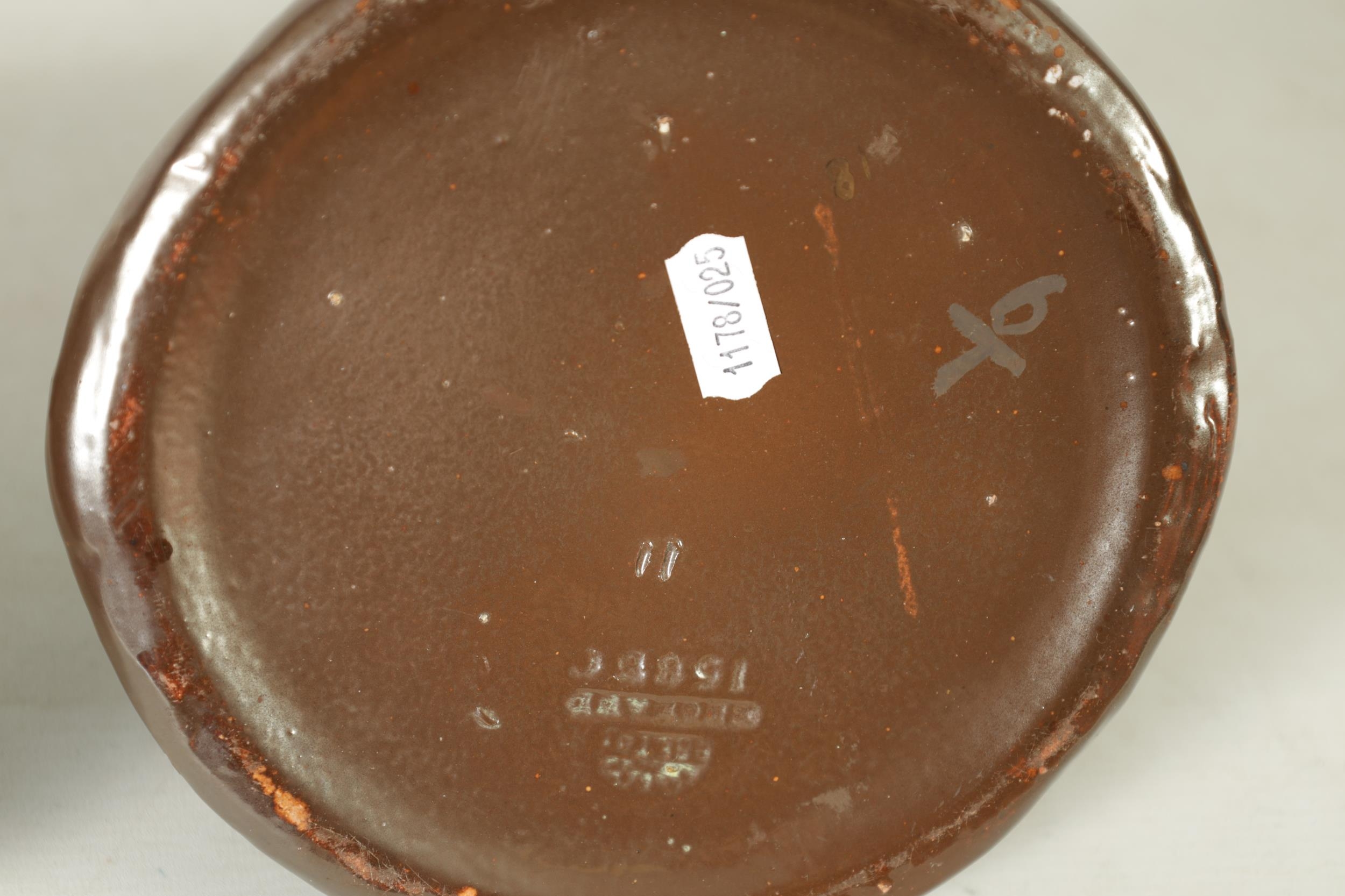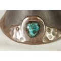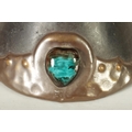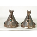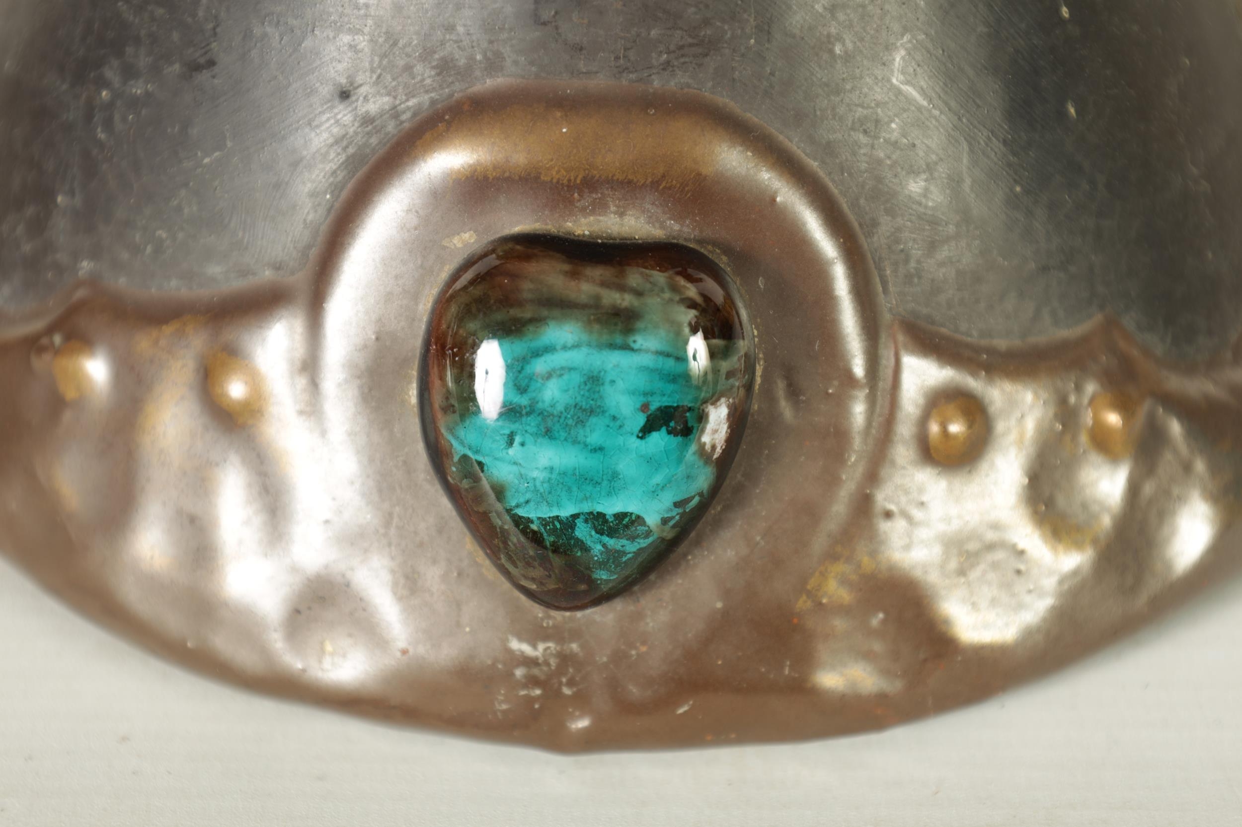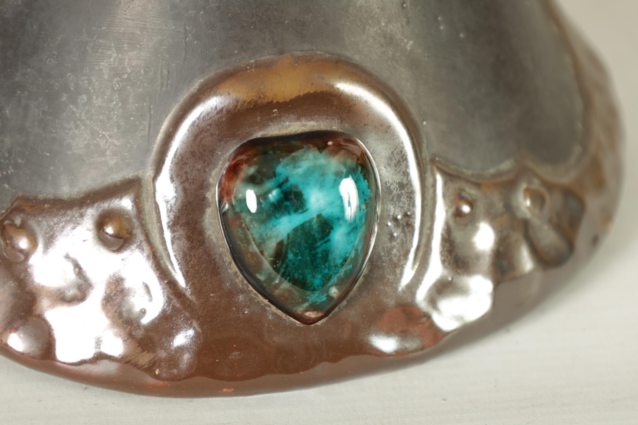 A PAIR OF BRETBY ARTS AND CRAFTS SIMULATED COPPER WARE TWO HANDLED VASES with pinned raised lustrous bindings set with coloured cabochon type mounts - impressed marks beneath (20cm high)