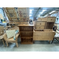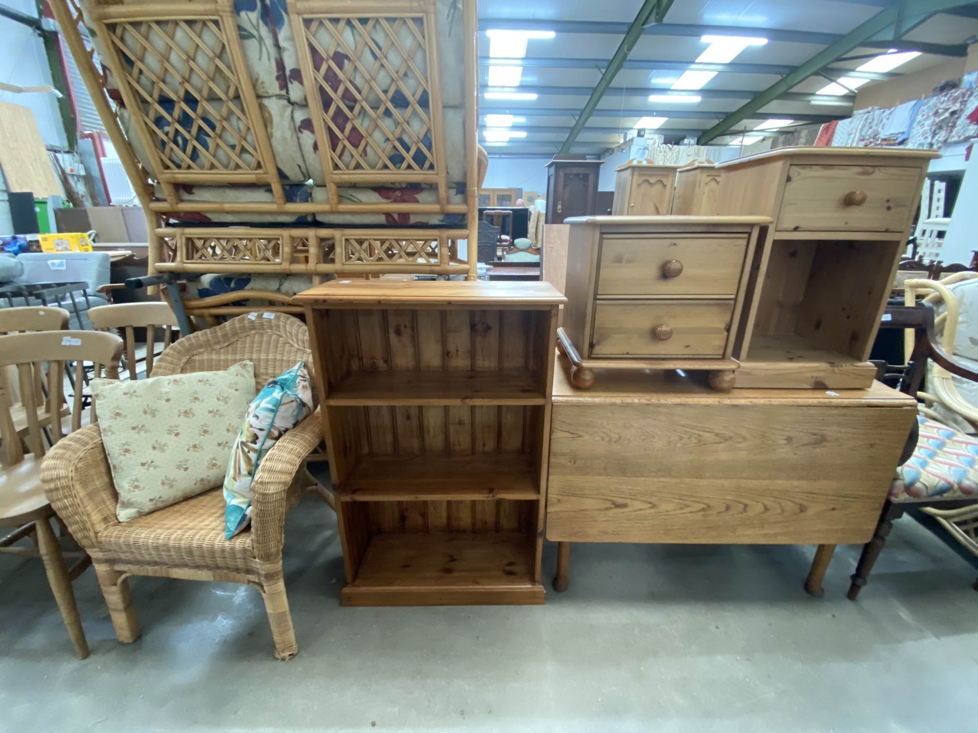 Oak drop leaf table 73H 101W 45-135D, pine two drawer bedside chest 47H 46W 39D, pine bedside cupboard 63H 41W 33D, a pine bookcase 102H 66W 26D & a wicker chair 69W