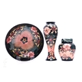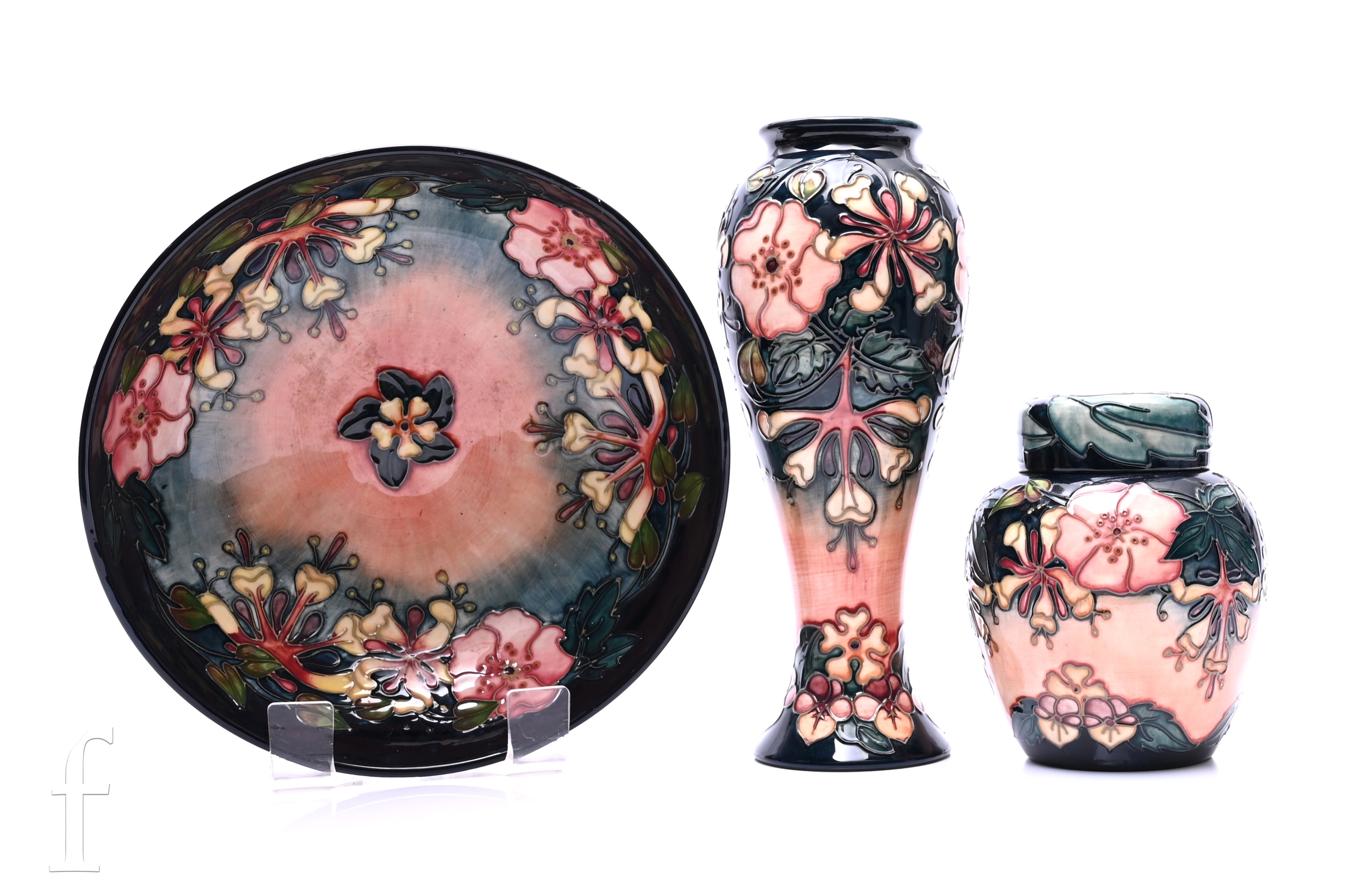 Rachel Bishop for Moorcroft, an 'Oberon' pattern vase, circa 1993, of inverse baluster form, tubeline decorated with flower heads and honeysuckle in tonal pinks and green over graded teal to salmon pink ground, painted and impressed marks to base, height 27cm, together with ginger jar and cover and a circular fruit bowl, diameter 26cm, all marked as second quality. (3)