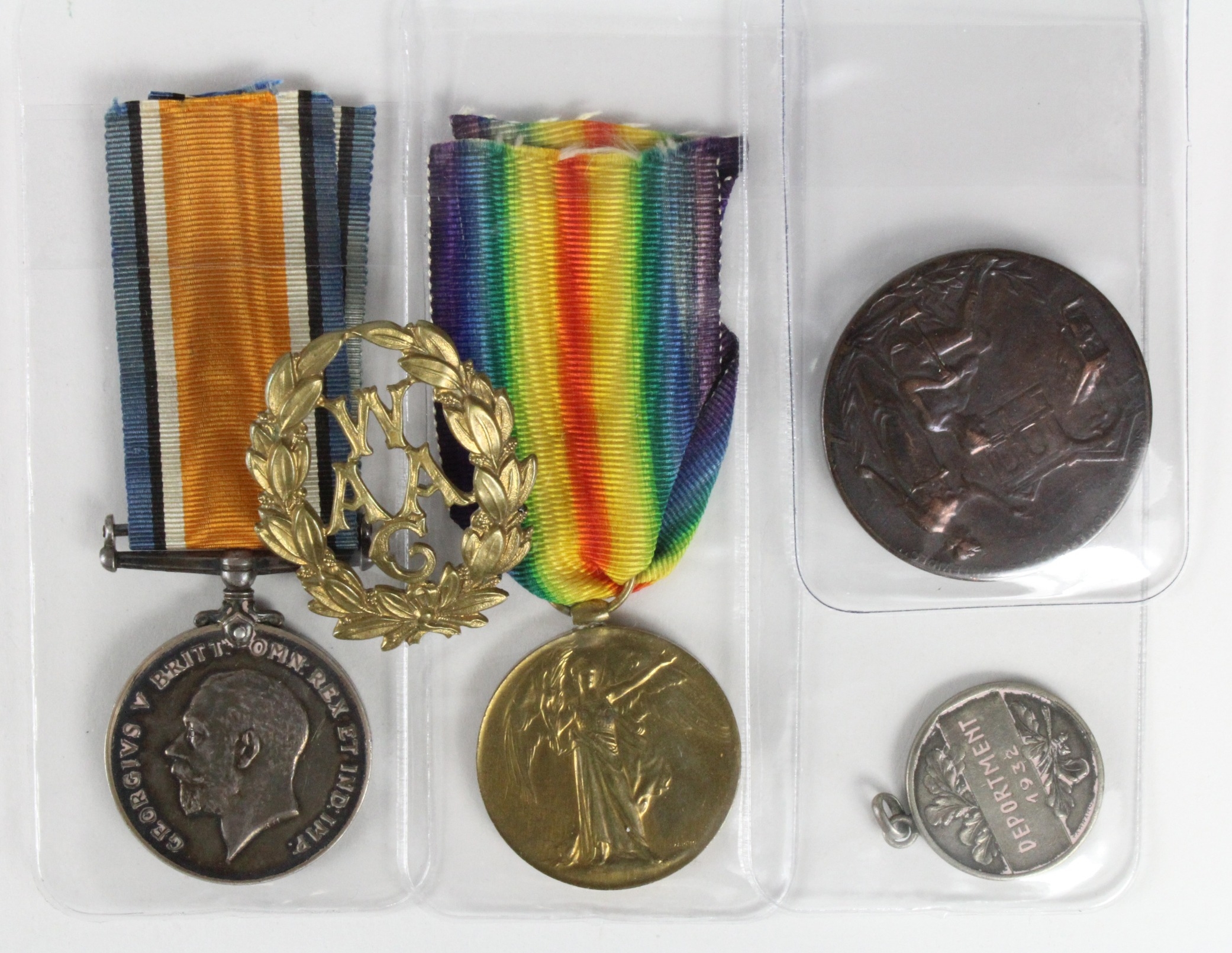 BWM & Victory Medal (2640 Wkr G A Stone QMAAC) Gladys Ada Stone born Heath, Coseley, Staffordshire. Photocopy of her Brasilian Photo ID Cards while working at the British Consulate, Montevideo. Plus a Montevideo 1906 bronze Tram medallion !