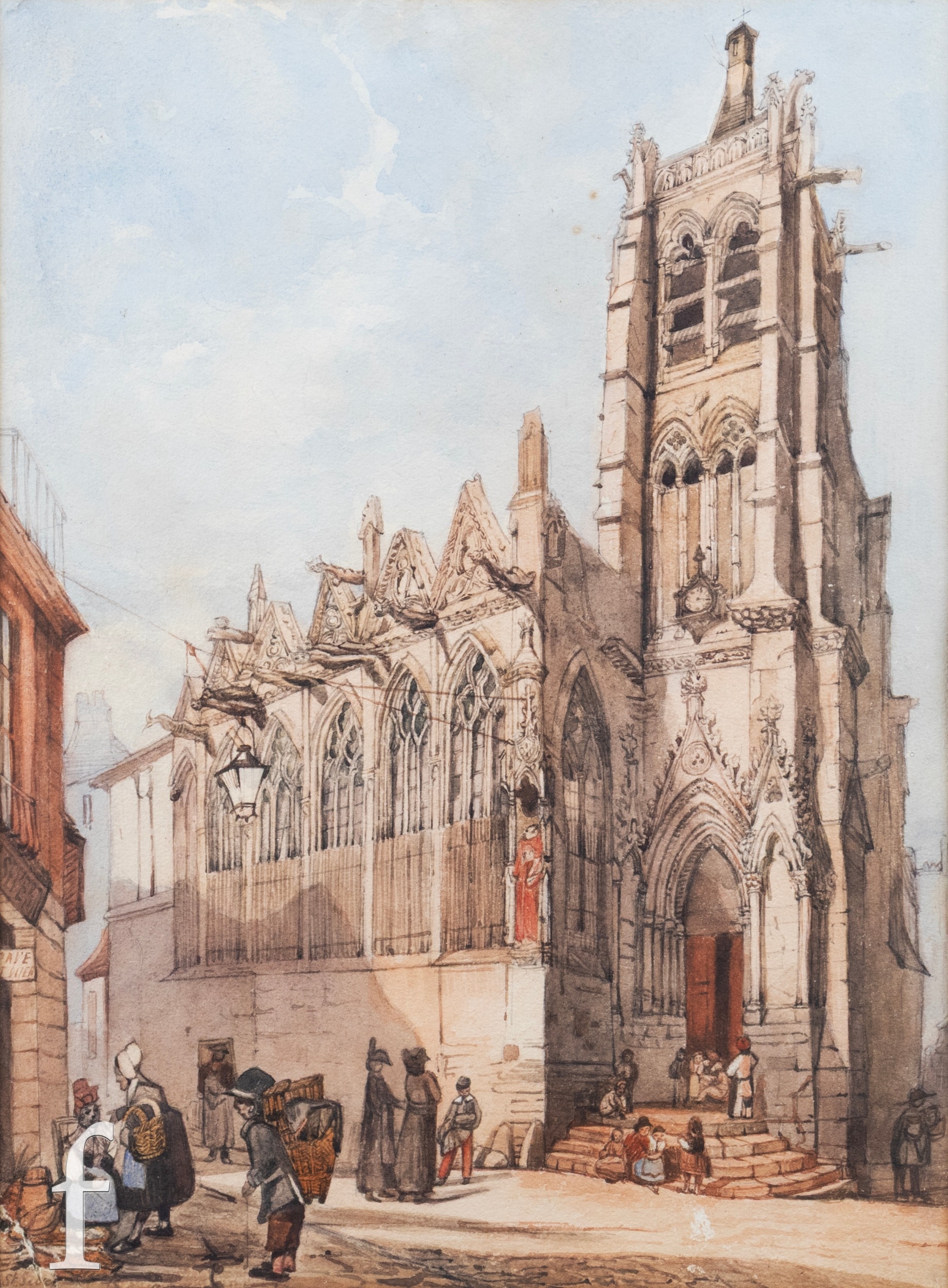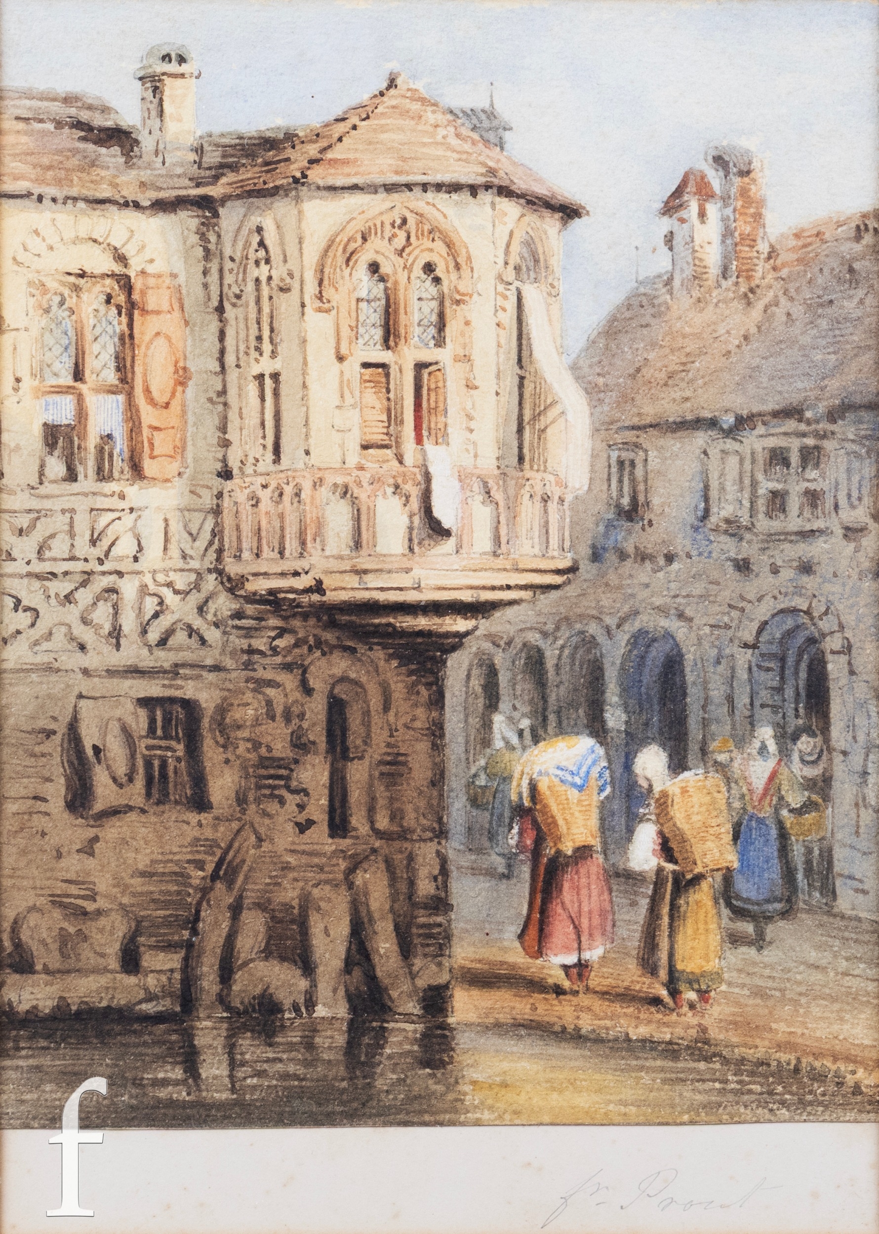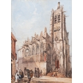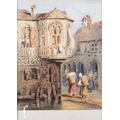 Follower of Samuel Prout (1783-1852) - Figures standing before a church, watercolour, framed, 37cm x 26cm, frame size 52cm x 41cm, also one other watercolour after the same hand. (2)