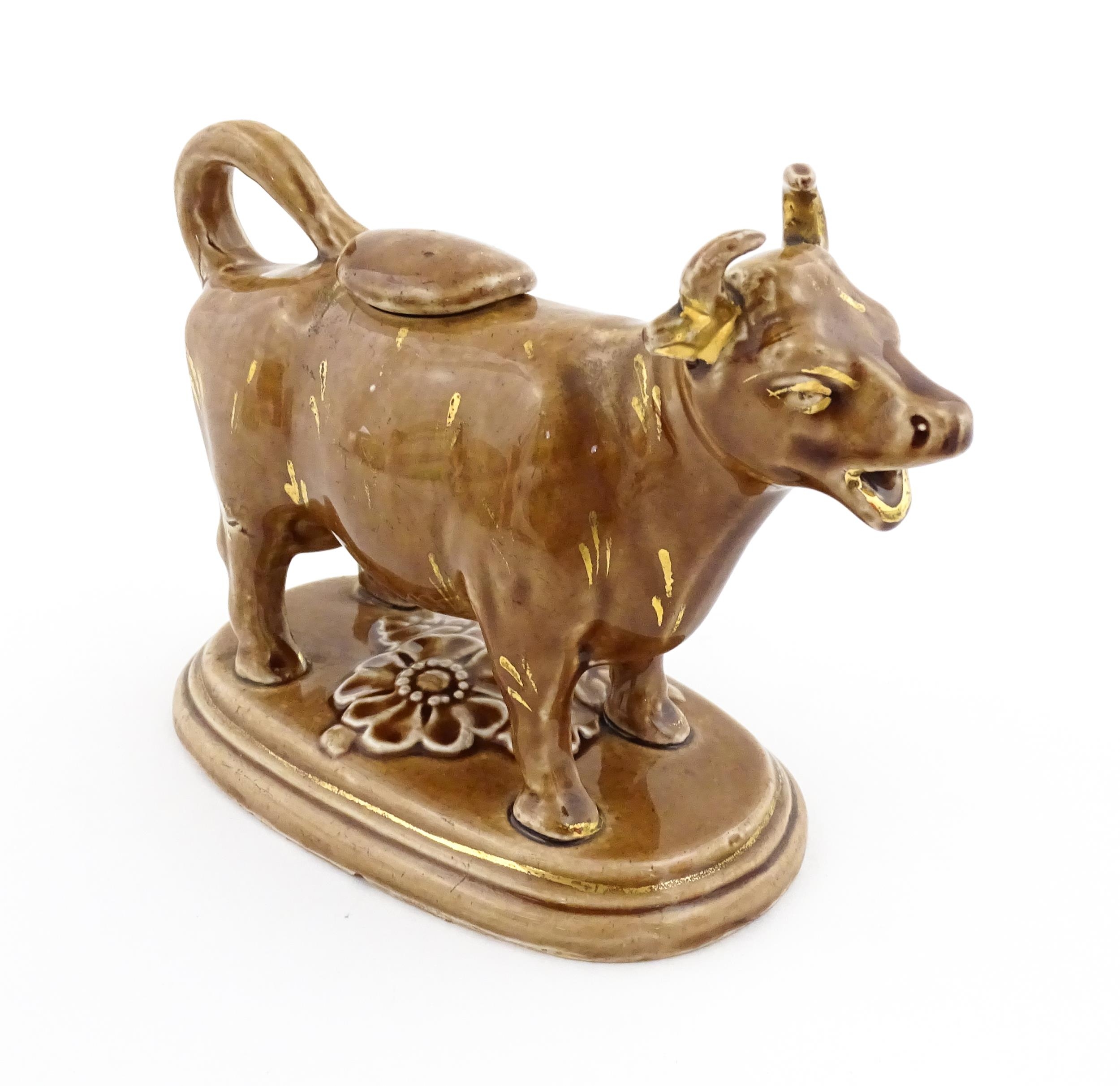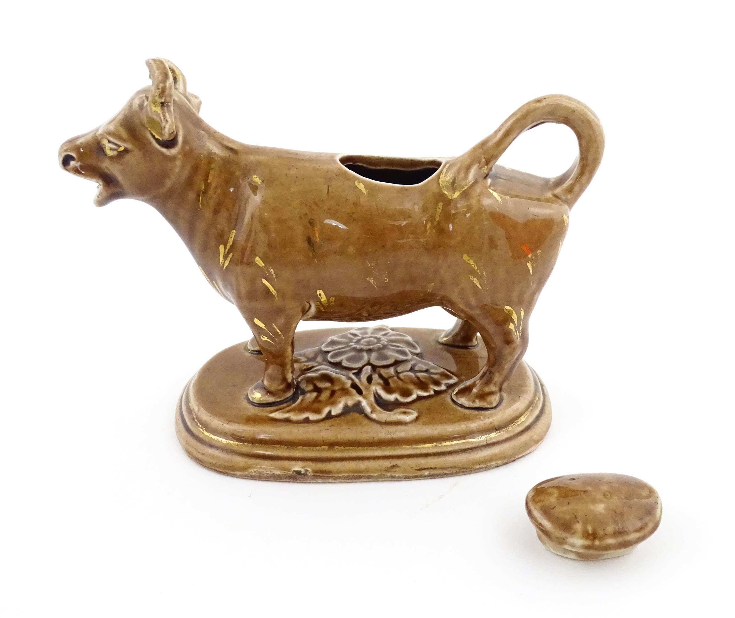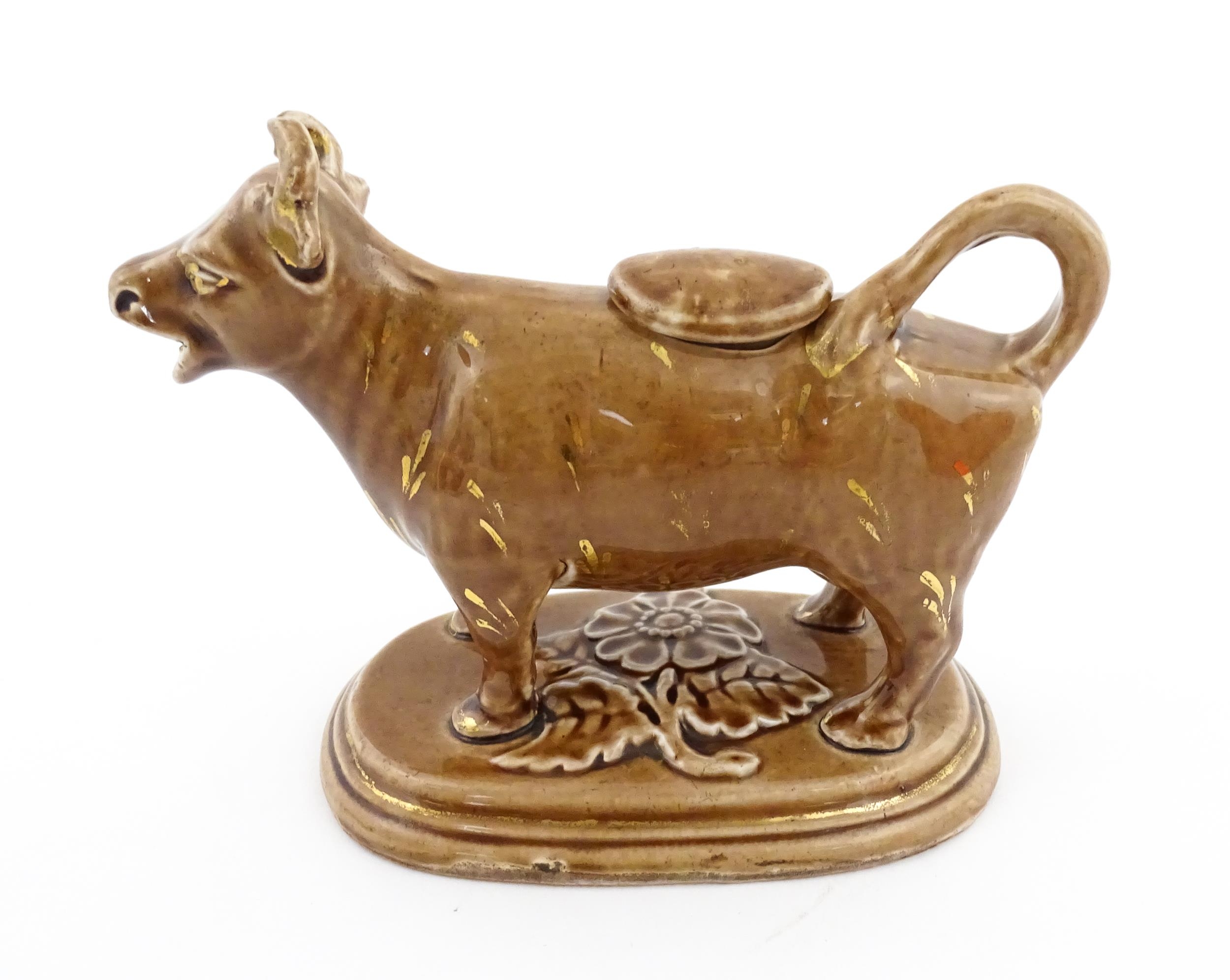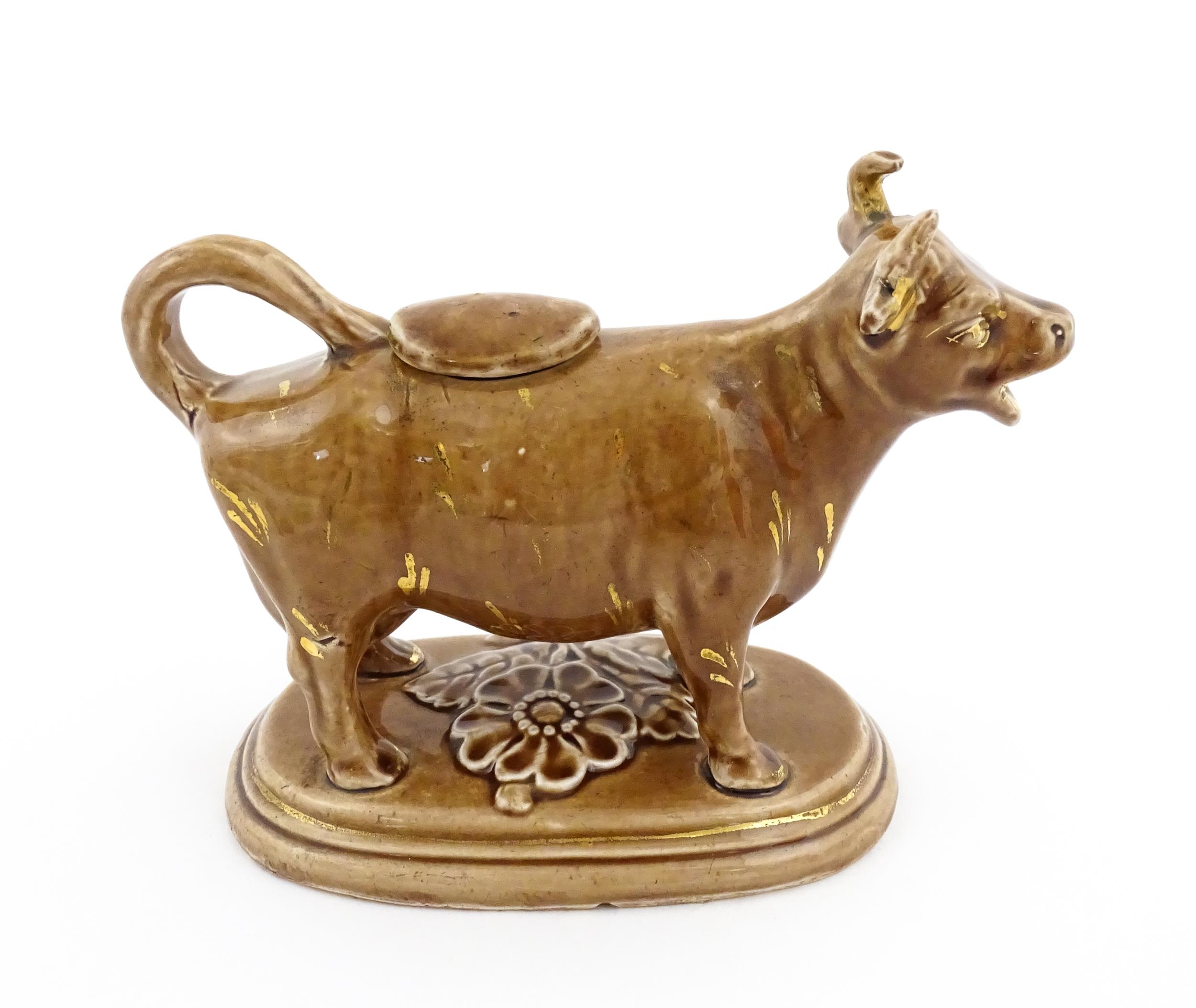 A Staffordshire cow creamer with gilt highlights, the oval base with flower detail. Approx. 6 1/4" long