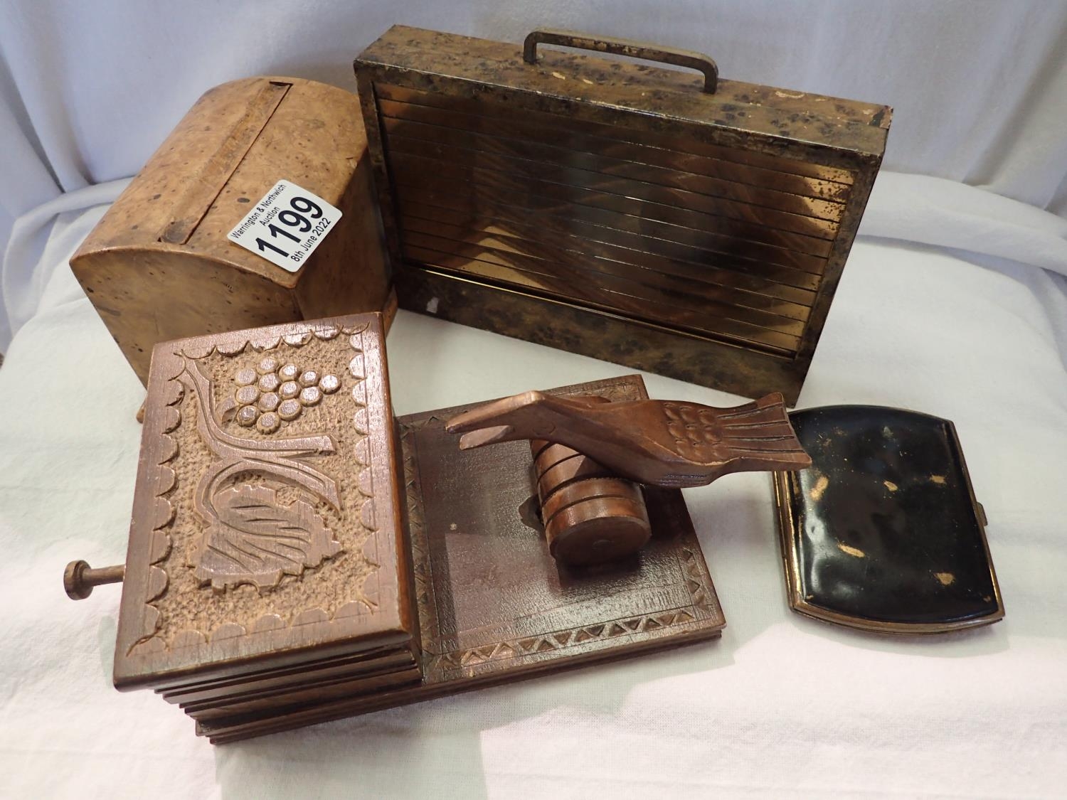 Two wooden cigarette boxes, a metal example and a metal cigarette case. Not available for in-house P&P, contact Paul O'Hea at Mailboxes on 01925 659133
