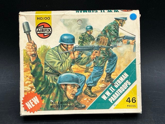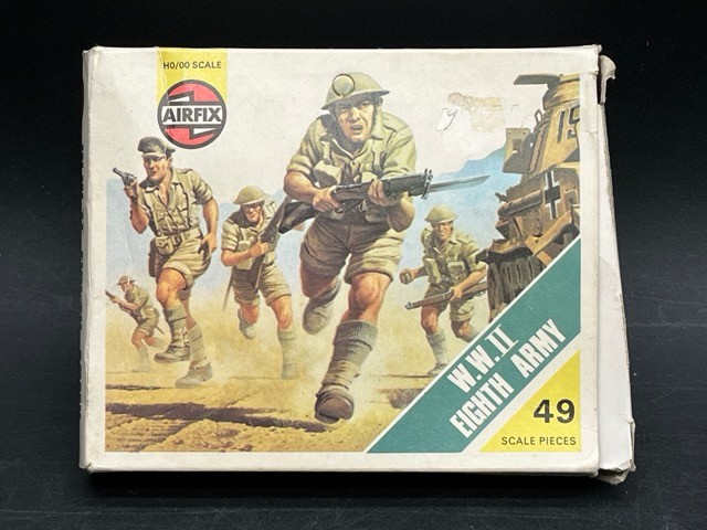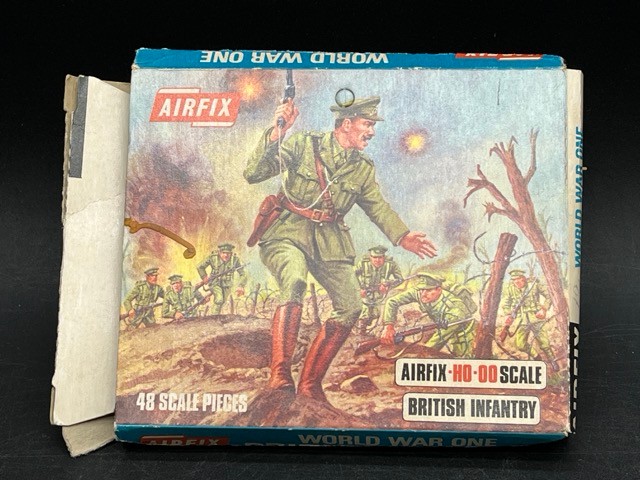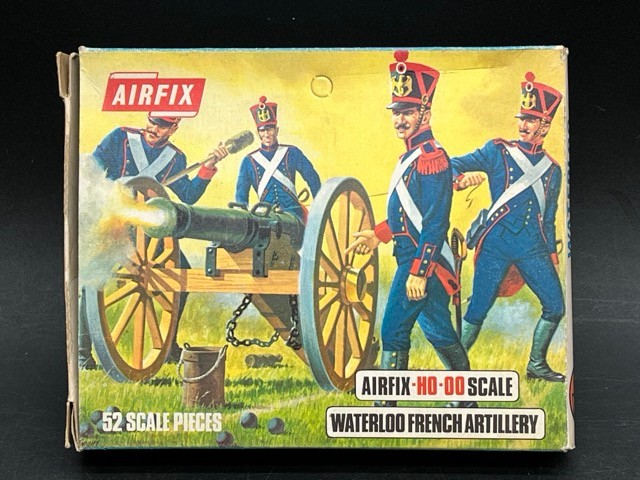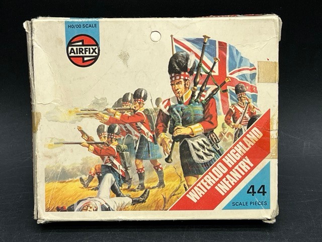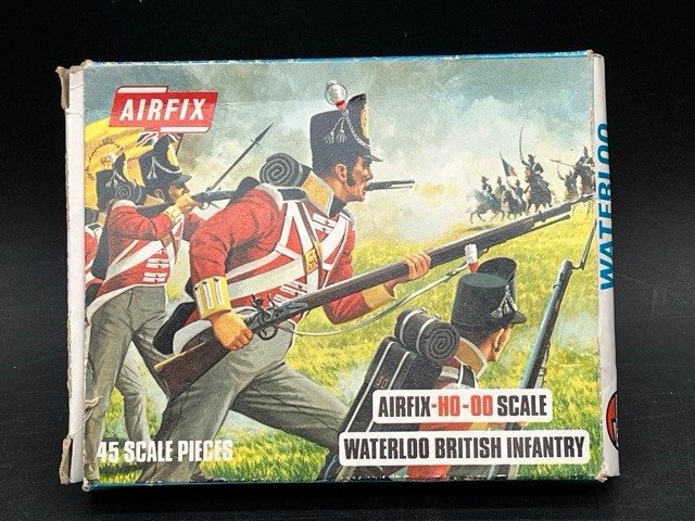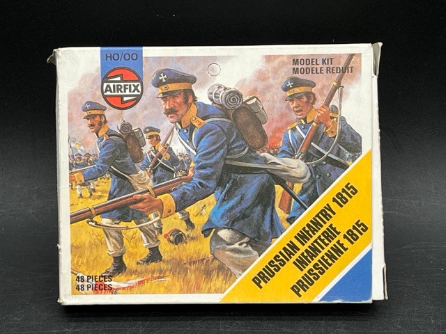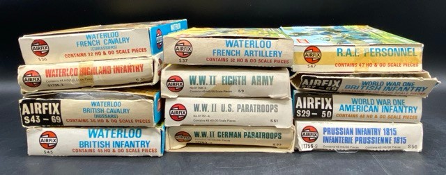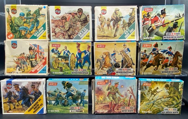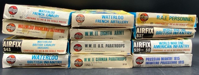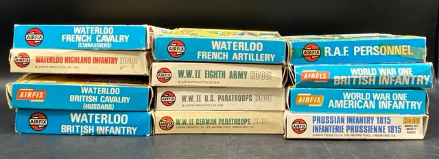 12 Vintage Airfix plastic model figures from Waterloo, WWI, WWII & Prussian military history series. HO/OO Scale. All Opened, but all with figures inside.