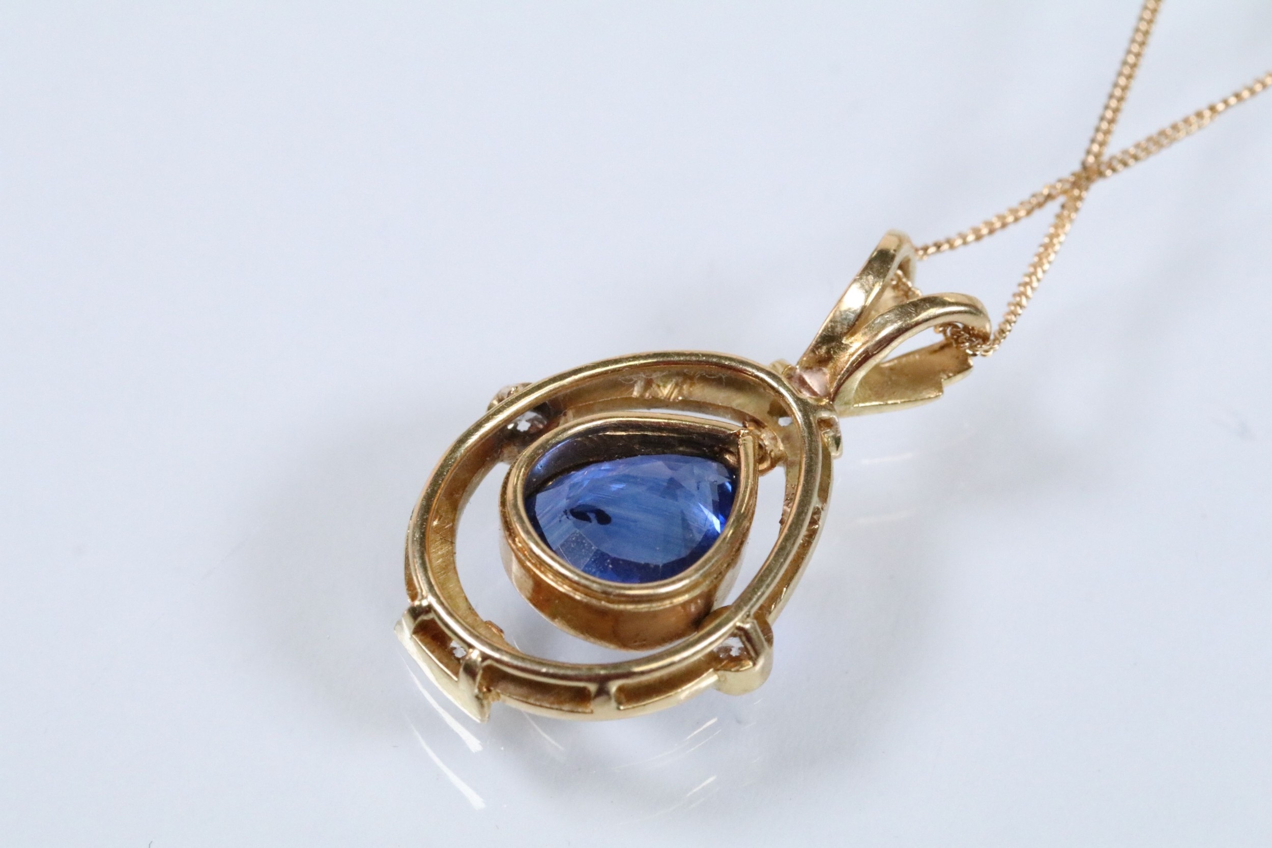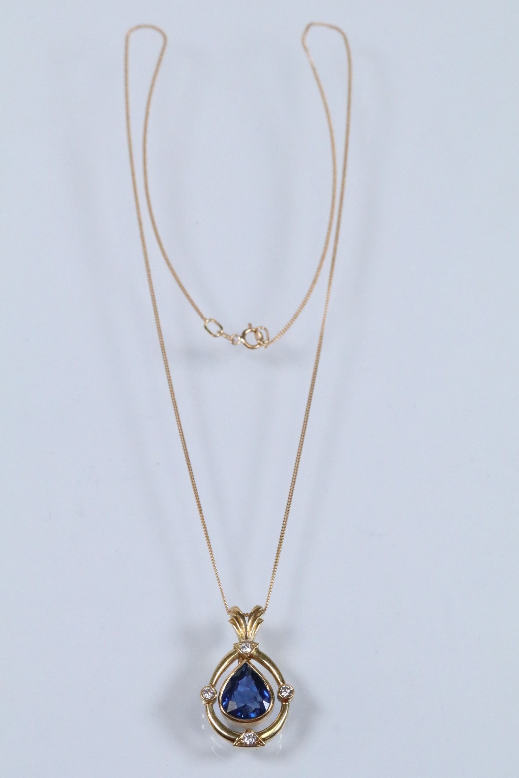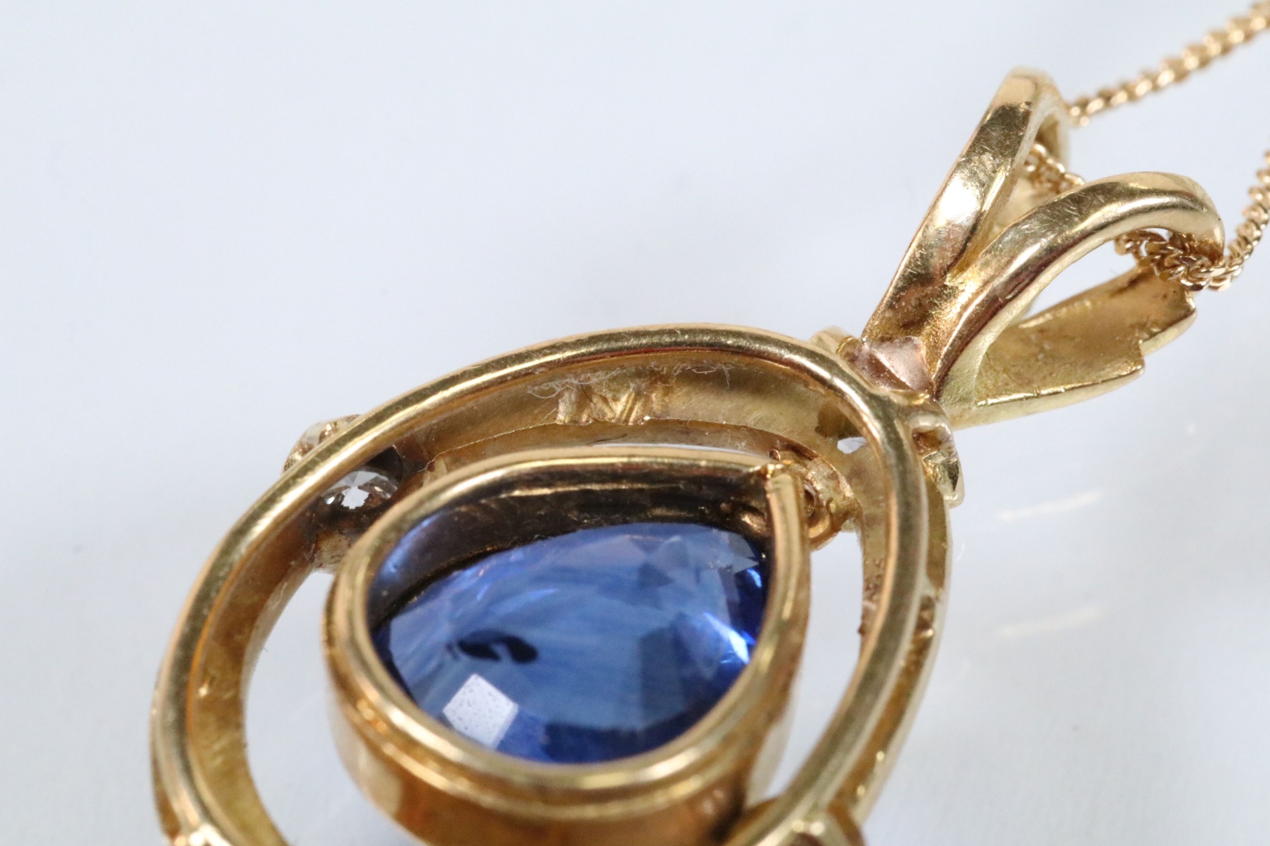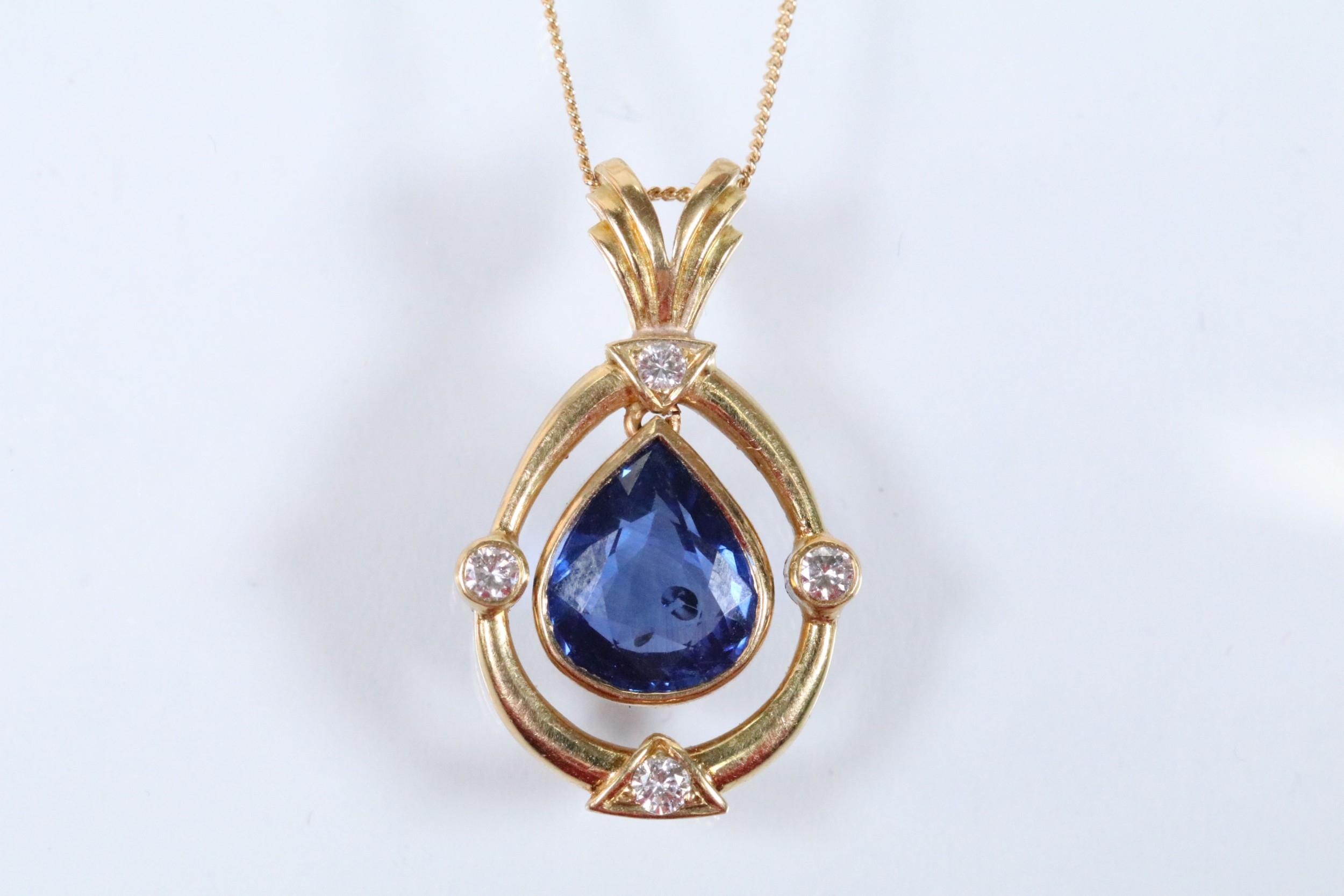 18ct gold, sapphire and diamond pendant necklace. The necklace being bezel set with a mixed pear cut blue sapphire to the centre and four further round cut diamonds to the mount. All set to a fine link necklace chain with spring ring clasp. Sapphire estimated 2.44ct. Diamonds estimated 0.12ct in total. Chain hallmarked to jump link. Pendant measures 2.5cm.