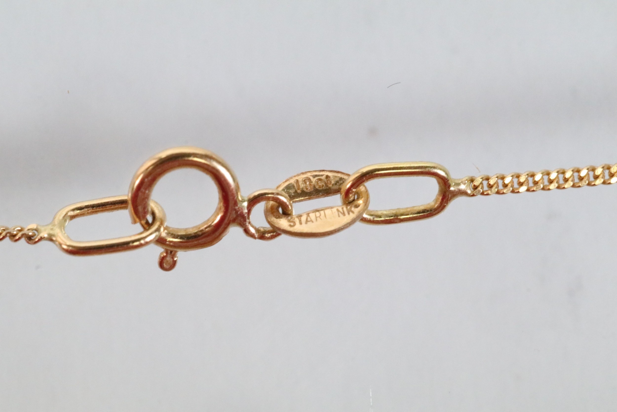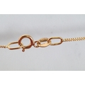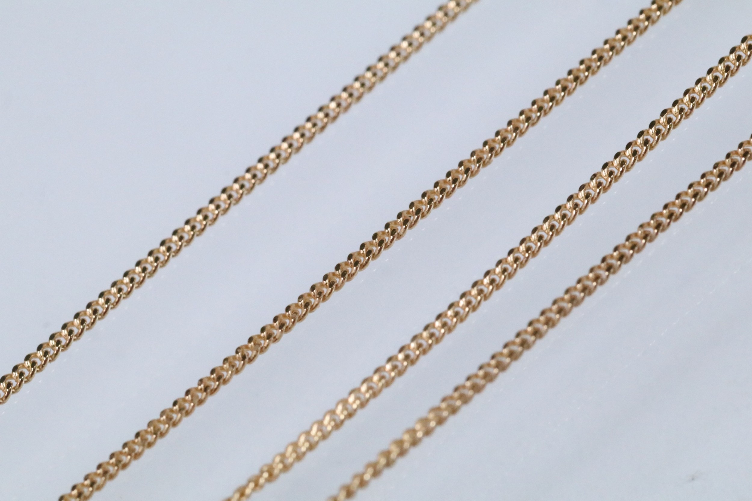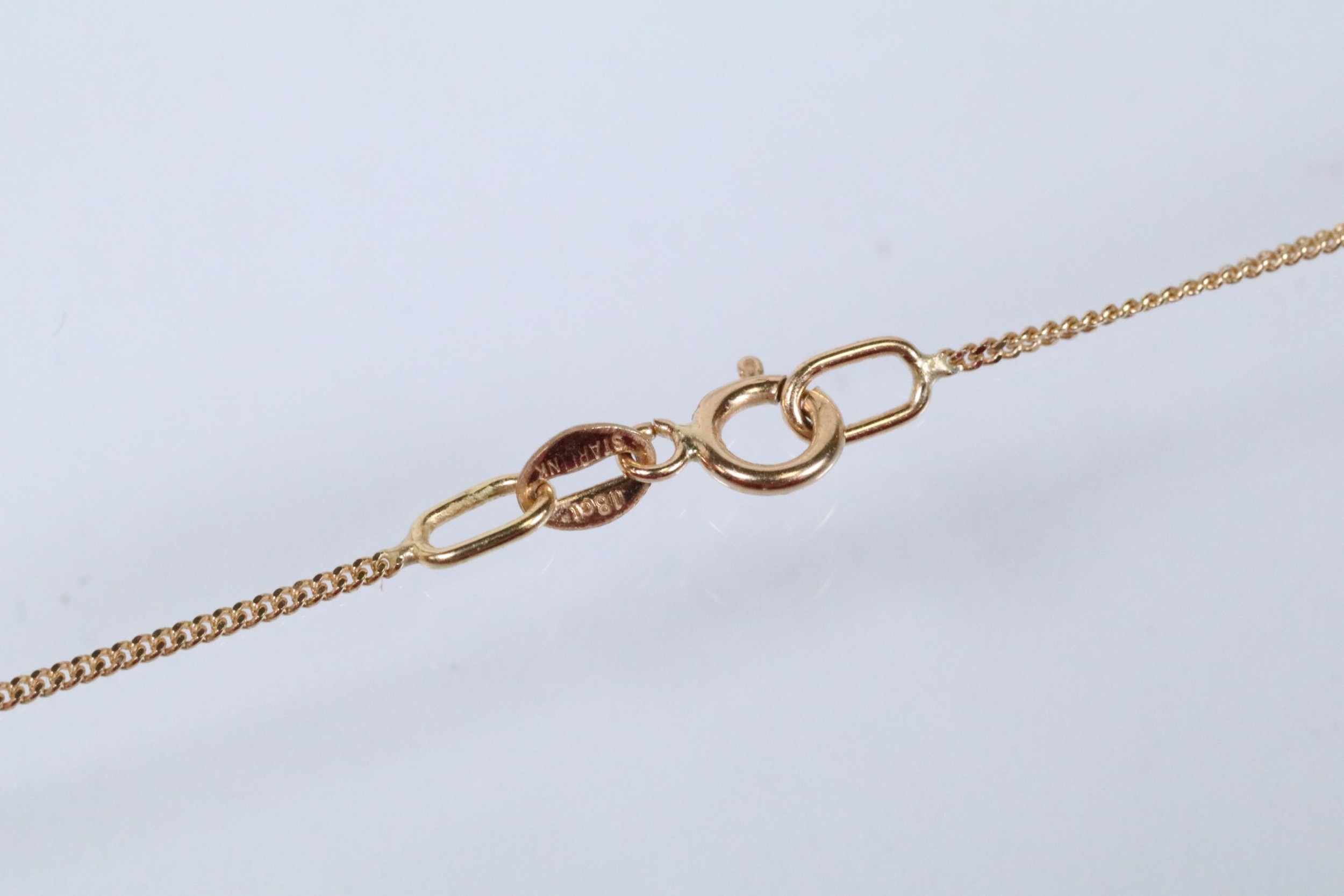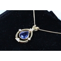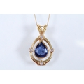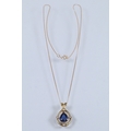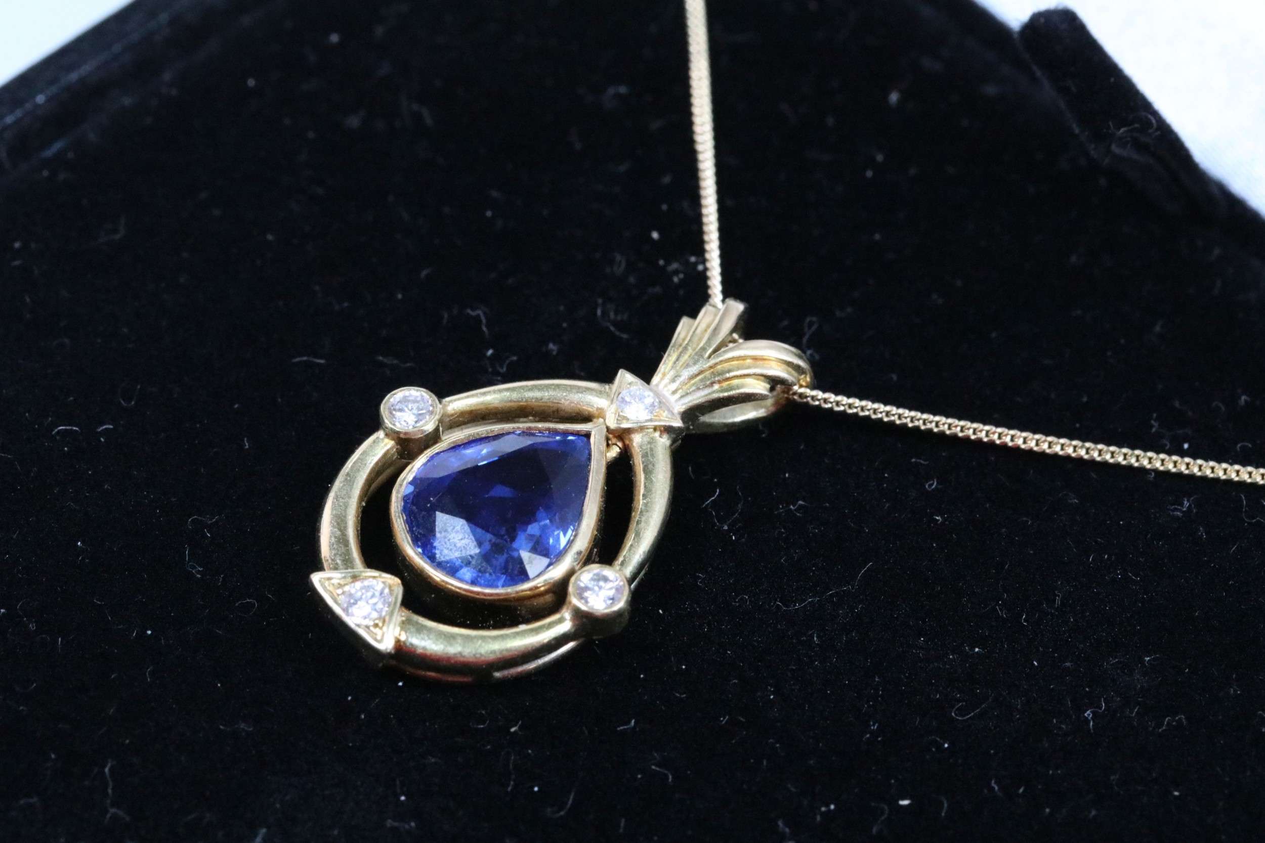 18ct gold, sapphire and diamond pendant necklace. The necklace being bezel set with a mixed pear cut blue sapphire to the centre and four further round cut diamonds to the mount. All set to a fine link necklace chain with spring ring clasp. Sapphire estimated 2.44ct. Diamonds estimated 0.12ct in total. Chain hallmarked to jump link. Pendant measures 2.5cm.