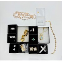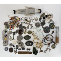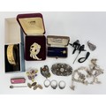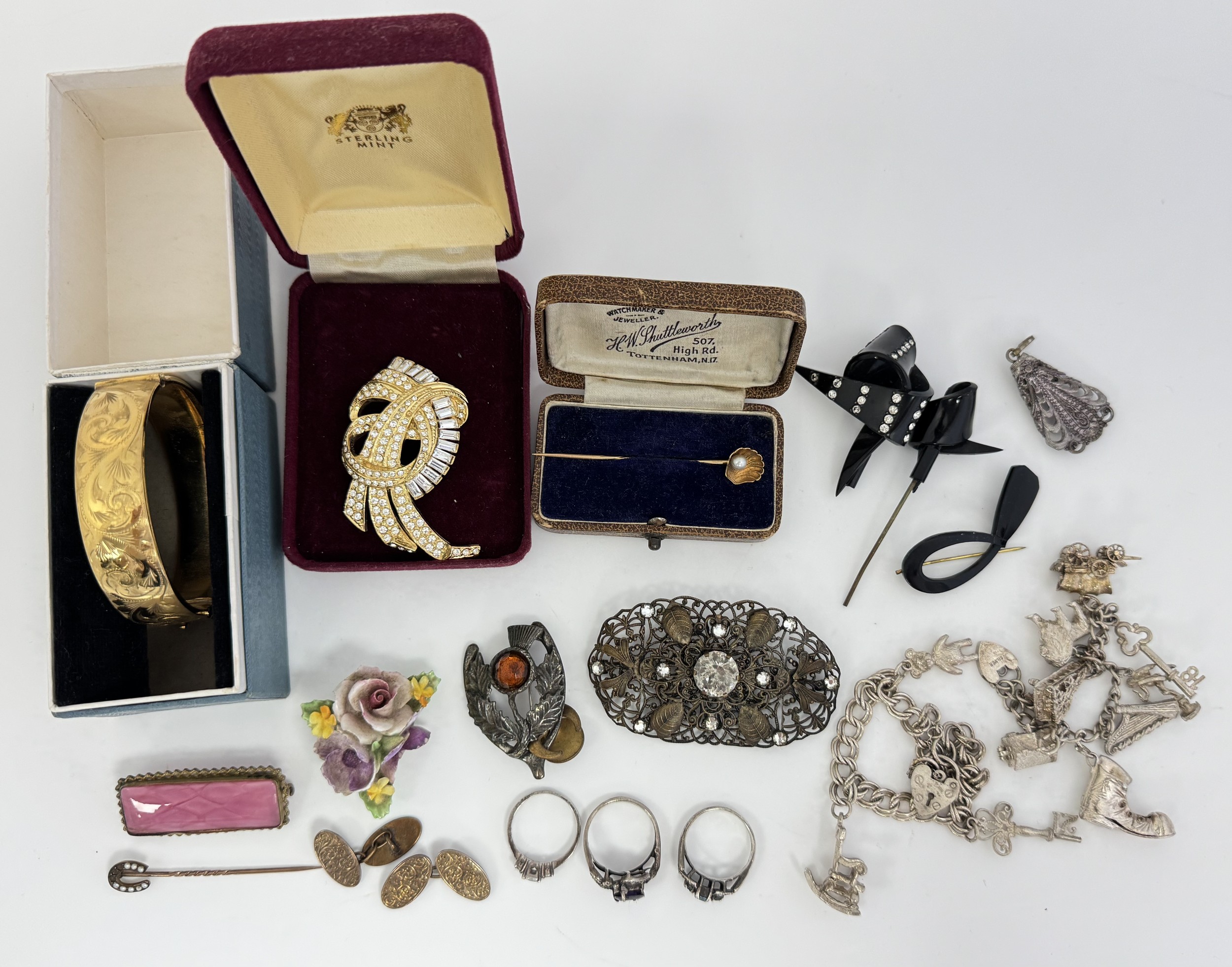 A box of silver and costume jewellery to include two silver charm bracelets, some silver and gem set rings, a 1/5 9ct rolled gold bangle, a boxed scallop shell shaped tiepin with pearl, stamped 15ct, a pair of gold fronted cufflinks, a vintage sterling Mint Princess Royal brooch (stone missing) etc