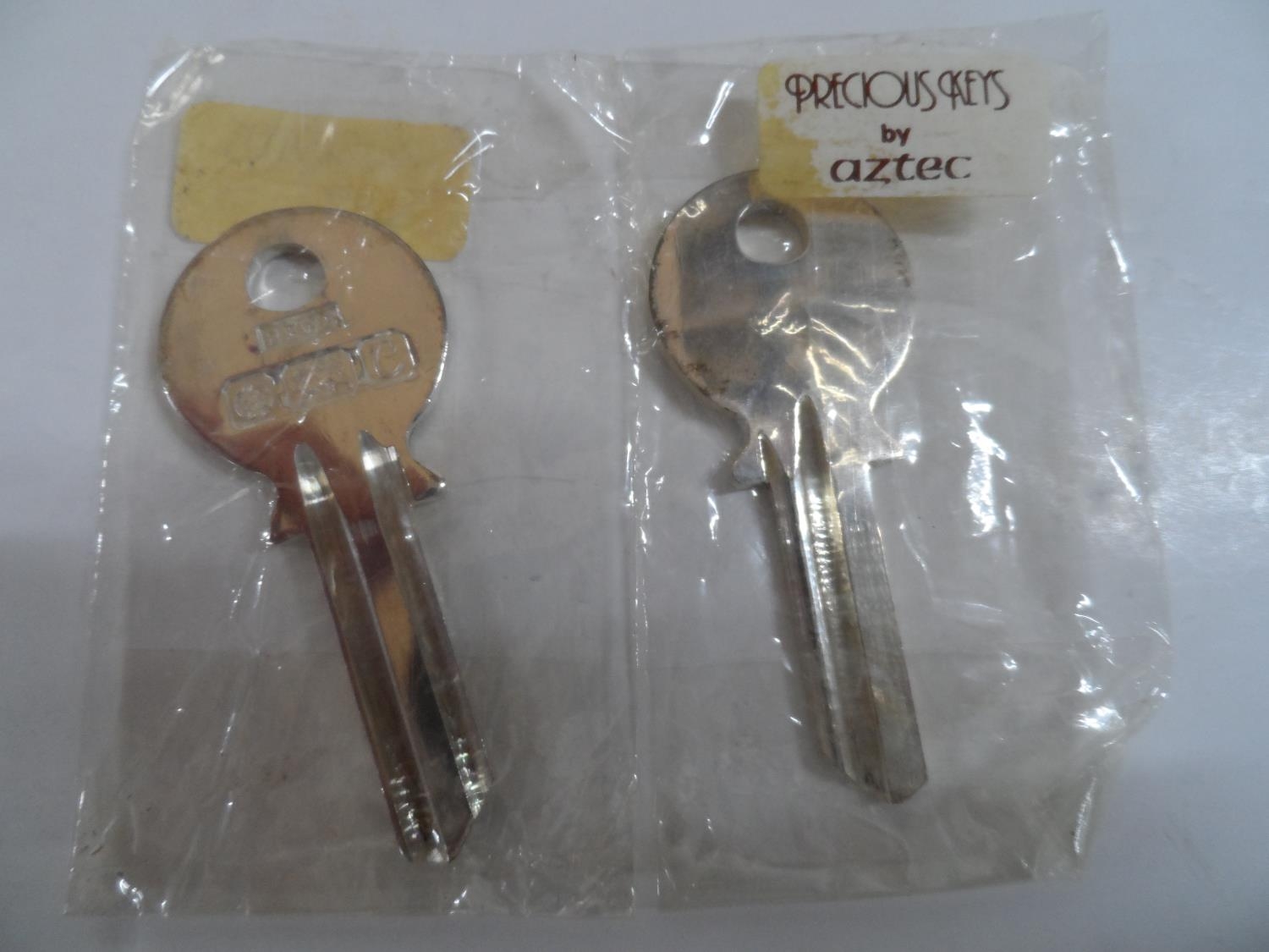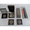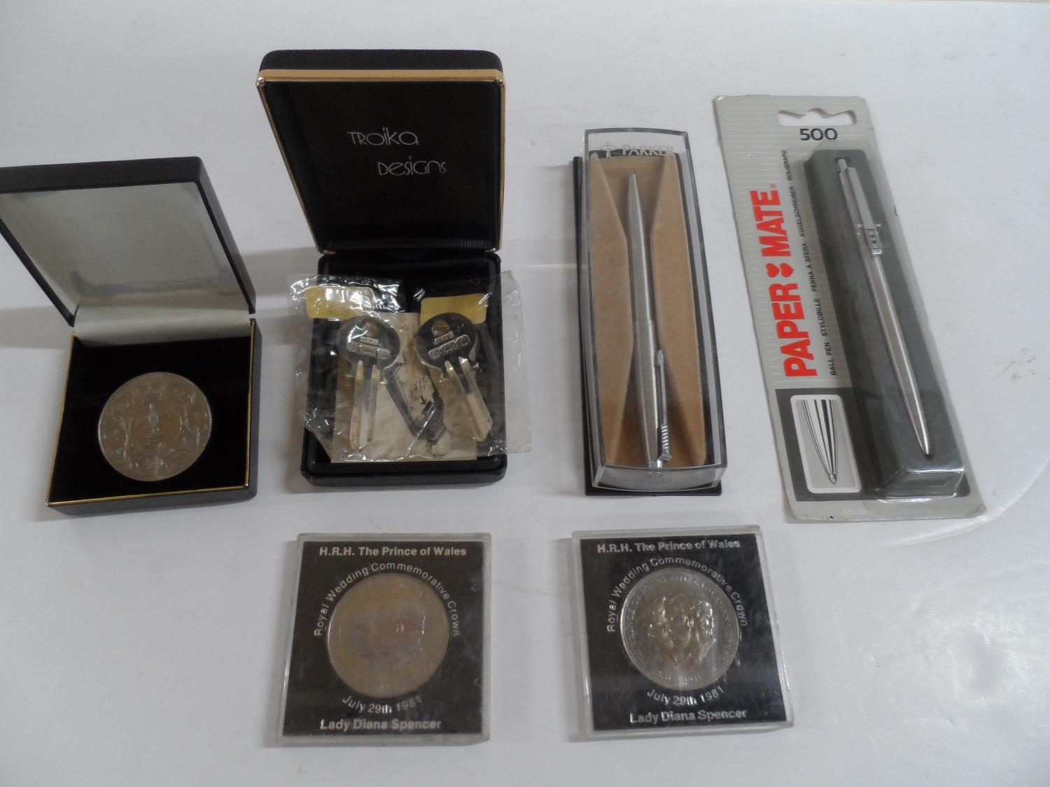 Pair of modern Sheffield silver keys (25 grams) together with packaged Paker & Paper Mate pens and 3 commemorative British coins (lot)