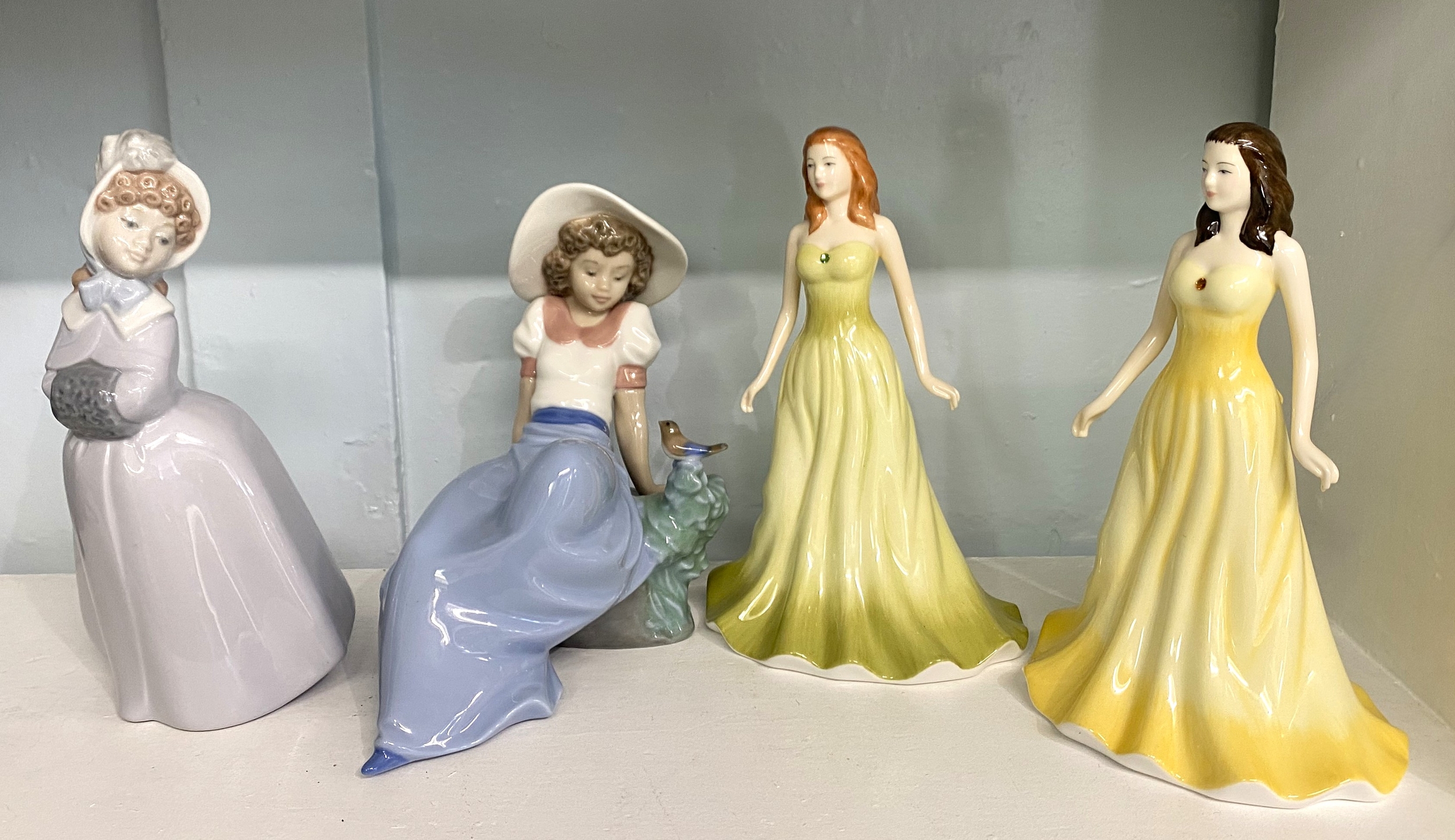 Two Royal Doulton 'The Gemstones Collection' ceramic figures of ladies comprising August Peridot and November Topaz 18cm high, a Nao figure of a lady seated beside a bird 15cm, and a Nadal figure of a young girl wearing a winter coat 18cm (4)