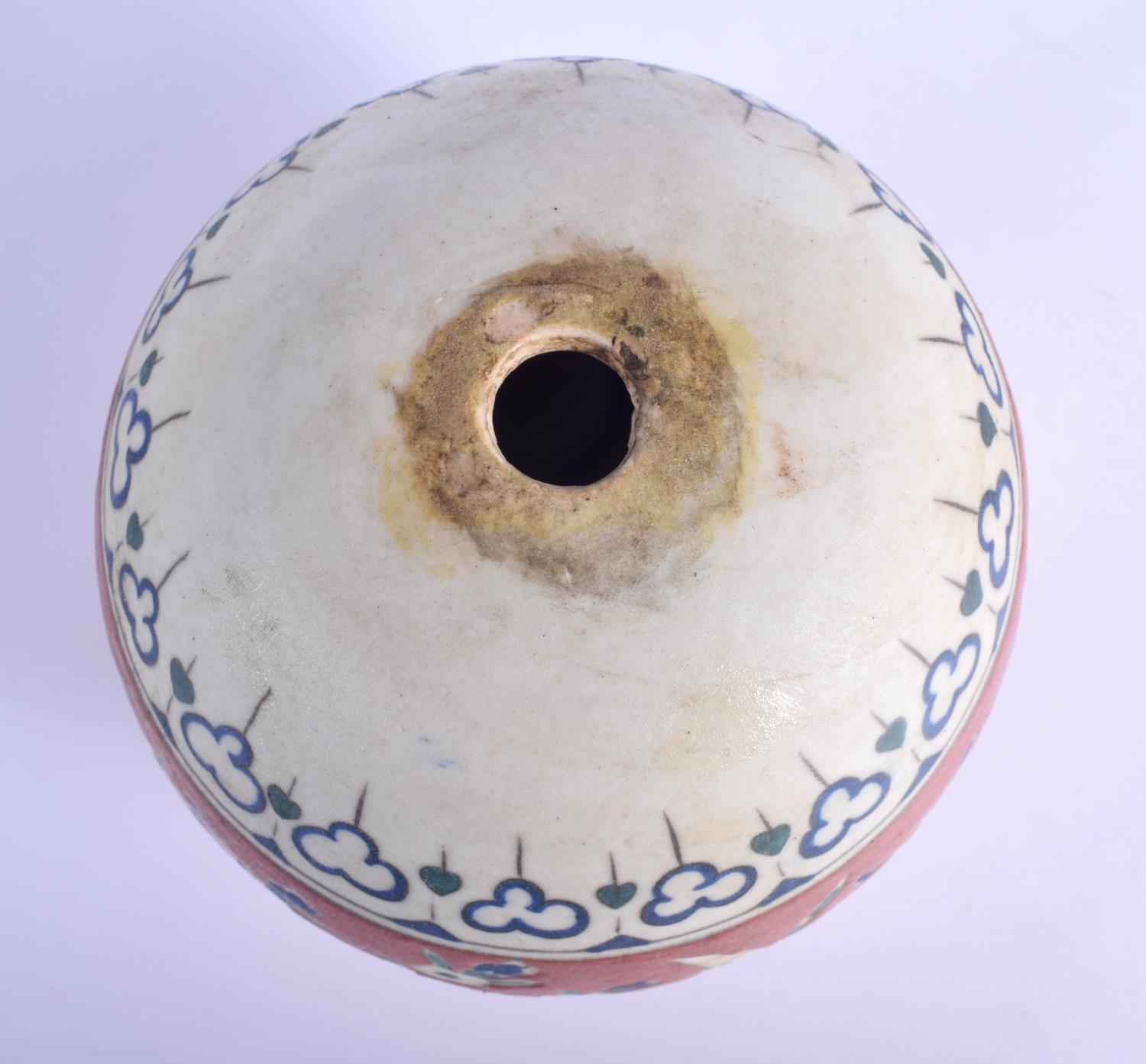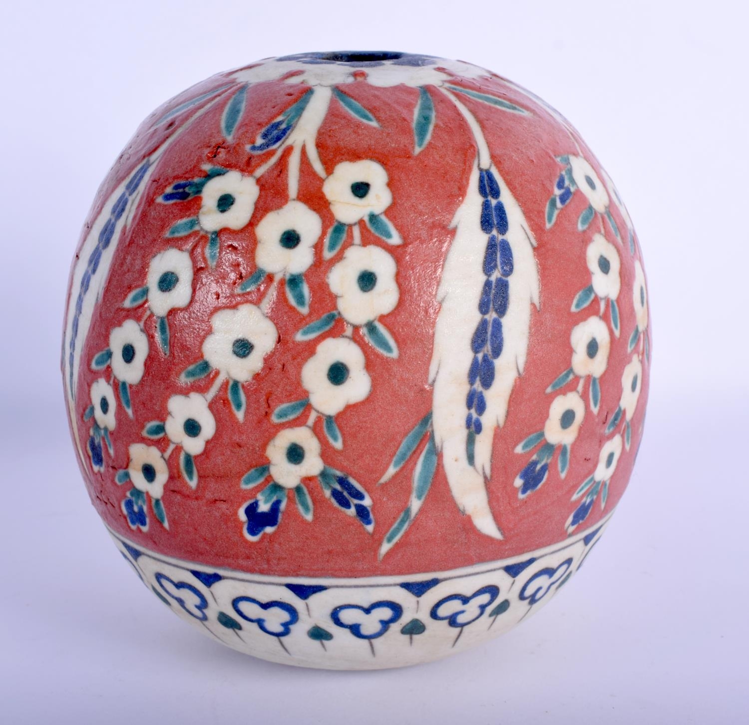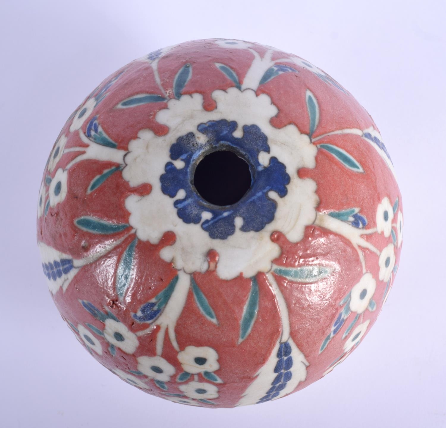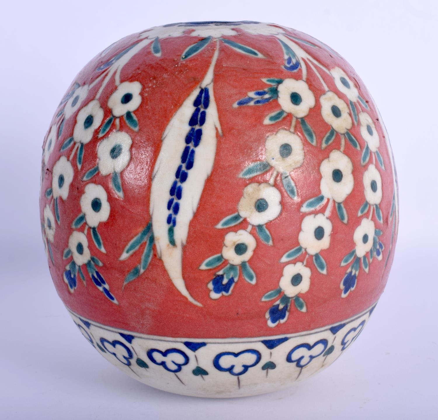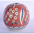 A TURKISH OTTOMAN KUTAHYA FAIENCE TYPE HANGING MOSQUE BALL painted with flowers. 15 cm x 11 cm.