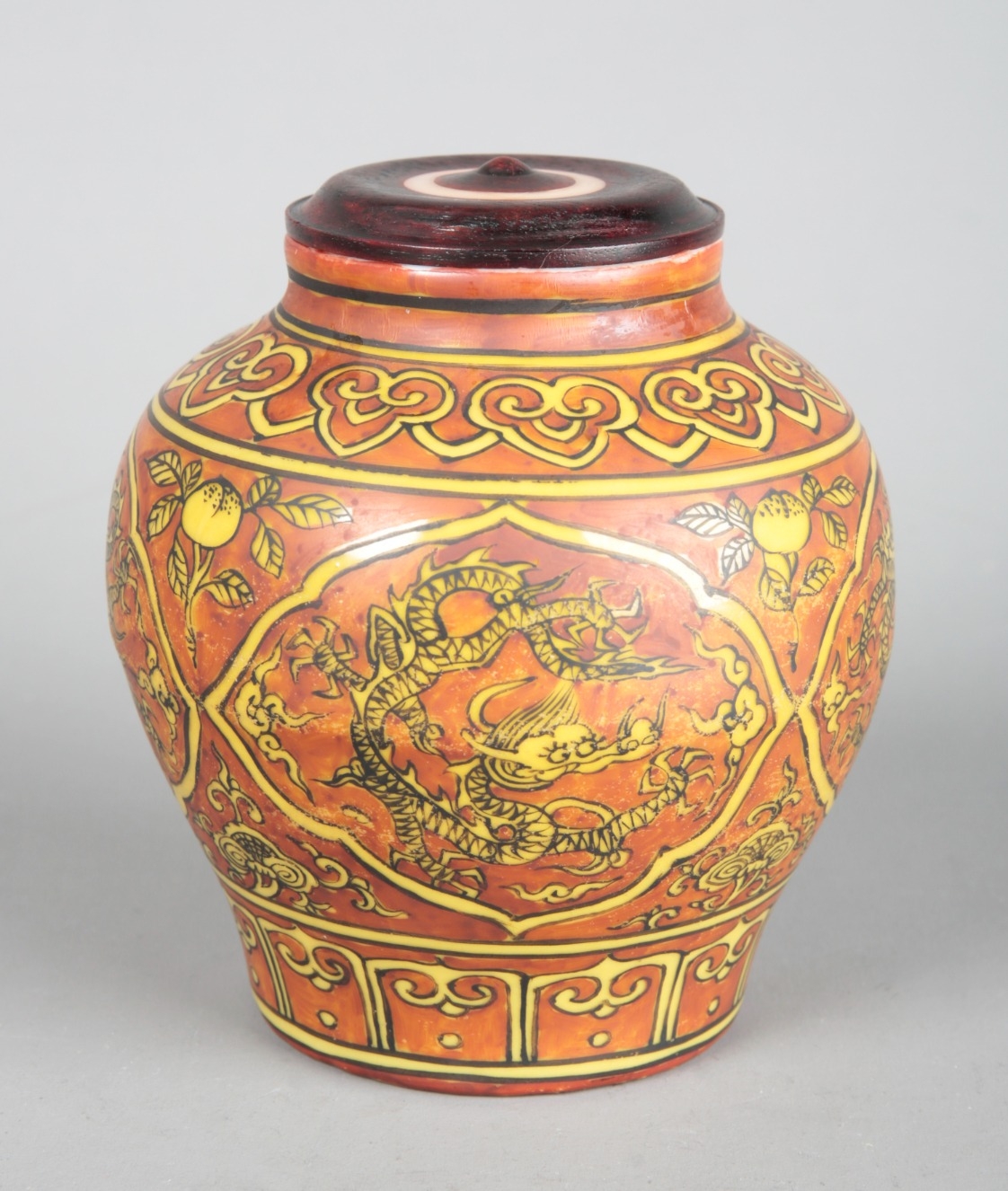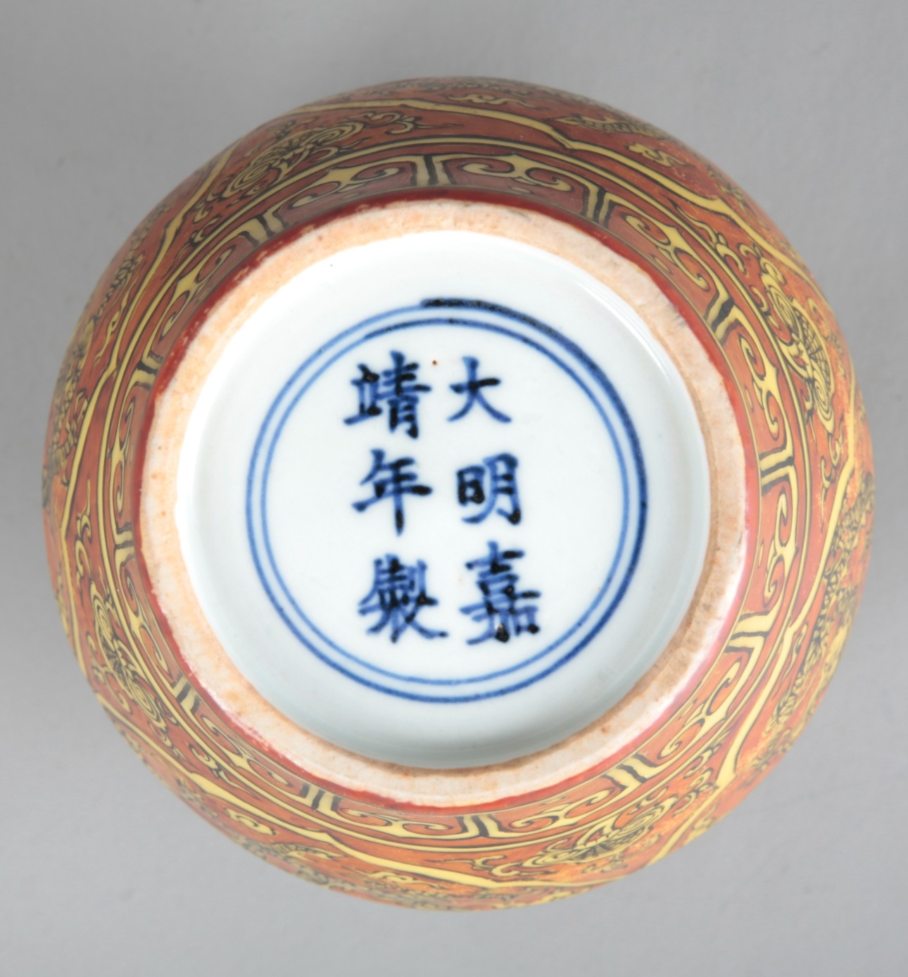 AN UNUSUAL CHINESE PORCELAIN YELLOW GROUND AND IRON RED DECORATED 'DRAGON' JAR