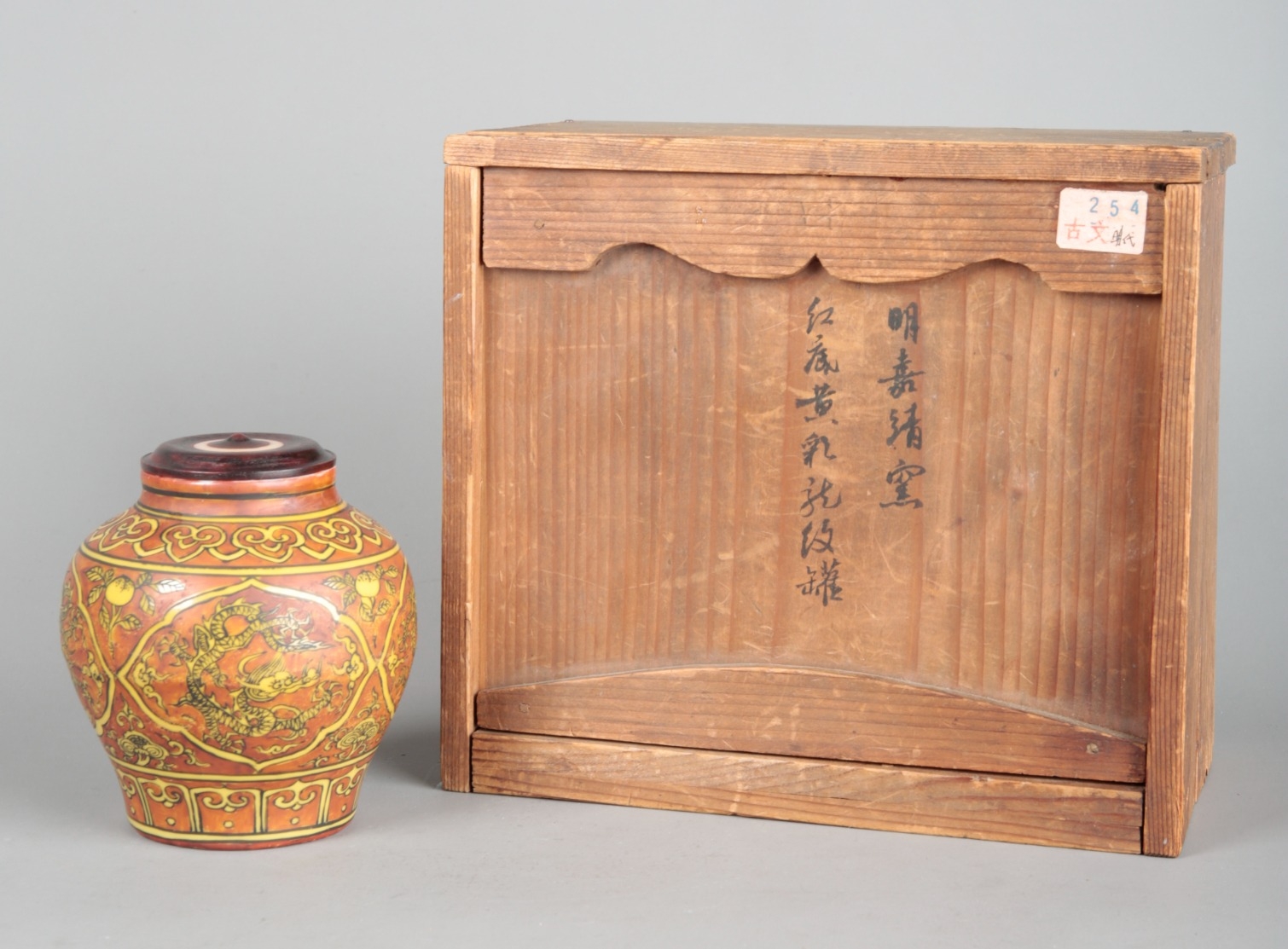 bearing a six character Jiajing mark to the base, decorated with four panels of dragons chasing pearls and bands of ruyi to the shoulder and base, with a turned wood cover, 10cm high x 9cm diameter, in a fitted wooden box