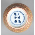 Note: This rare and unusual colour scheme is distinctive to the Jiajing period however the difficulty of the firing process has meant that there are few surviving examples. A comparable piece of a larger scale can be found in The British Museum, accession number 0719.48, and illustrated by Jessica Harrison-Hall in Ming Ceramics in the British Museum, London, 2001. Another can be seen in the Palace Museum Collection, Beijing, and is illustrated in Complete Collections of Treasures of the Palace Museum. Miscellaneous Enamelled Porcelain, Plain Tricoloured Porcelains.